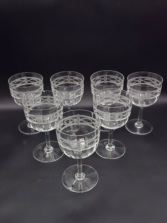 Antique Baccarat “Seme de Roses” Crystal Wine Glasses – Set of 7 Large 350ml Etched Rose Pattern Goblets c.1900 France