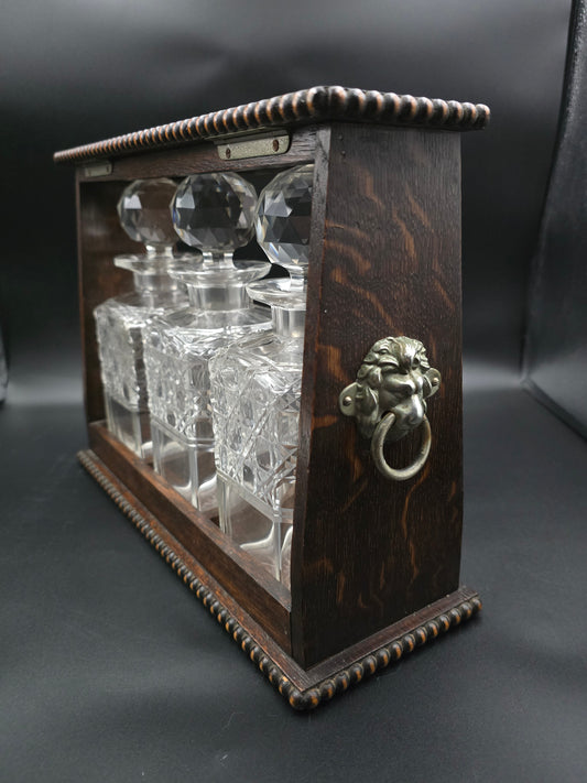 Antique Triple Decanter Tantalus Set with Lock & Key – Cut Crystal & Wooden Frame with Brass Lion Fittings – Excellent Condition
