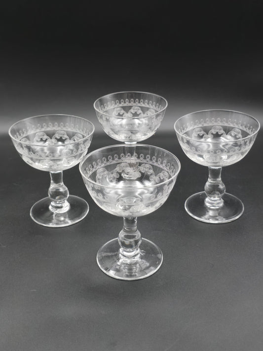 Set of 4 Edwardian Crystal Champagne Coupes – 200ml, Etched Swirl Design, Ball Stem, c.1900s