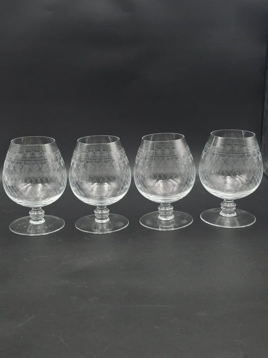 Set of 4 large, fine etched Crystal Brandy glasses. 13oz