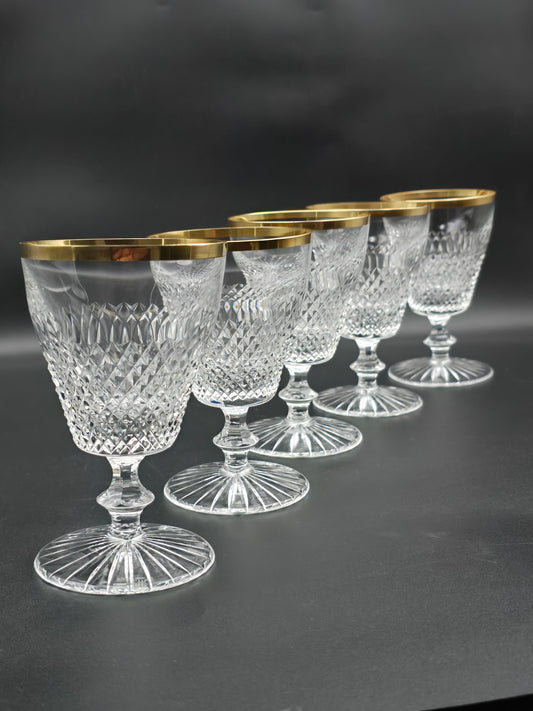 Set of 5 Beautiful Crystal wine Glasses with Gold coloured banding. 250ml. 13.5cm tall.