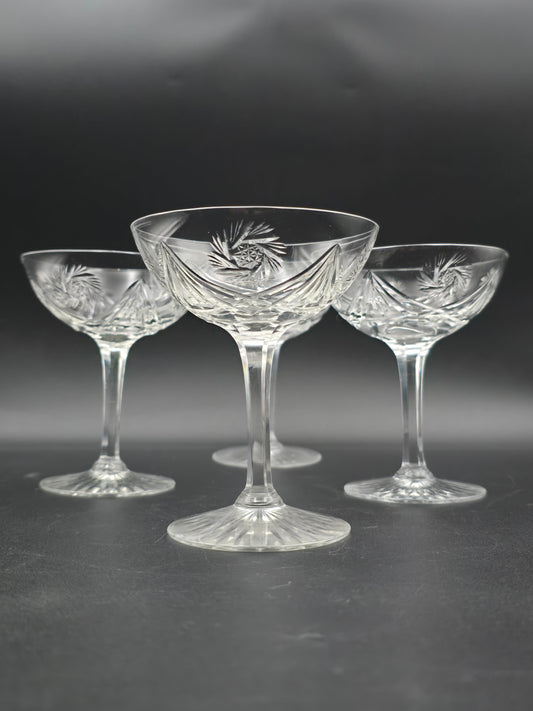 Vintage Hand-Cut Crystal Champagne Coupes – Set of 4 Elegant 165ml Coupe Glasses with Star Cut Base & Textured Stems, Art Deco Style