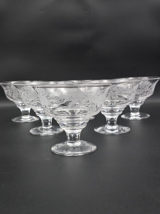 Set of 6 Crystal sundae or grapefruit bowls featuring floral etching