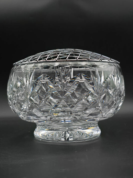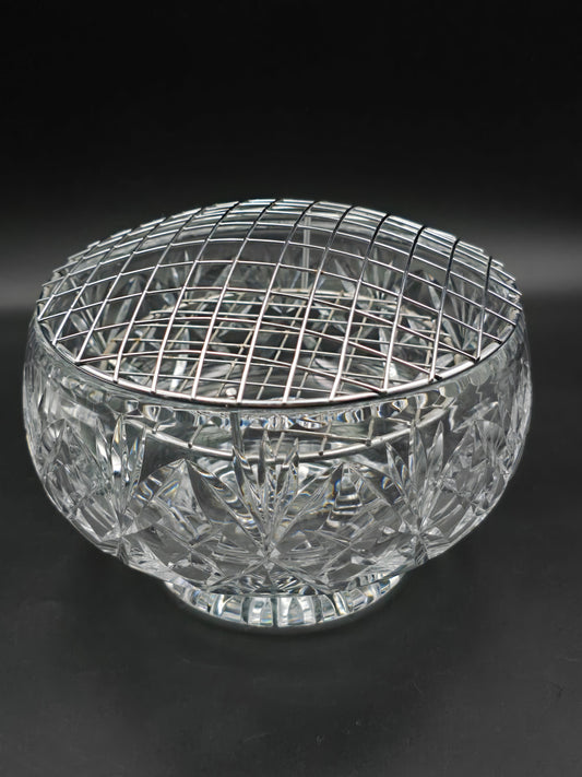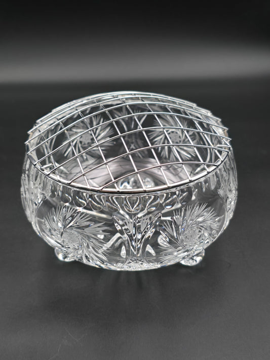 Vintage 5" Pinwheel Cut Crystal Rose Bowl with Silver Wire Mesh & Footed Base – Elegant Small Centrepiece
