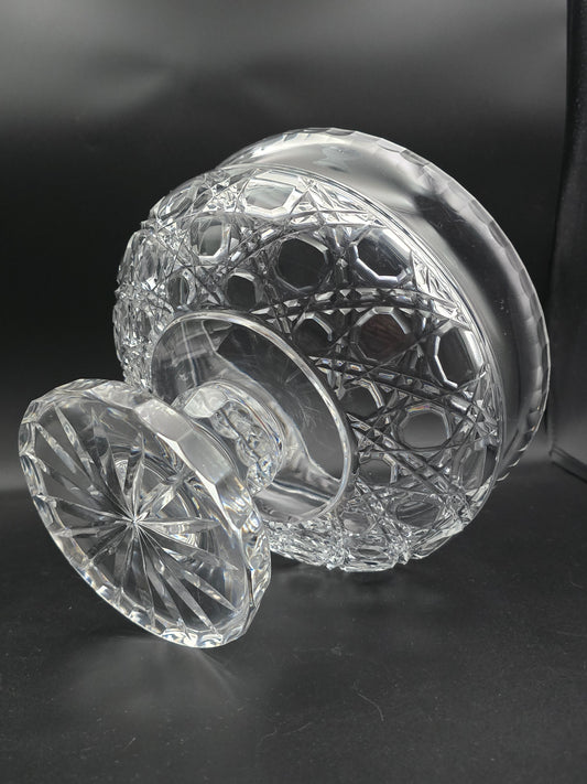 Large Vintage Bohemian/German Cut Crystal Footed Pedestal Bowl, 20 cm H × 26 cm W, Hobstar Star-Cross Pattern
