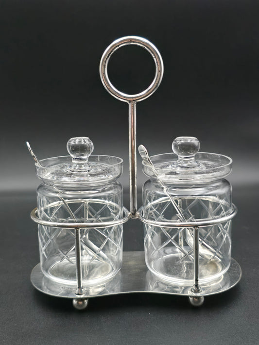 Edwardian Double Jam or Pickle Jar Set – EPNS Tray with Solid Silver Spoons (Birmingham 1907) – Antique Preserve Dish
