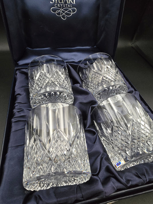 Boxed Set of 4 Stuart Crystal Hamilton Pattern Tumblers – 8 oz Heavy-Base Cut Crystal – England c. 1930s–50s