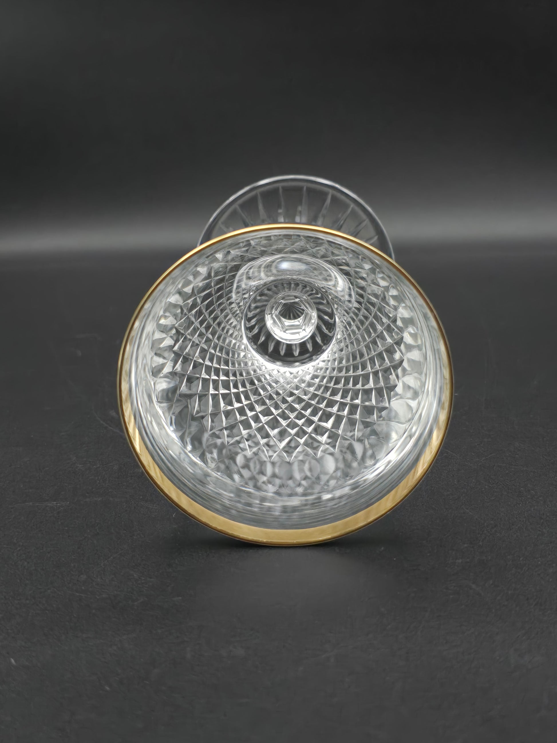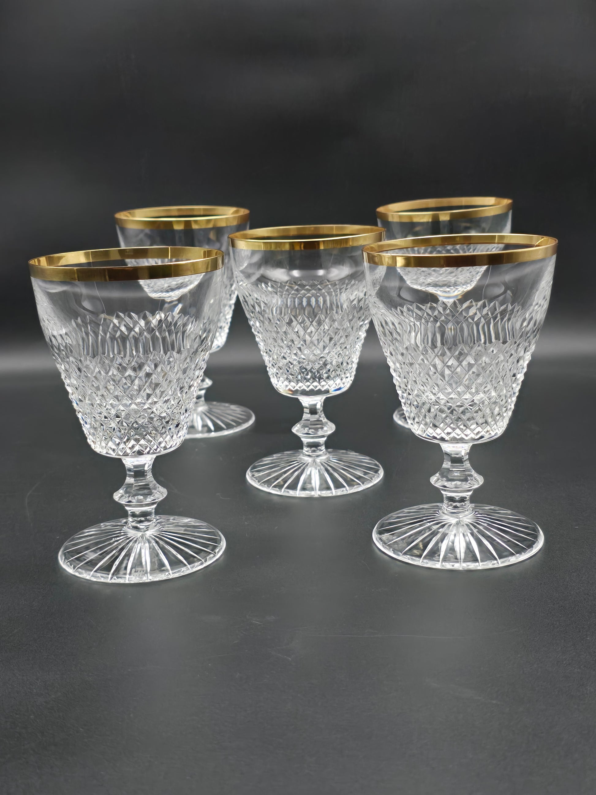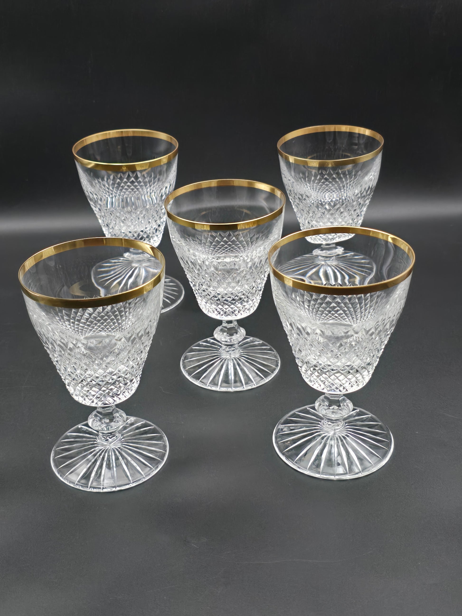 Expertly crafted, this set of 5 wine glasses features elegant gold banding detail and a bevelled knopped stem with a crosses cut pattern and a star cut base.