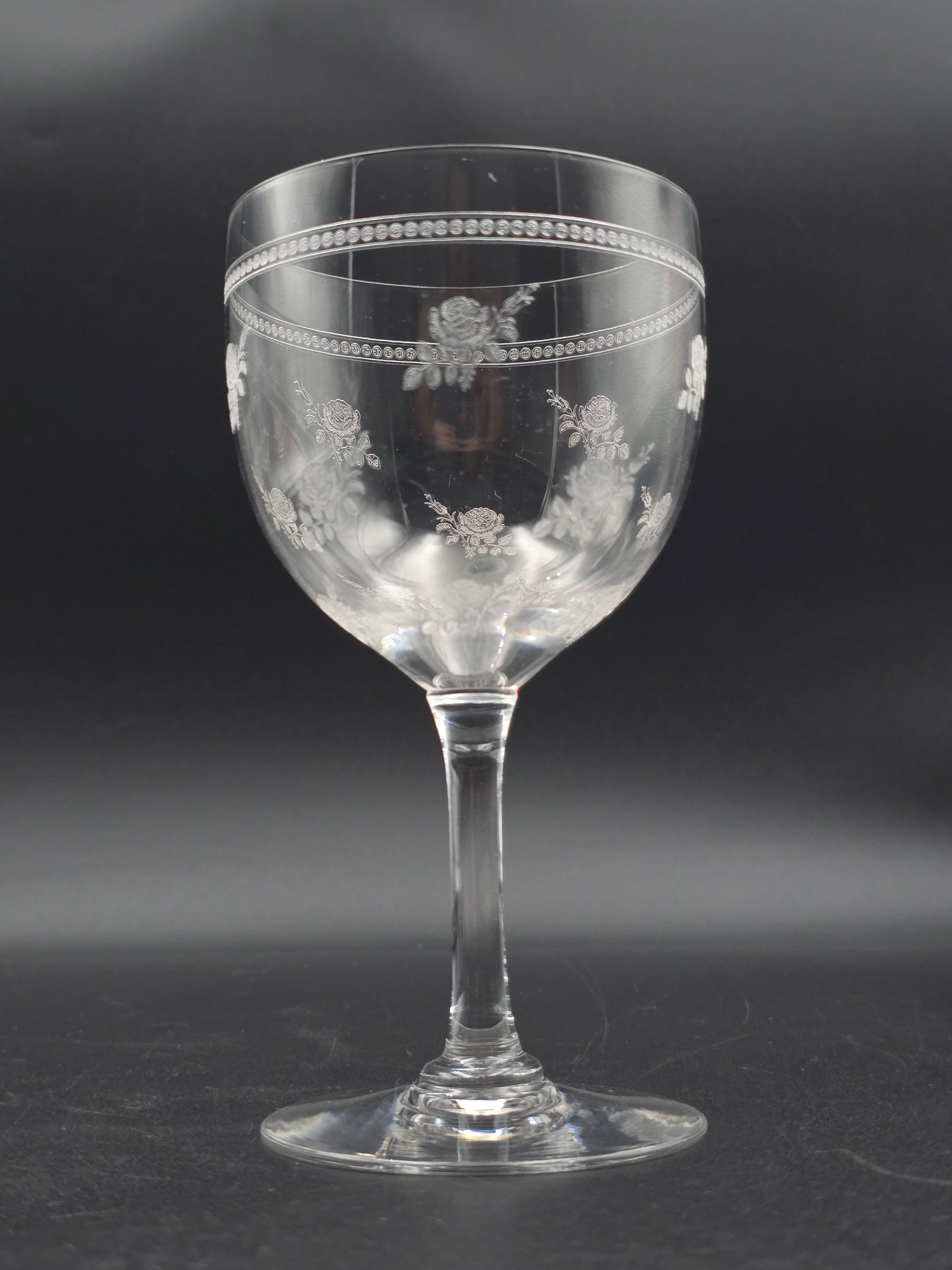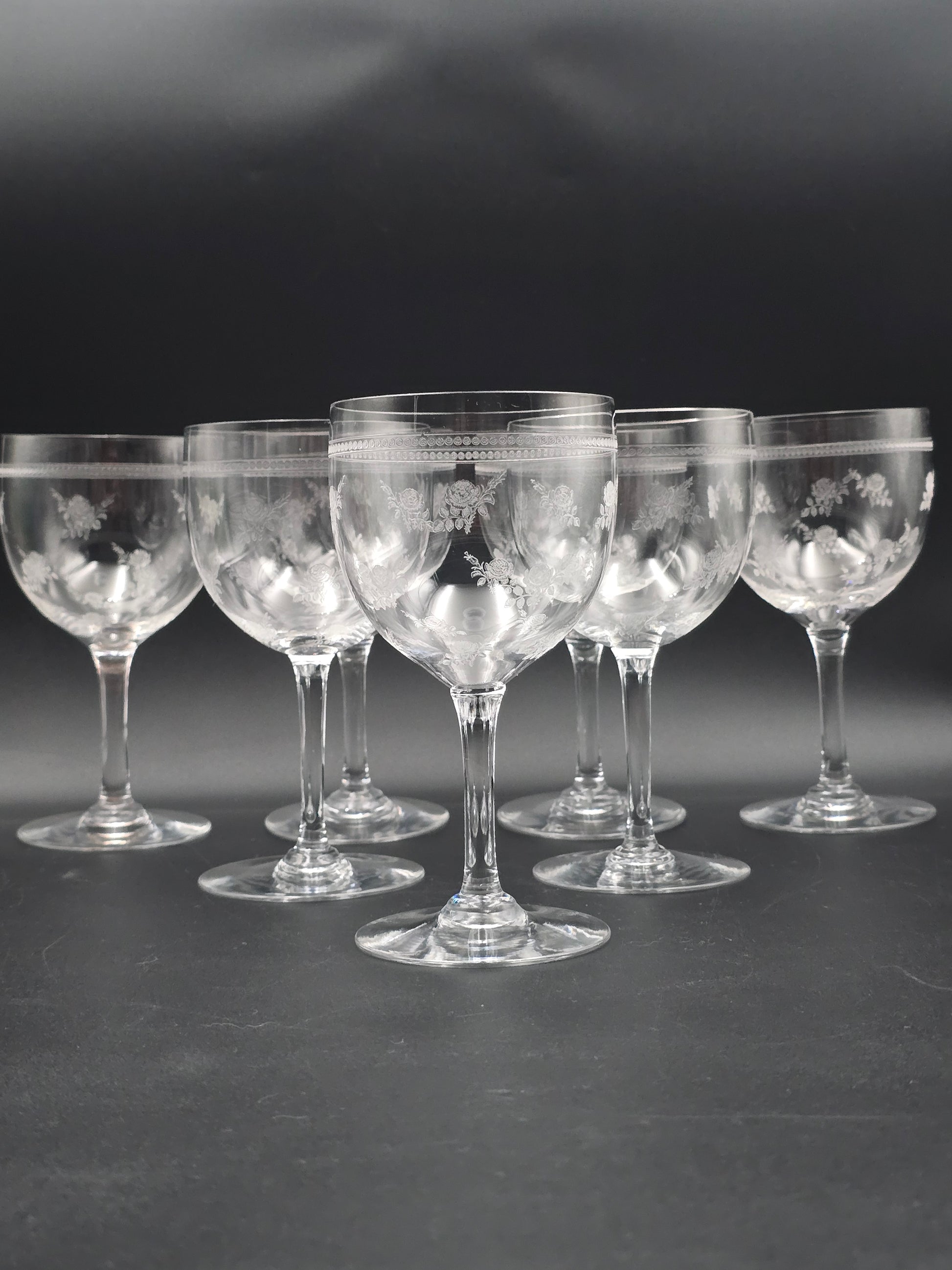 Antique Baccarat “Seme de Roses” Crystal Wine Glasses – Set of 7 Large 350ml Etched Rose Pattern Goblets c.1900 France