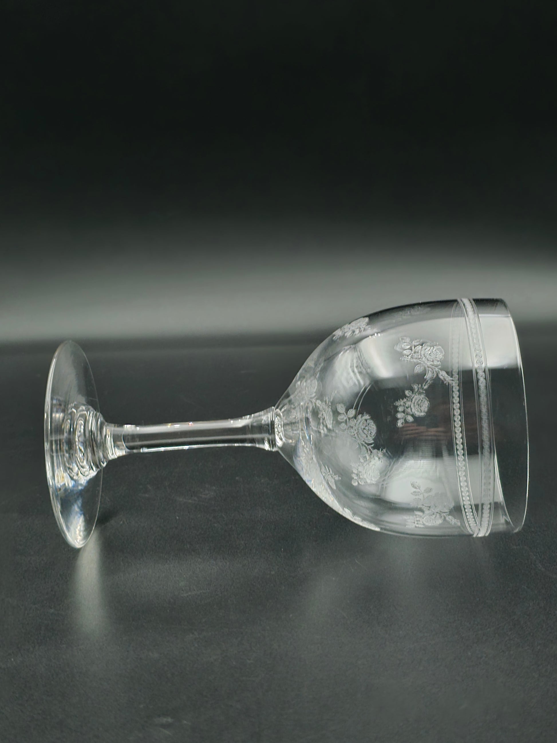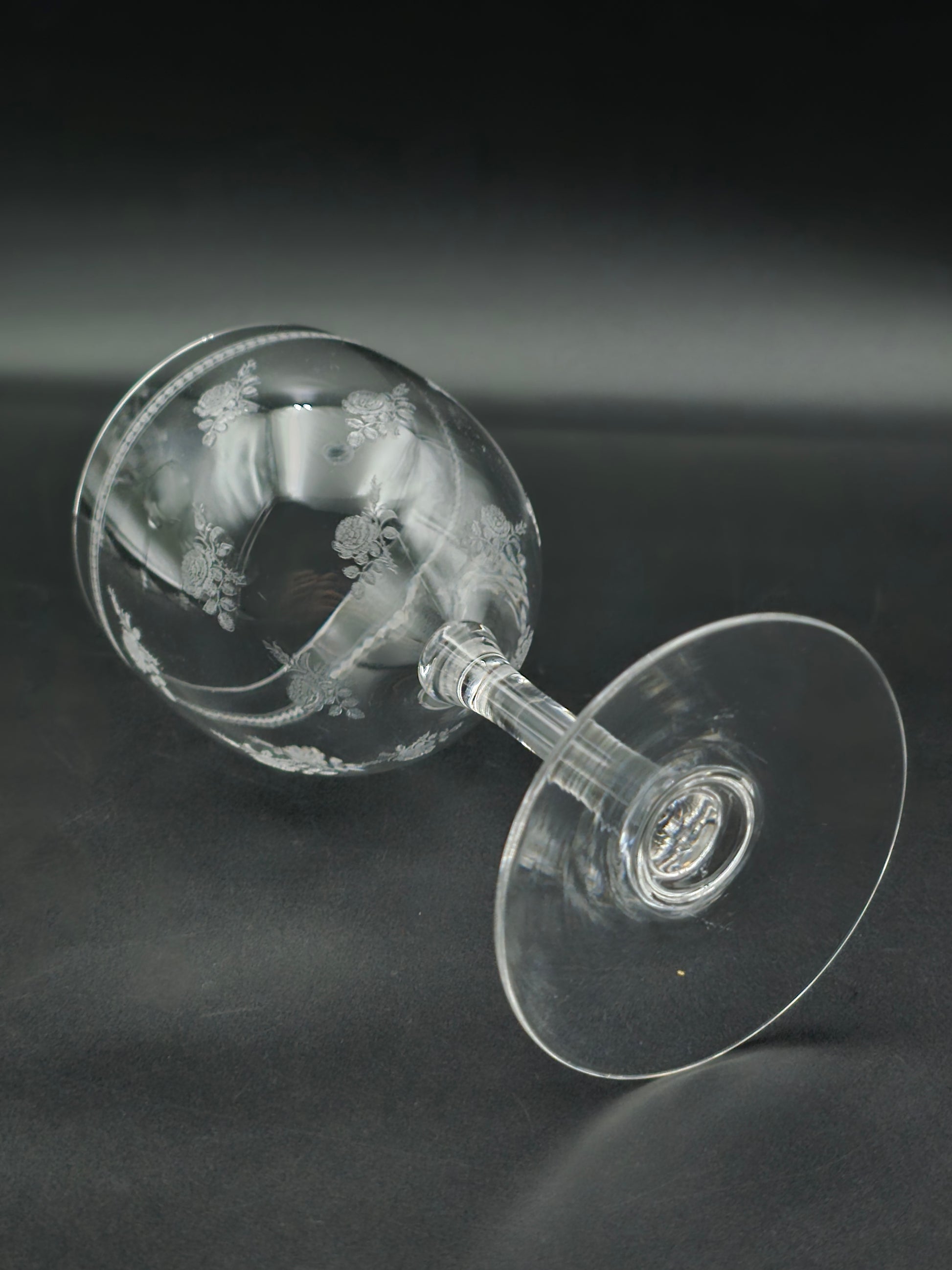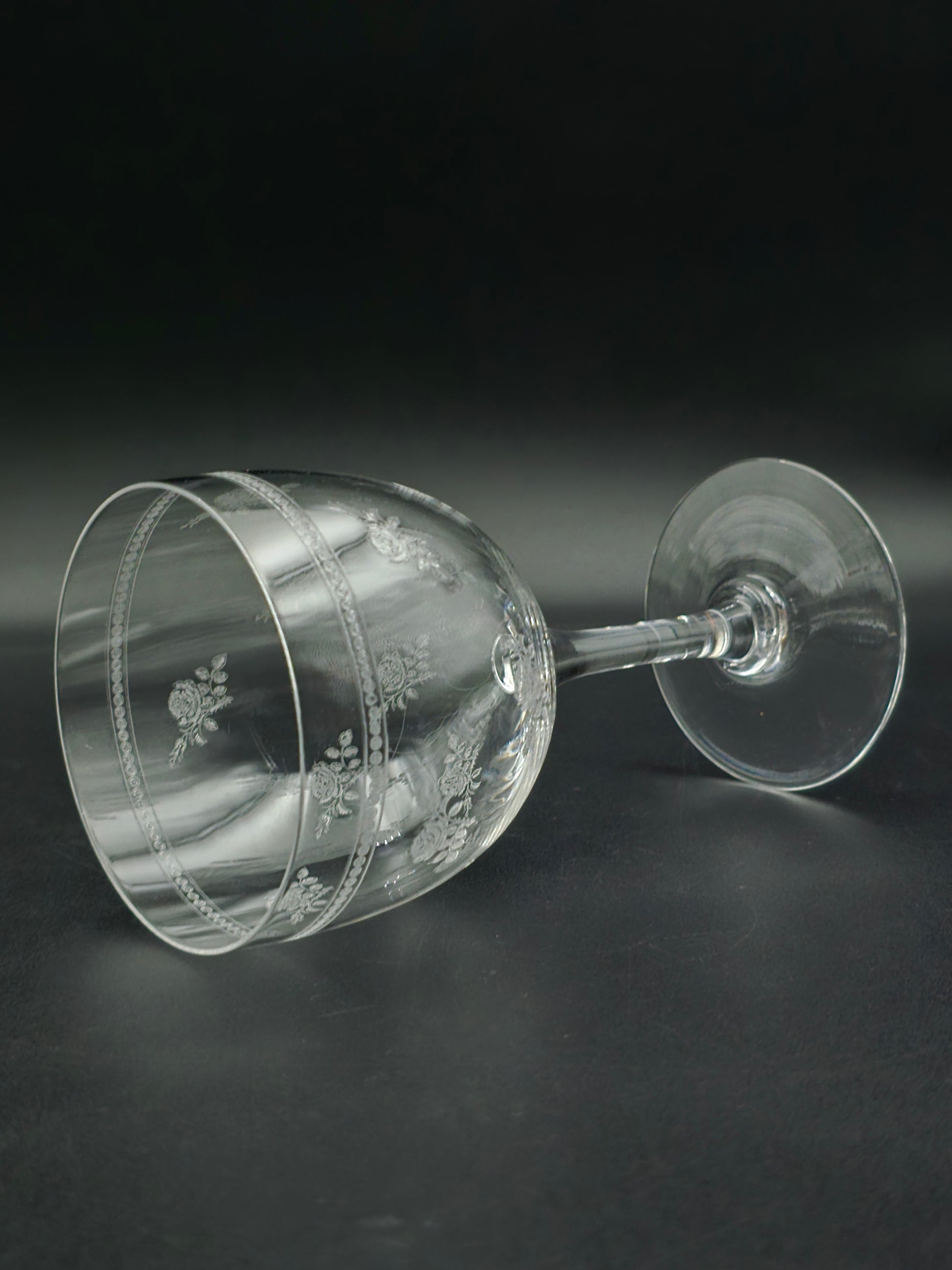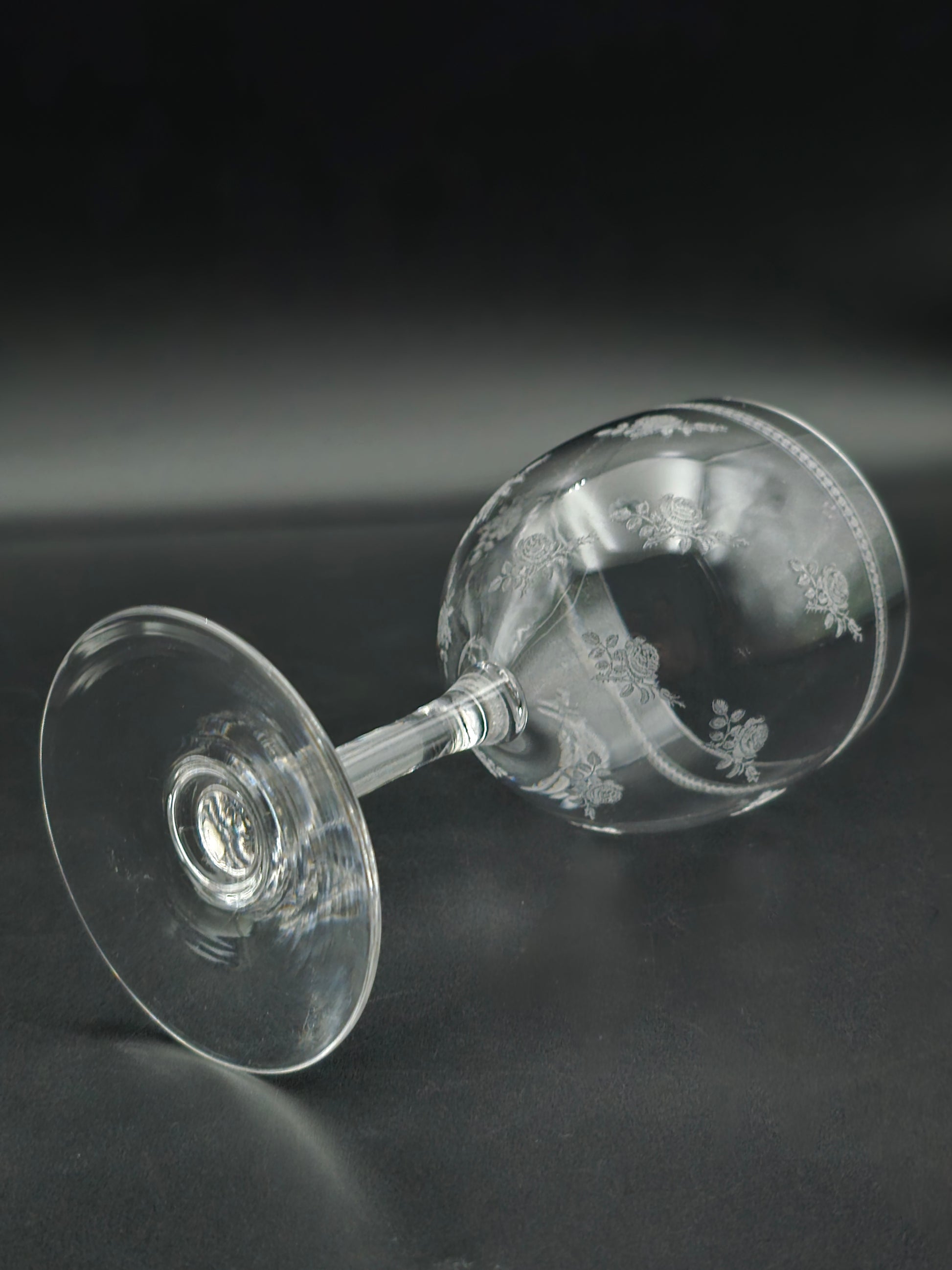 Dating to around 1900–1916, these exquisite goblets are finely acid-etched with delicate roses encircling each bowl—a testament to Baccarat’s master craftsmanship at the turn of the 20th century.