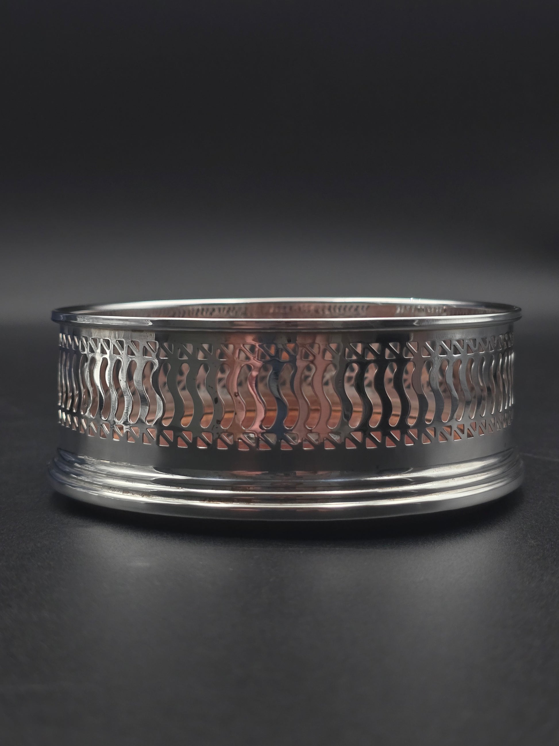 A superb antique solid sterling silver wine bottle or champagne coaster by renowned silversmiths Barker Brothers (B&Co), fully hallmarked Birmingham, 1921.