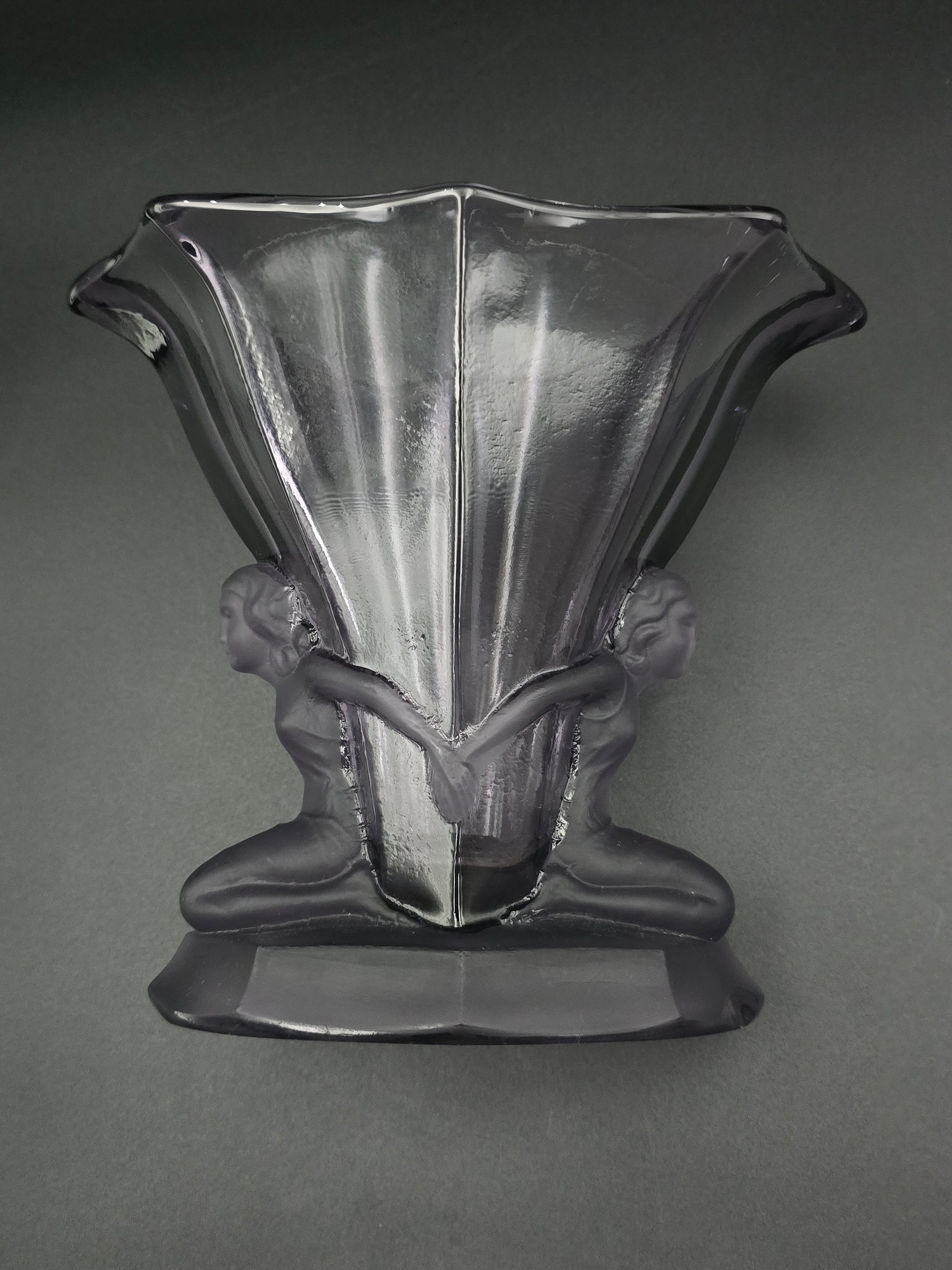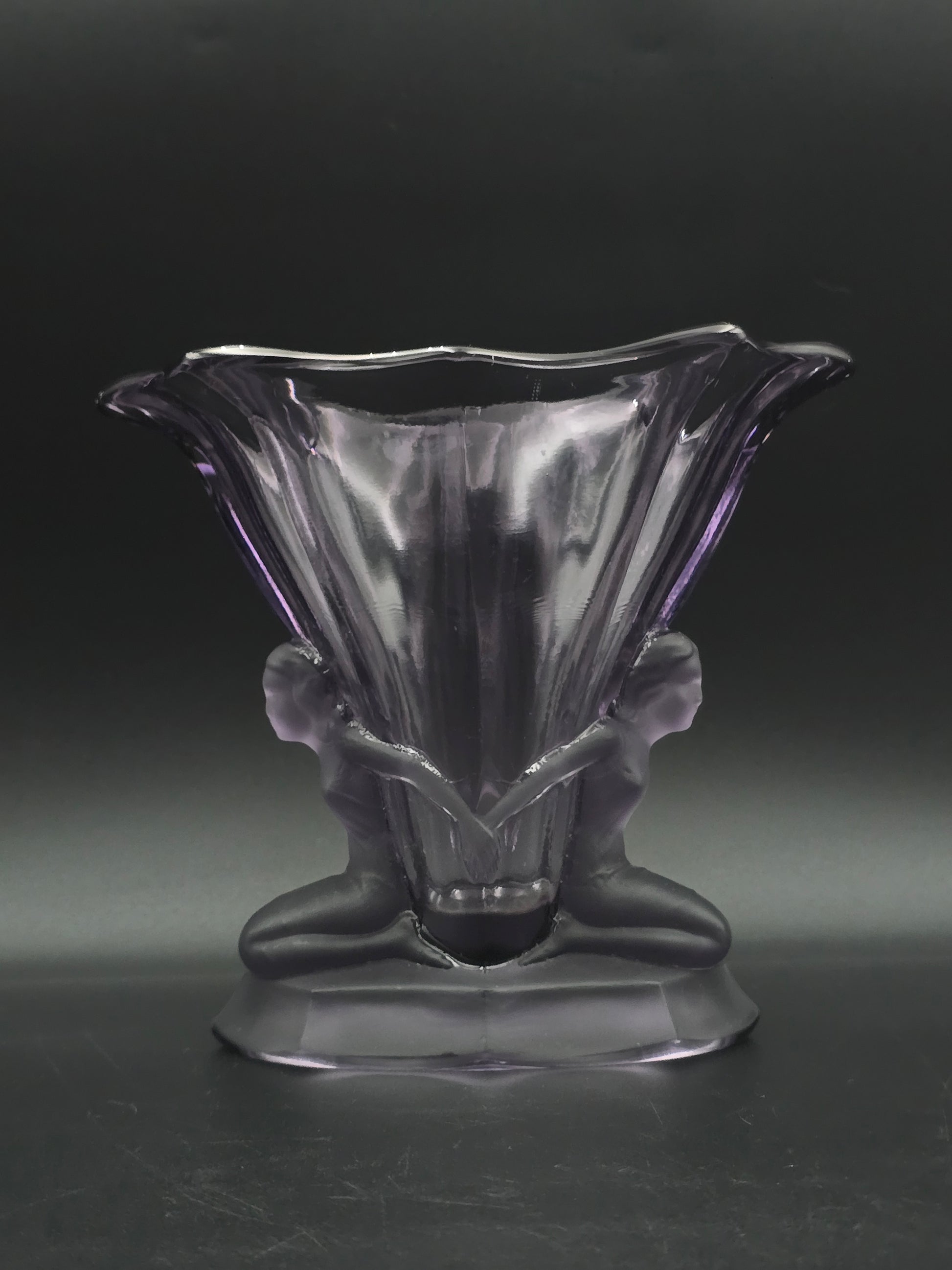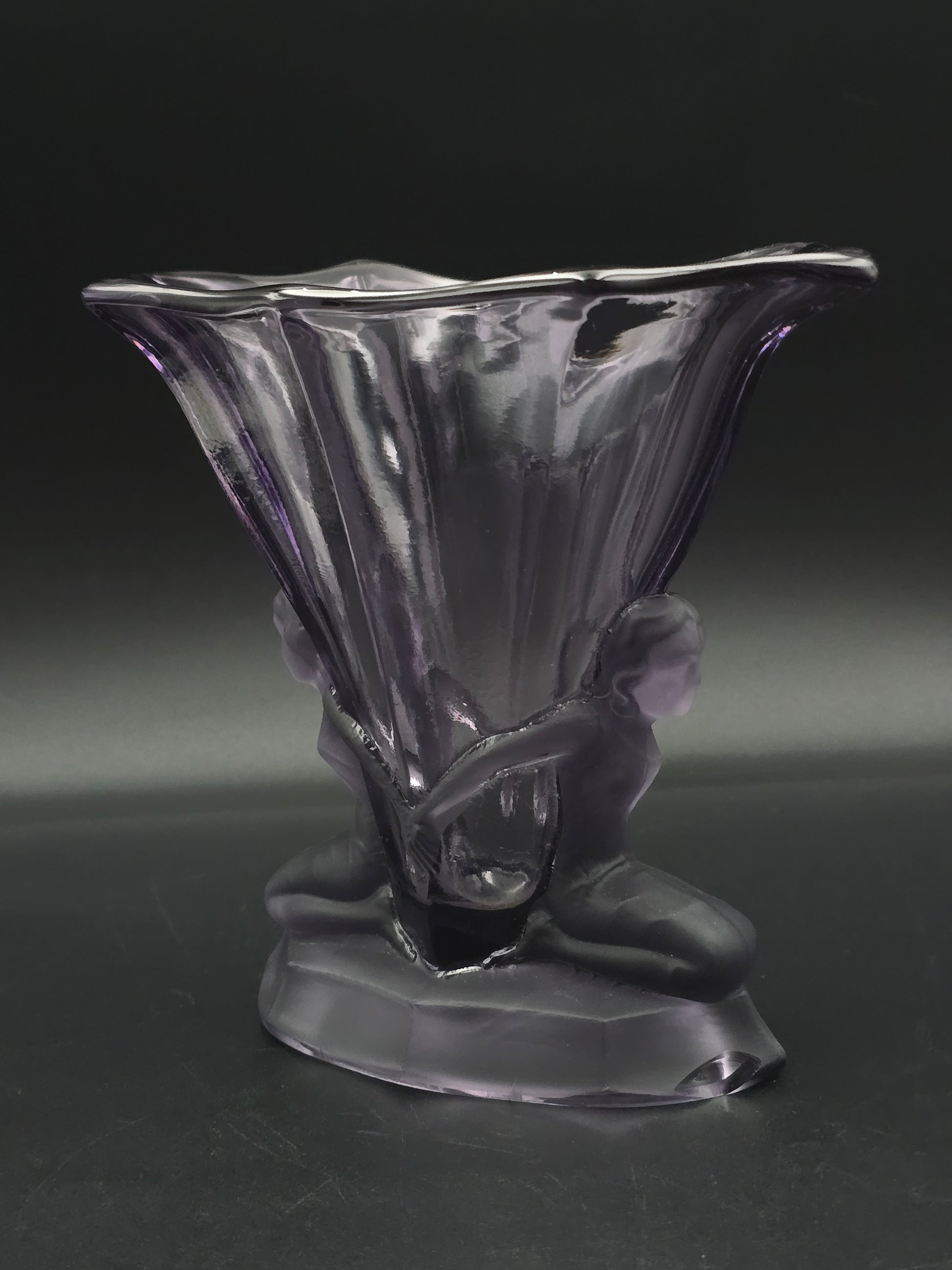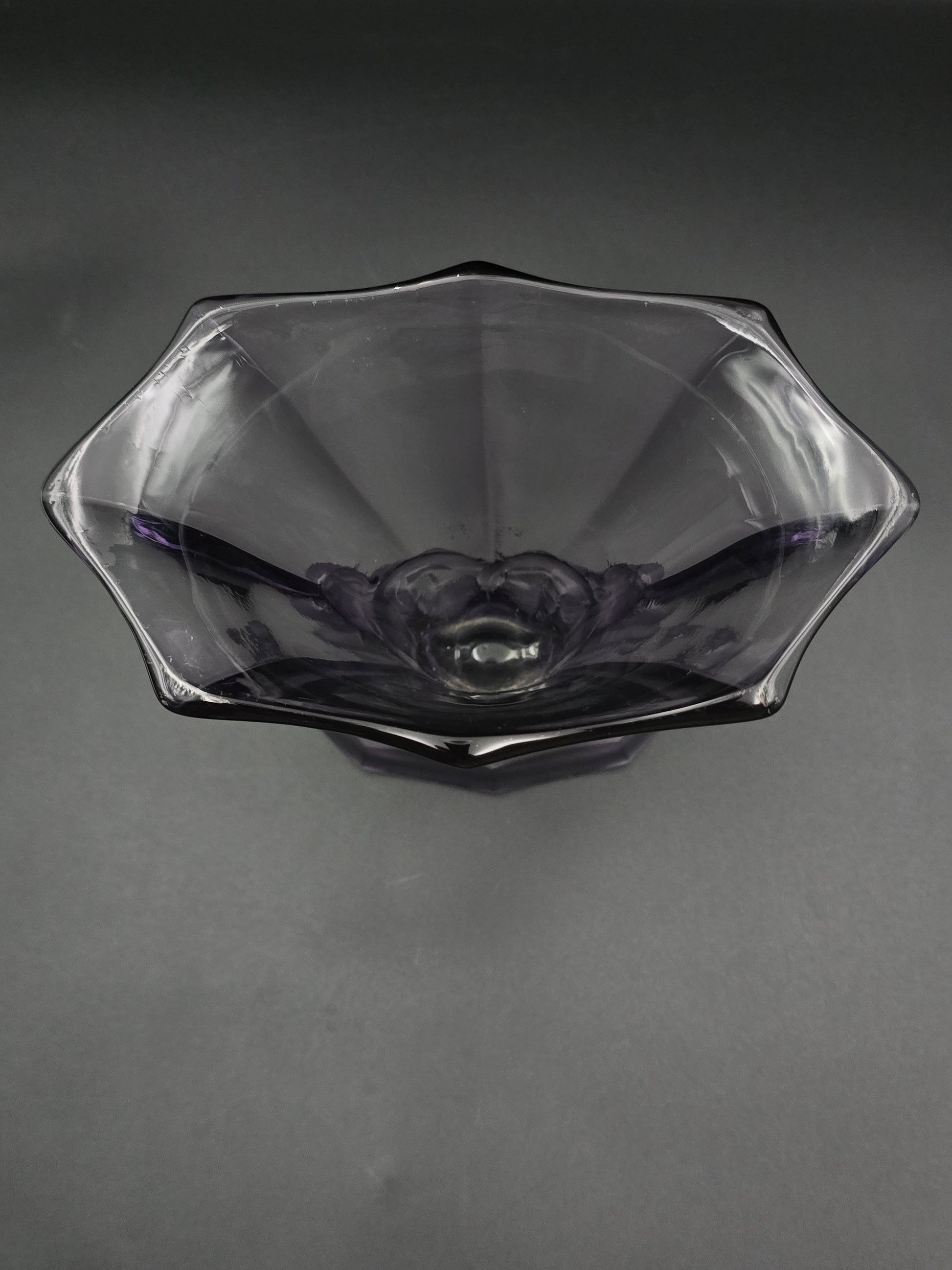 Measuring approximately 16.5 cm tall and 18.5 cm wide, its mauve, frosted-pressed glass and subtly rippled relief design echo the refined elegance of early 20th-century European decorative arts.