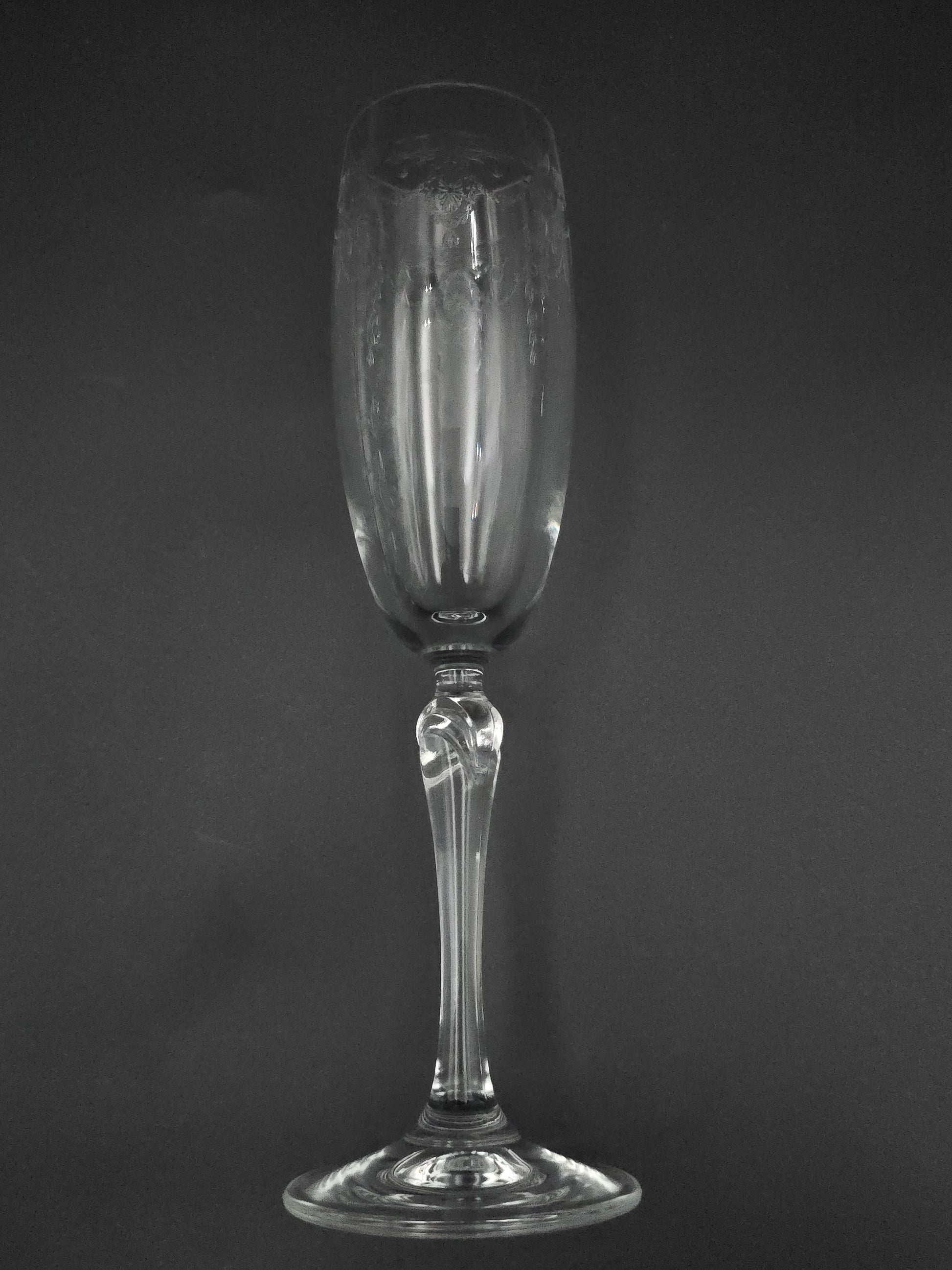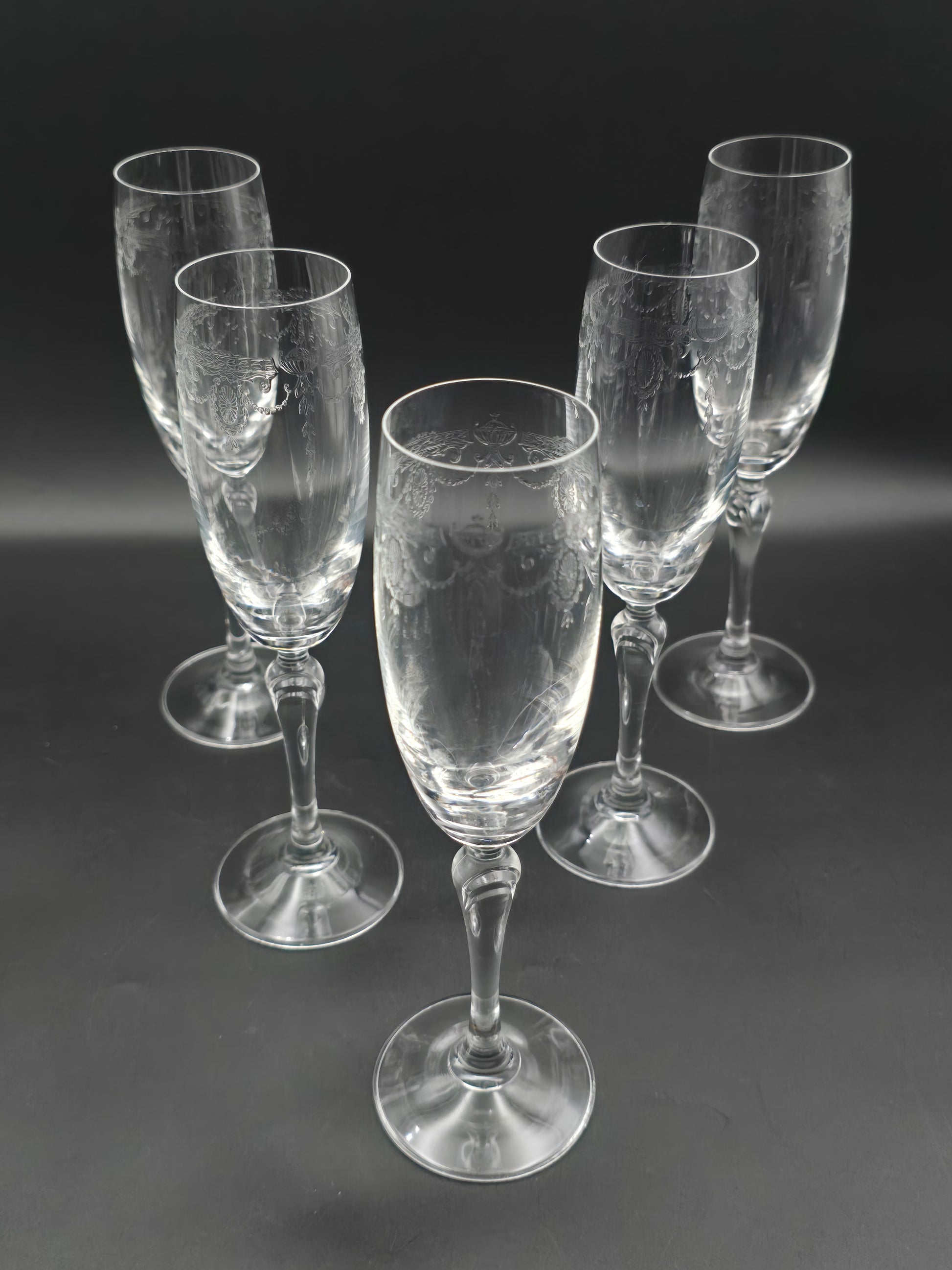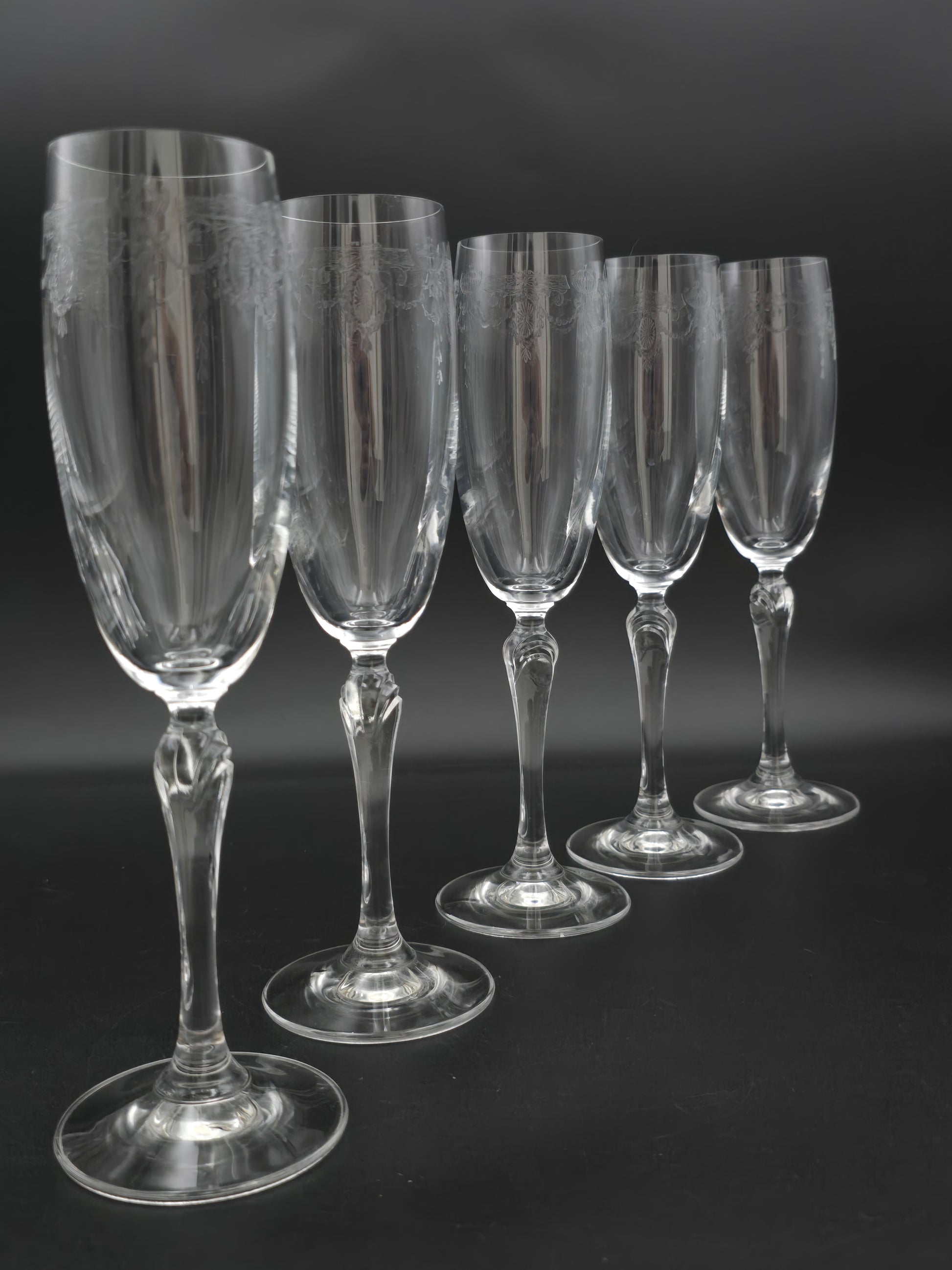 Beautiful Set of 5 Etched Crystal Champagne flutes 175ml. 22cm tall.