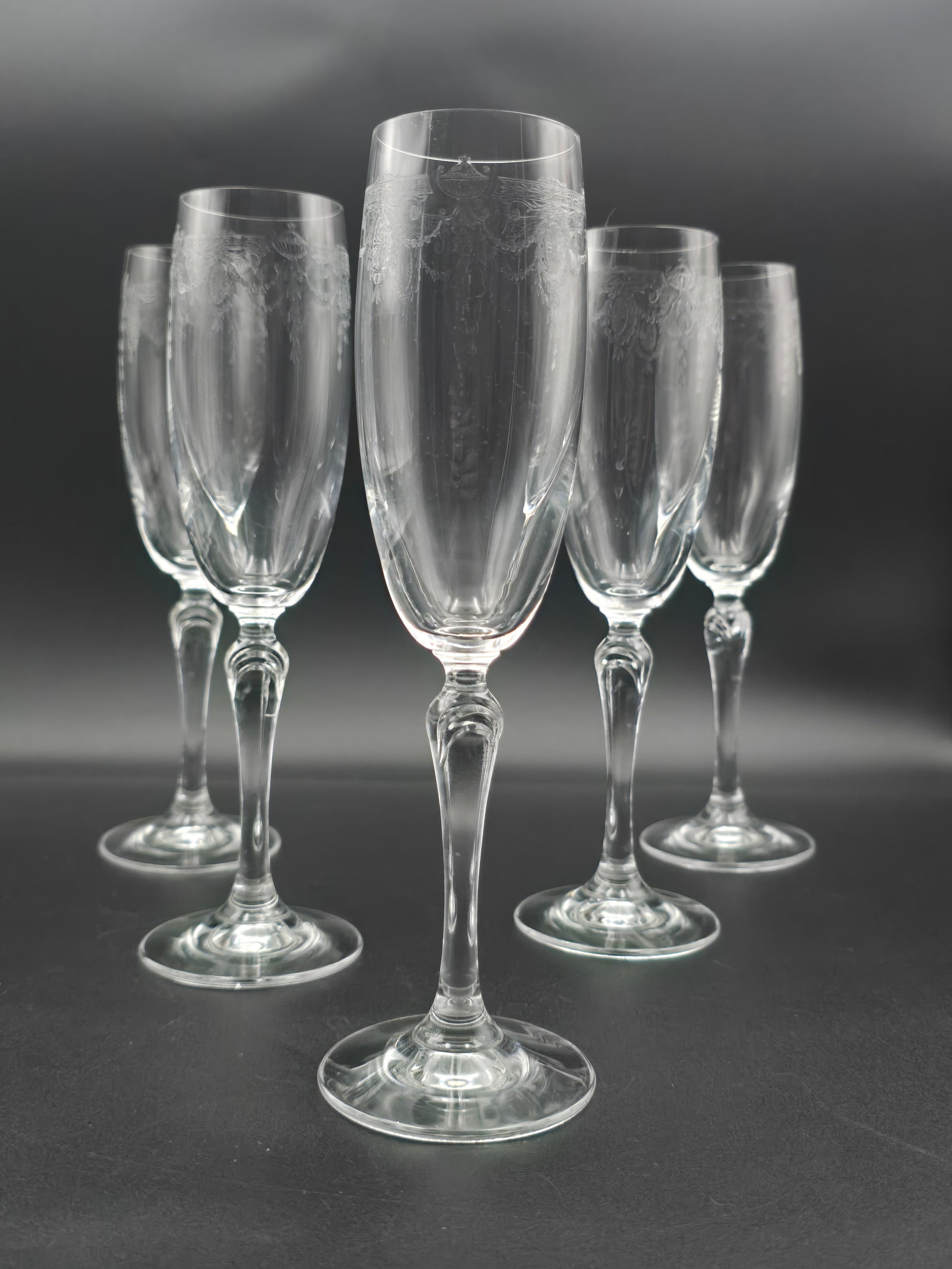 Expertly crafted in Czechoslovakia, this set of 5 etched crystal champagne flutes brings elegance to any occasion.