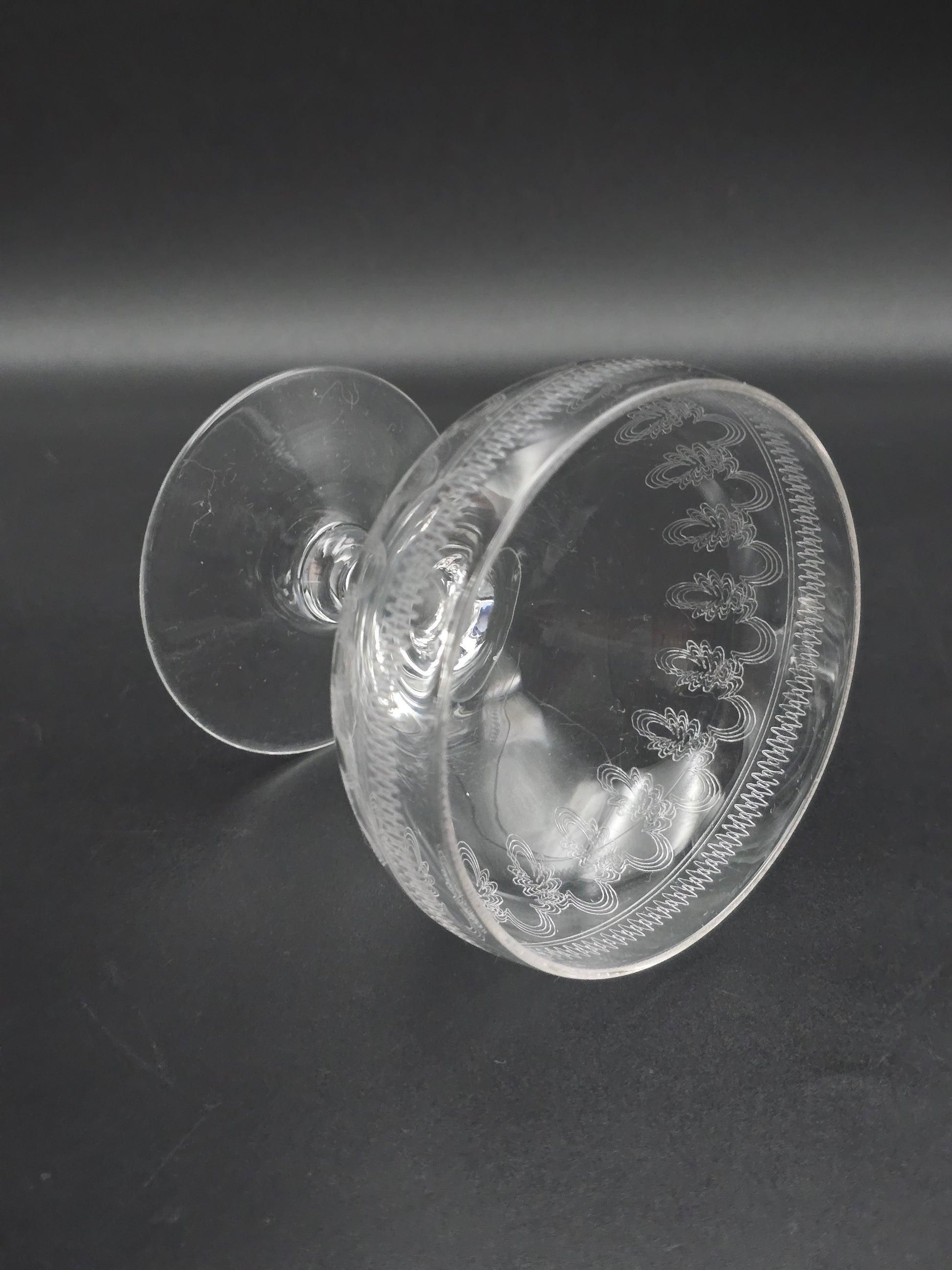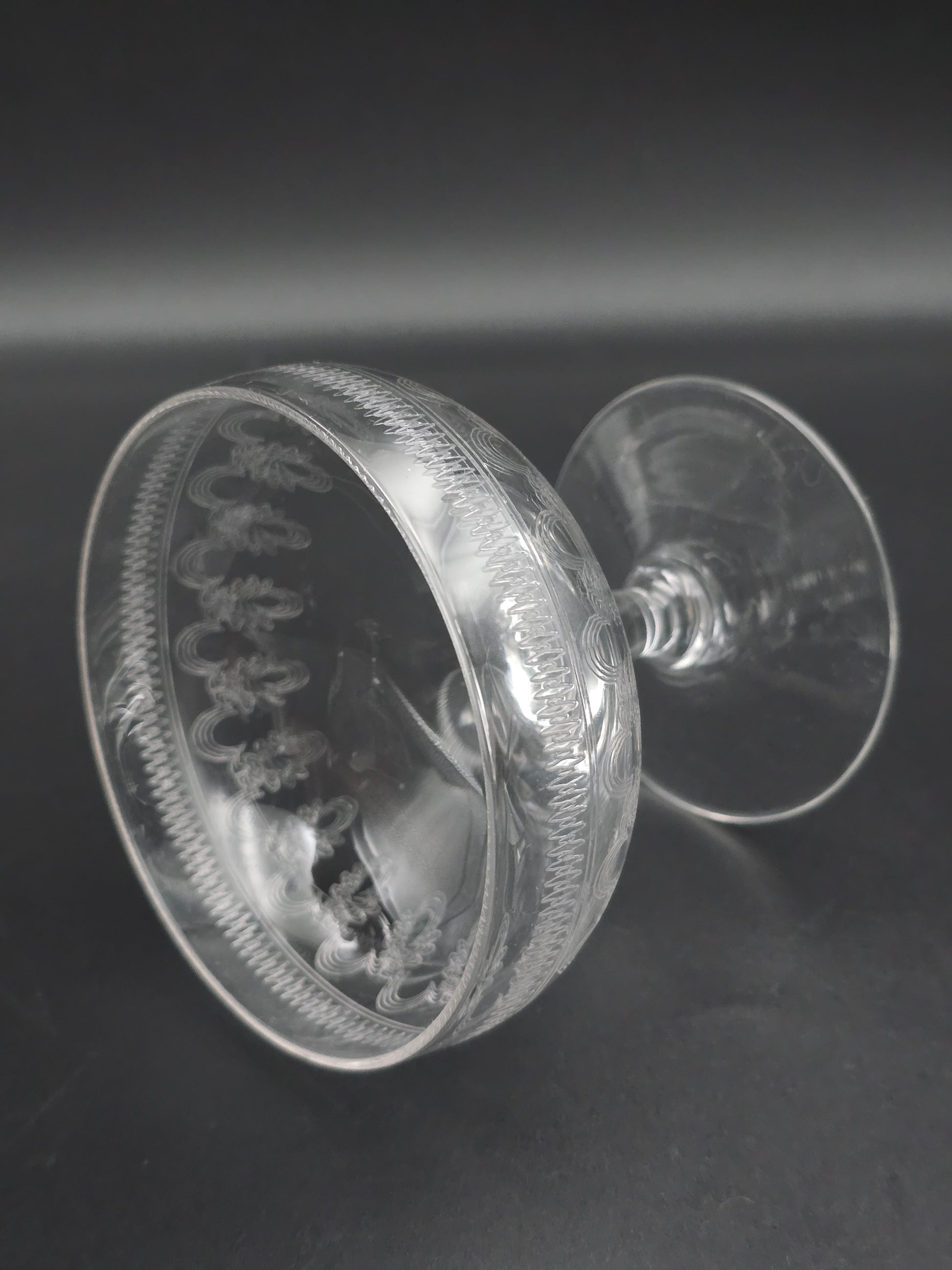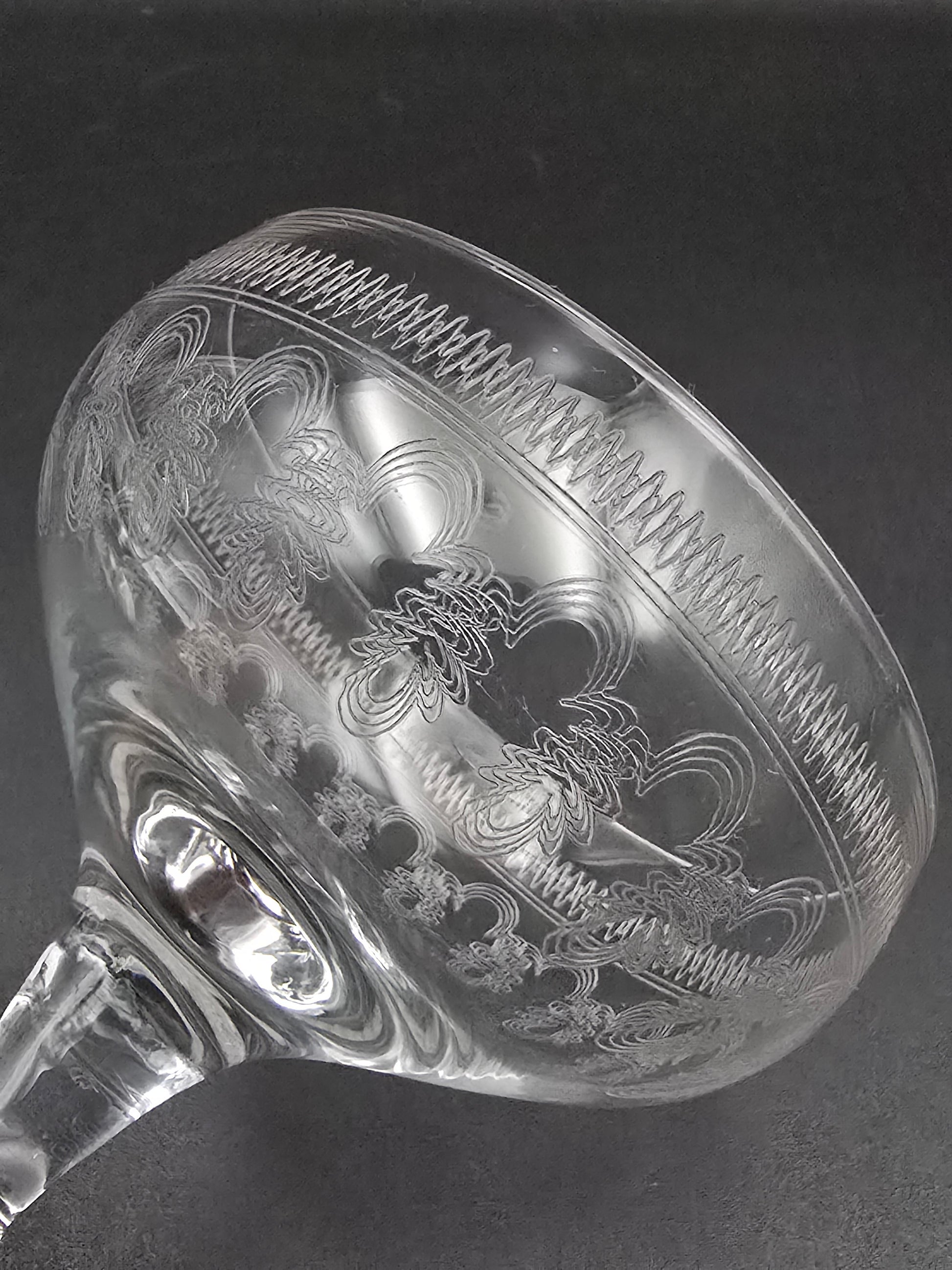 Each coupe features a delicate etched trellis and floral design, held by a sturdy short stem and plain base.