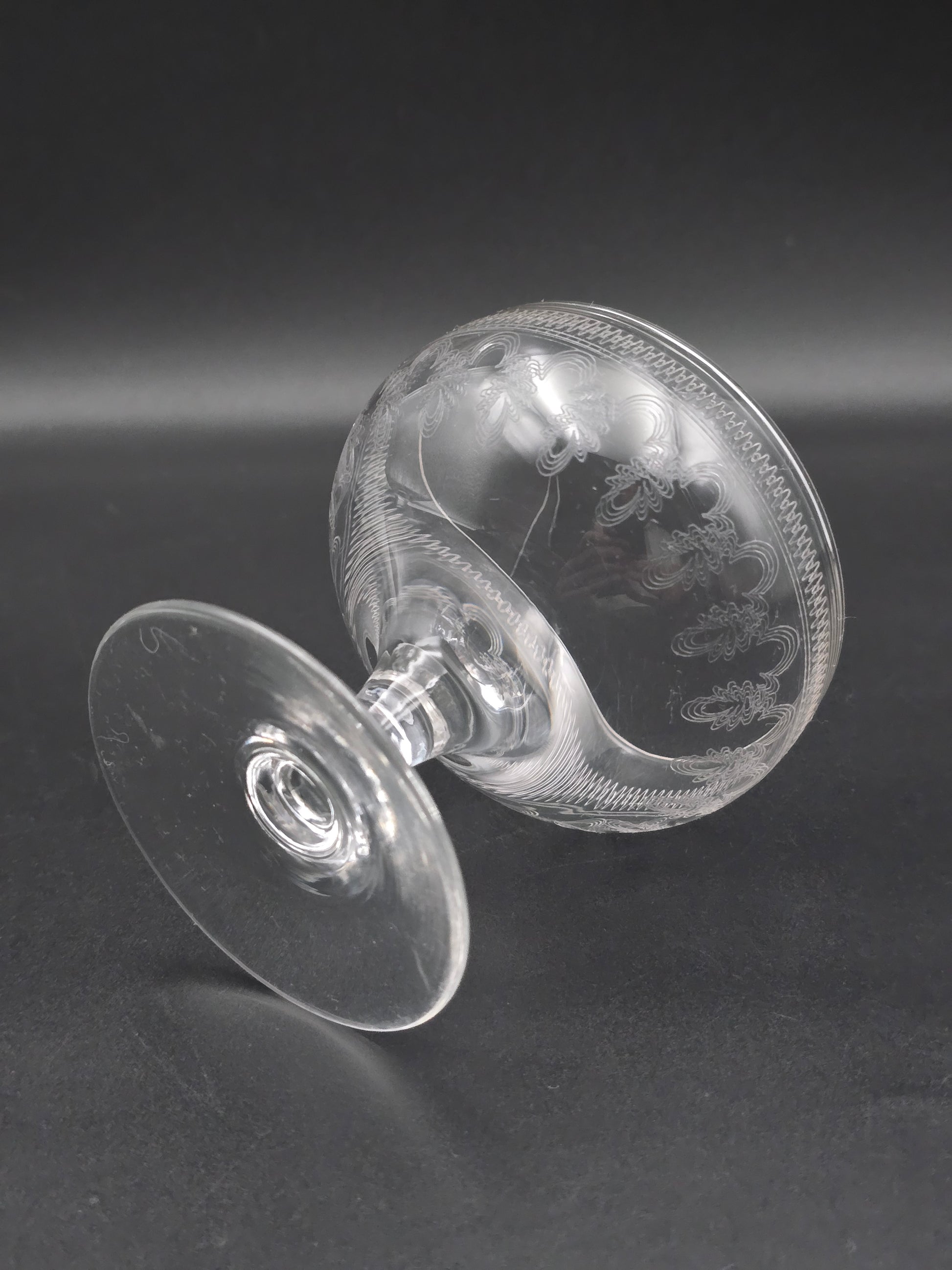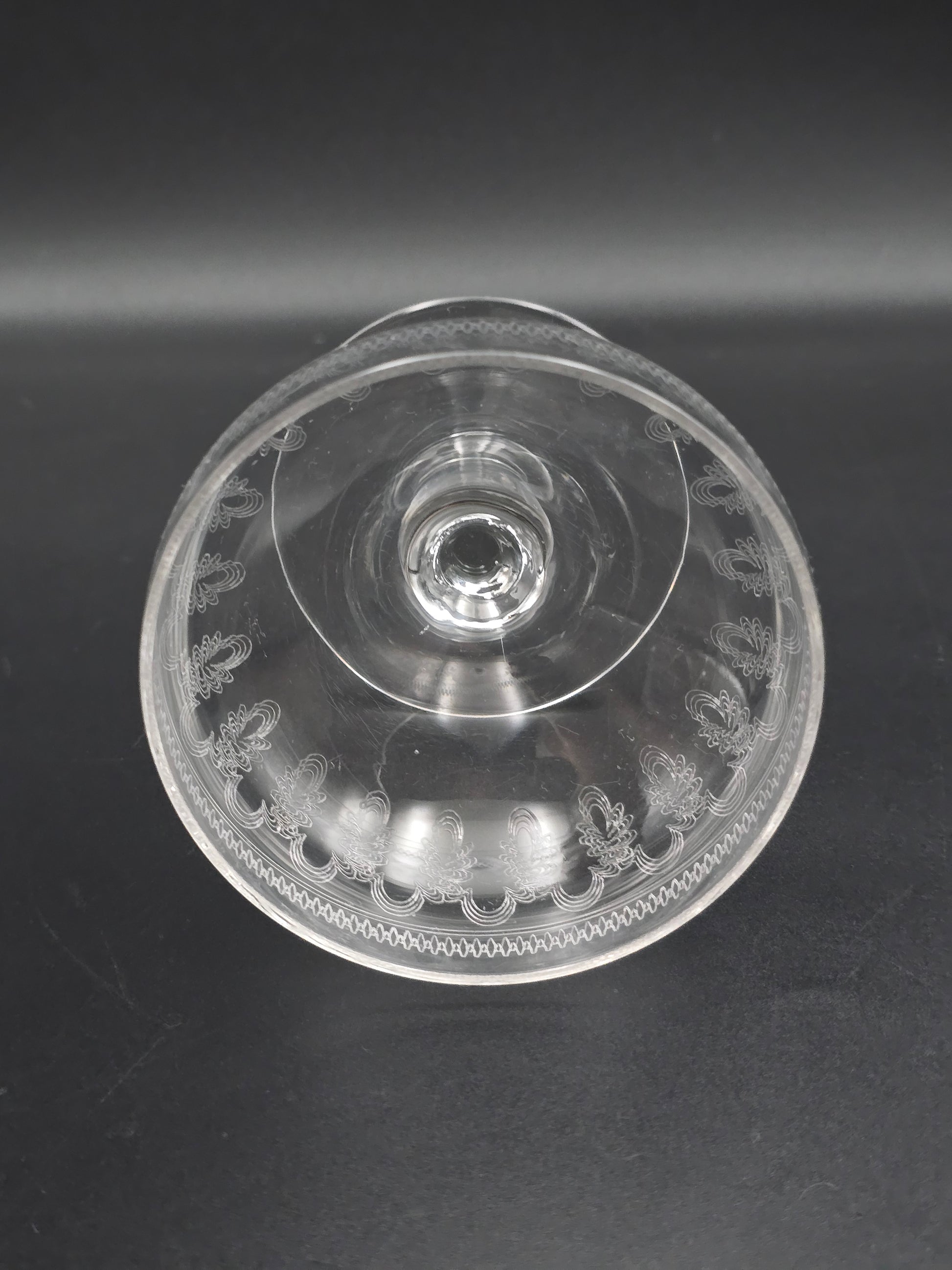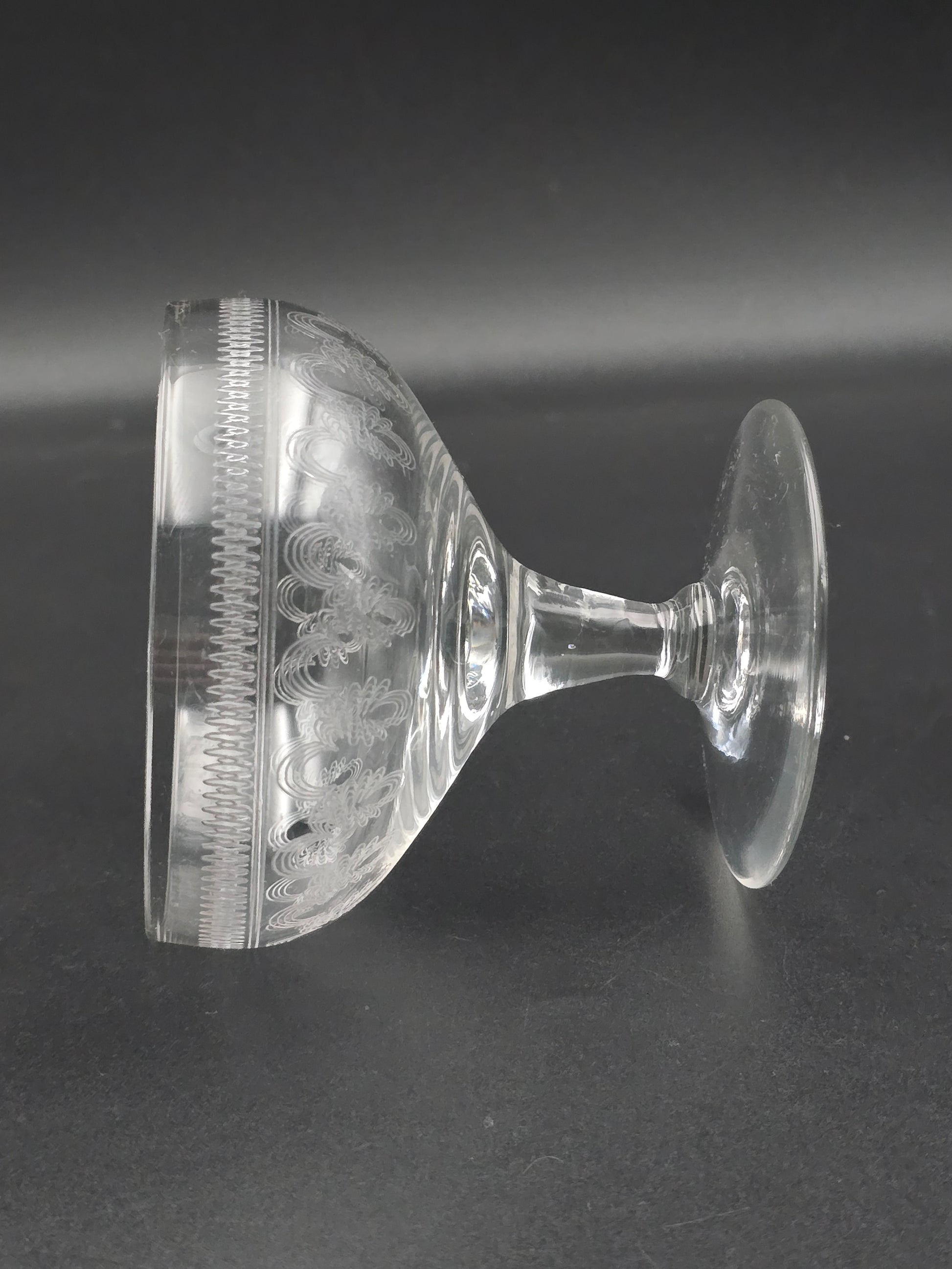 Each coupe features a delicate etched trellis and floral design, held by a sturdy short stem and plain base.