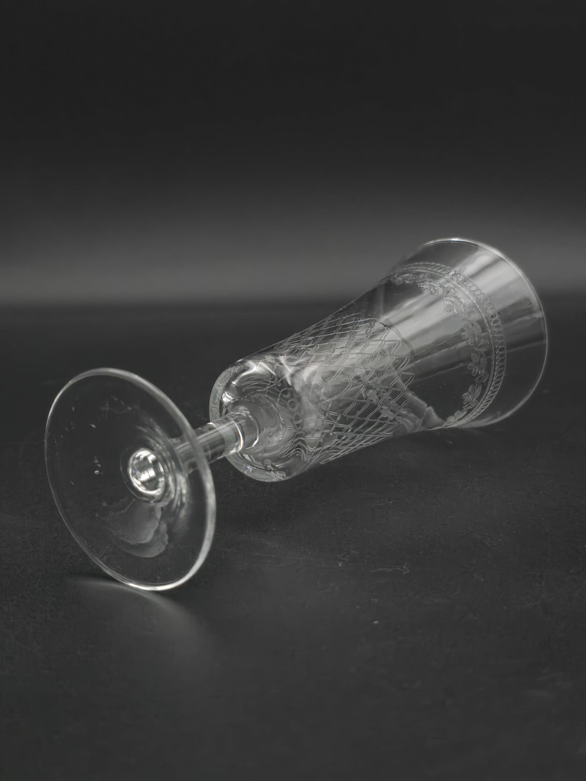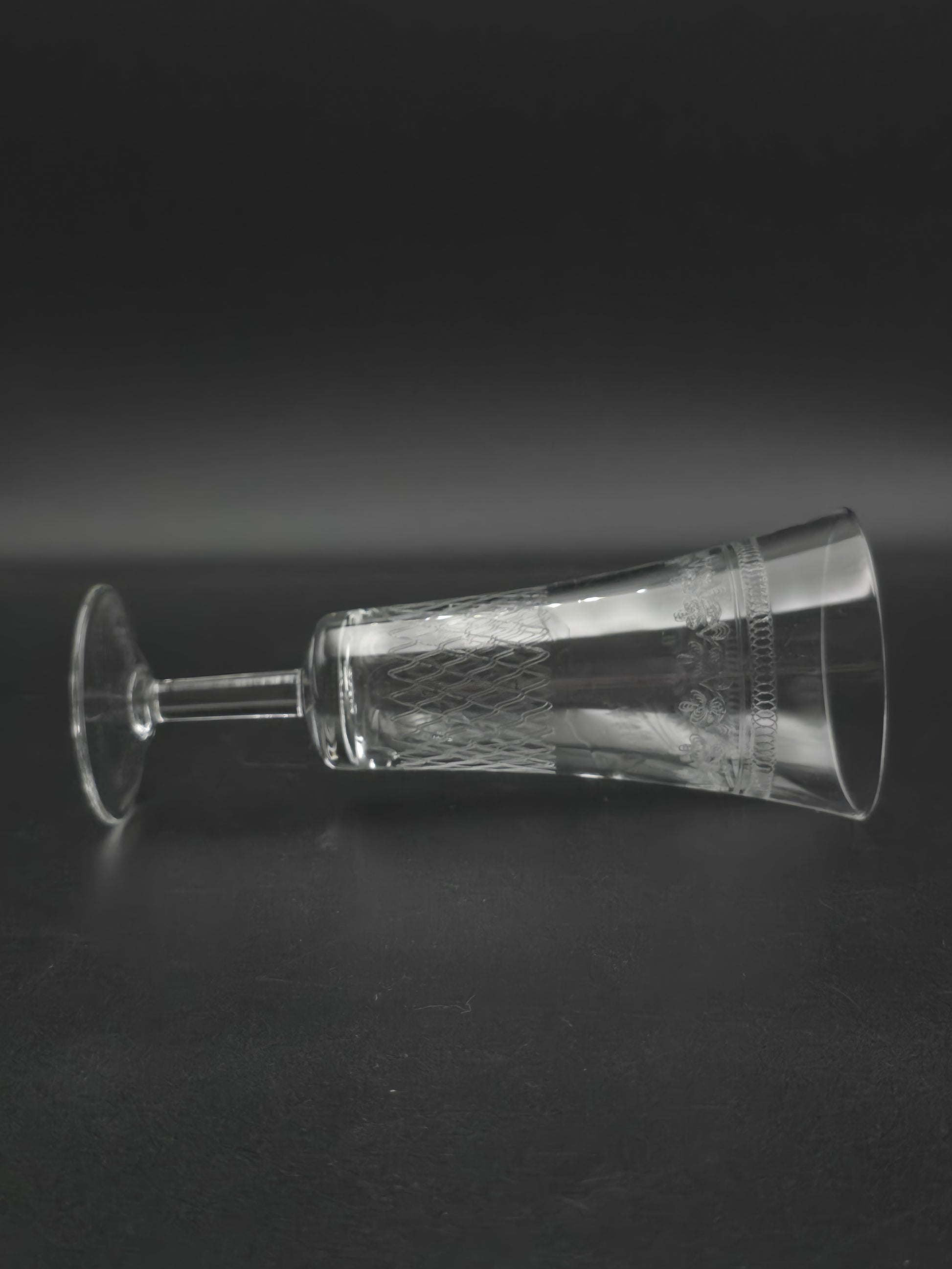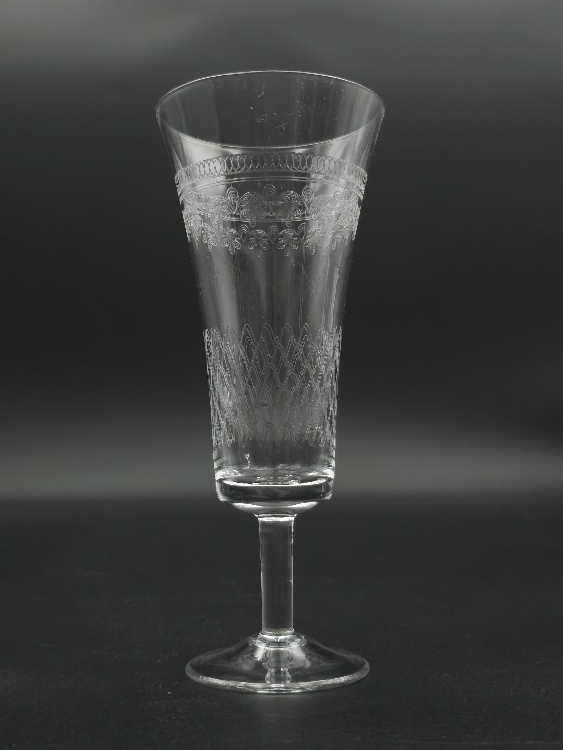 The stem is short yet well-balanced, leading into a beautifully tapered bowl designed to showcase the delicate effervescence of vintage champagne or sparkling wine.