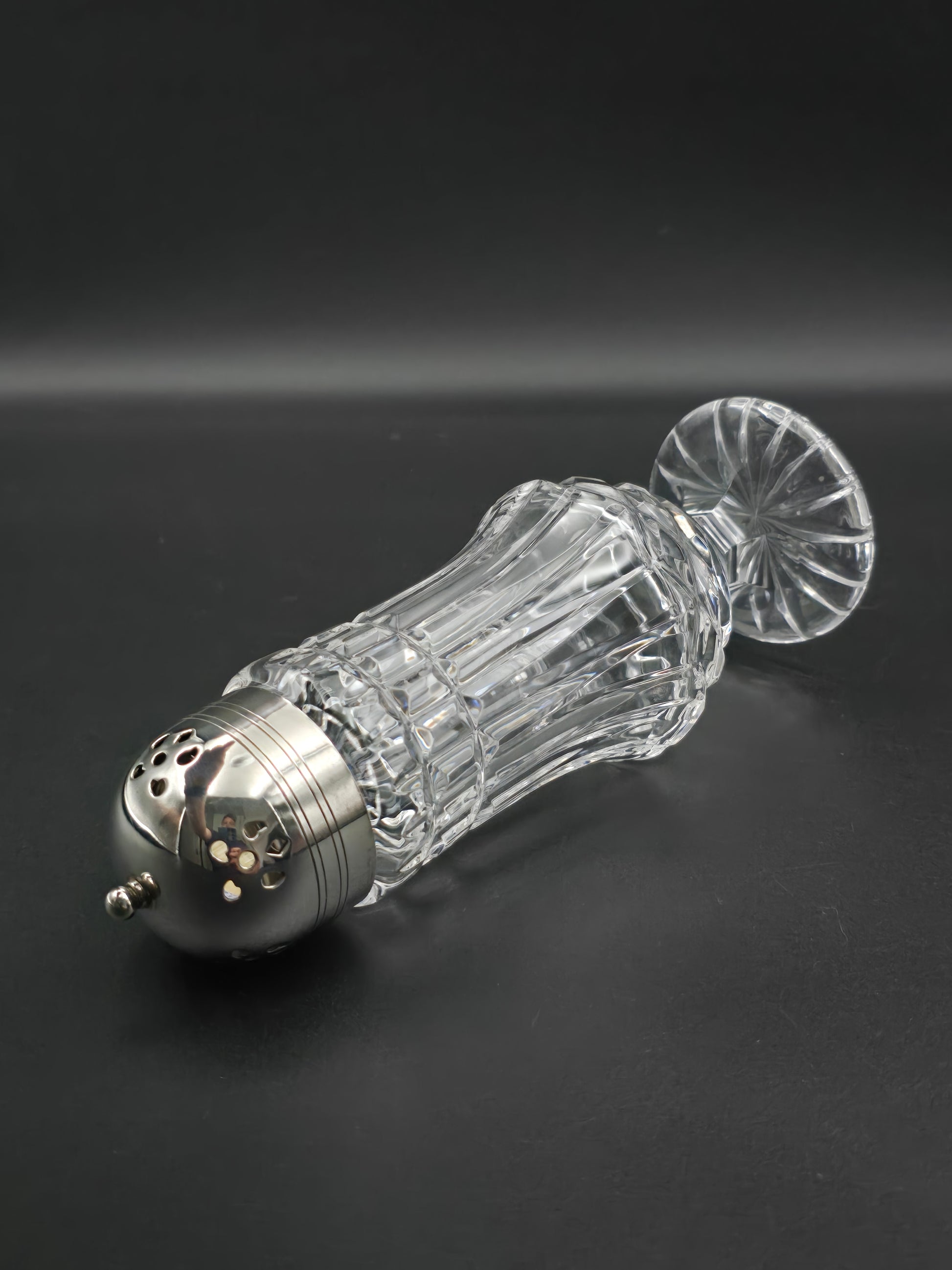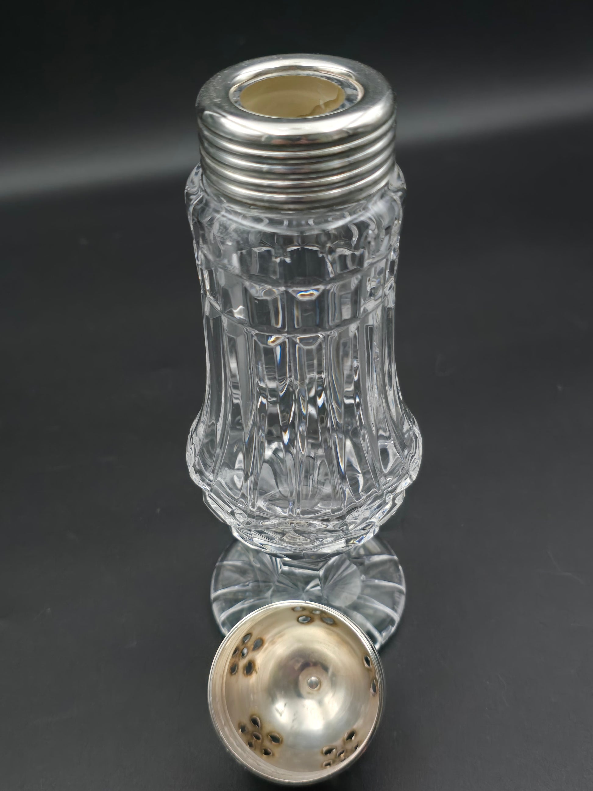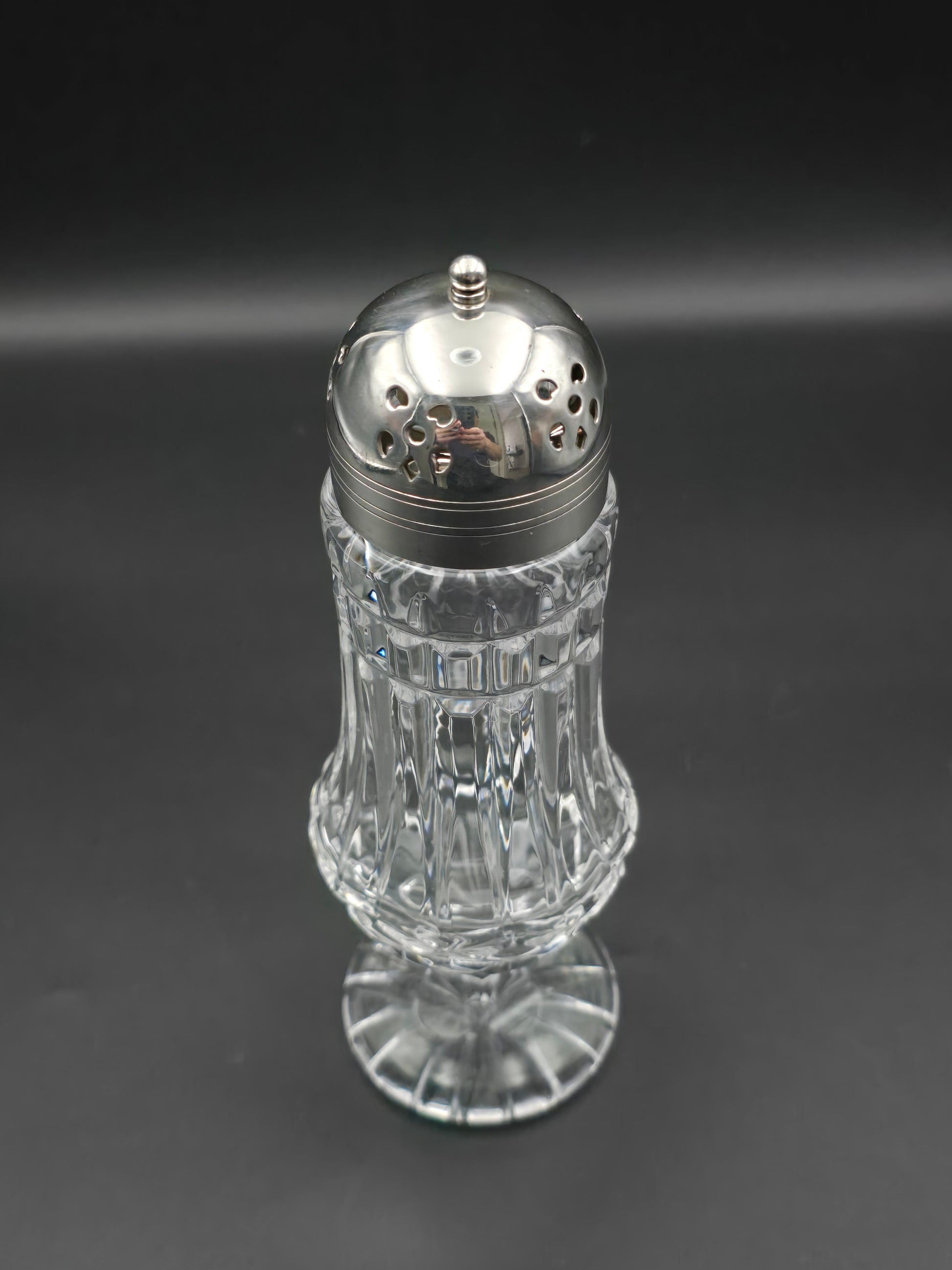 Large Vintage cut glass sugar shaker. 20cm tall.
