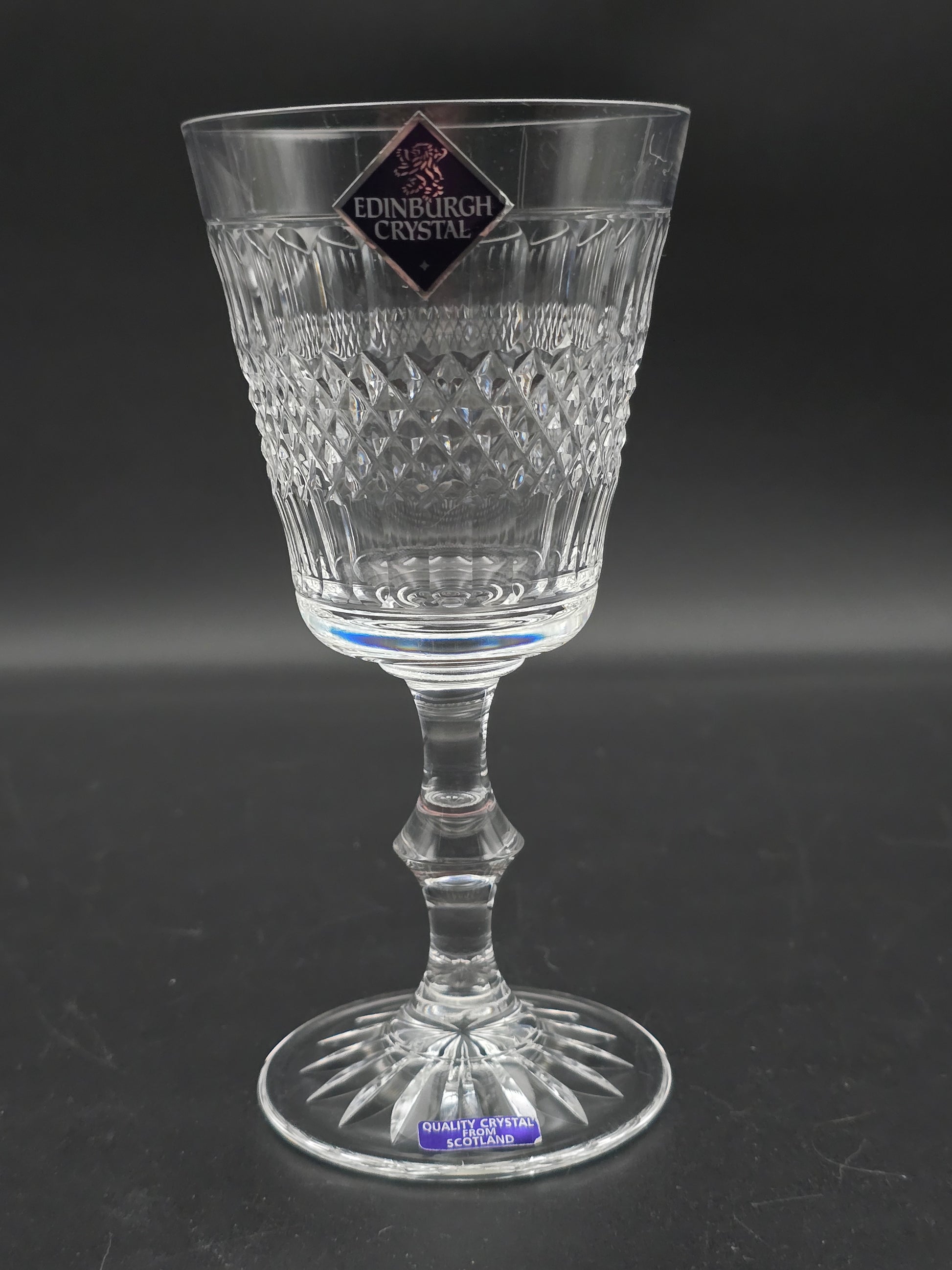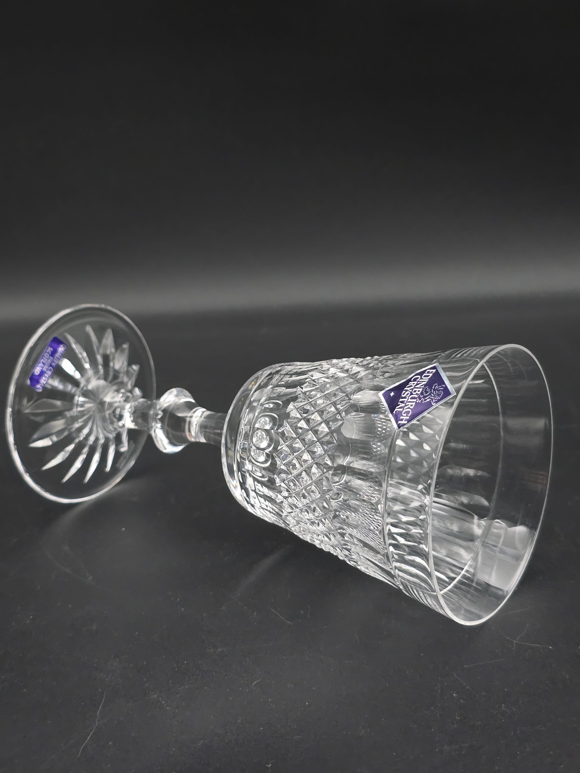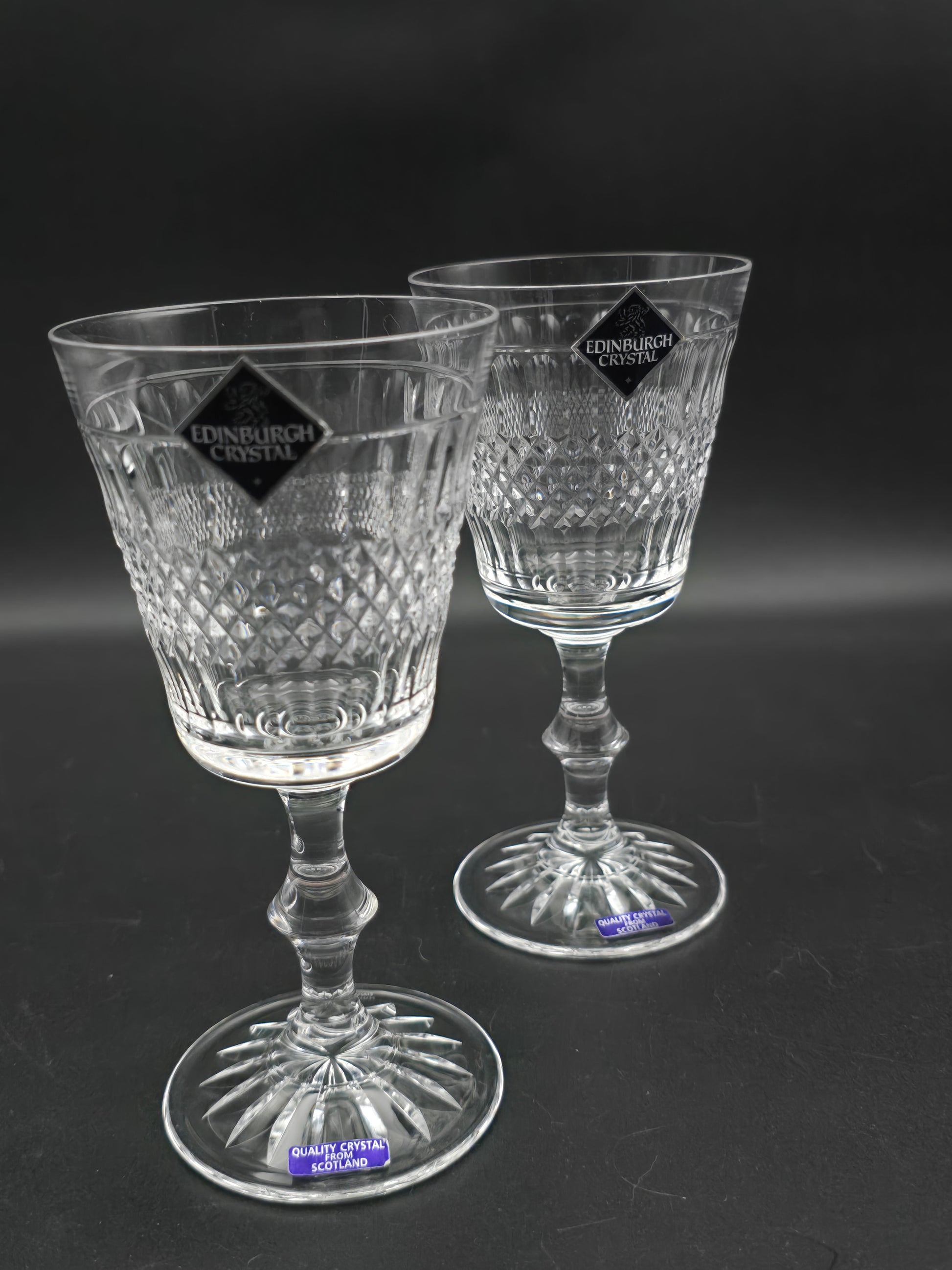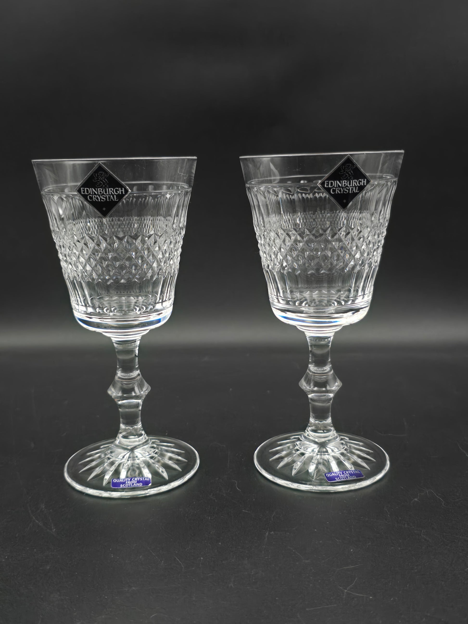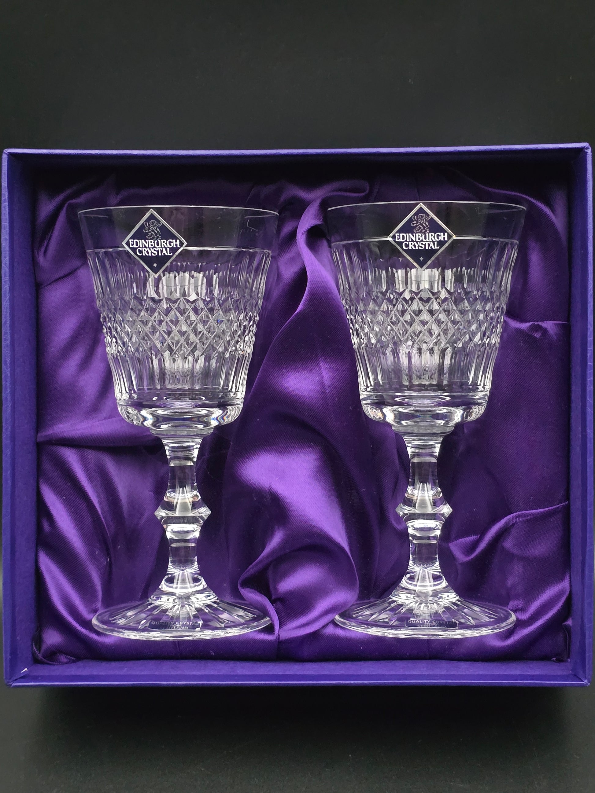 These 200ml Edinburgh Crystal Cameron Pattern wine glasses are elegantly presented in their original box.