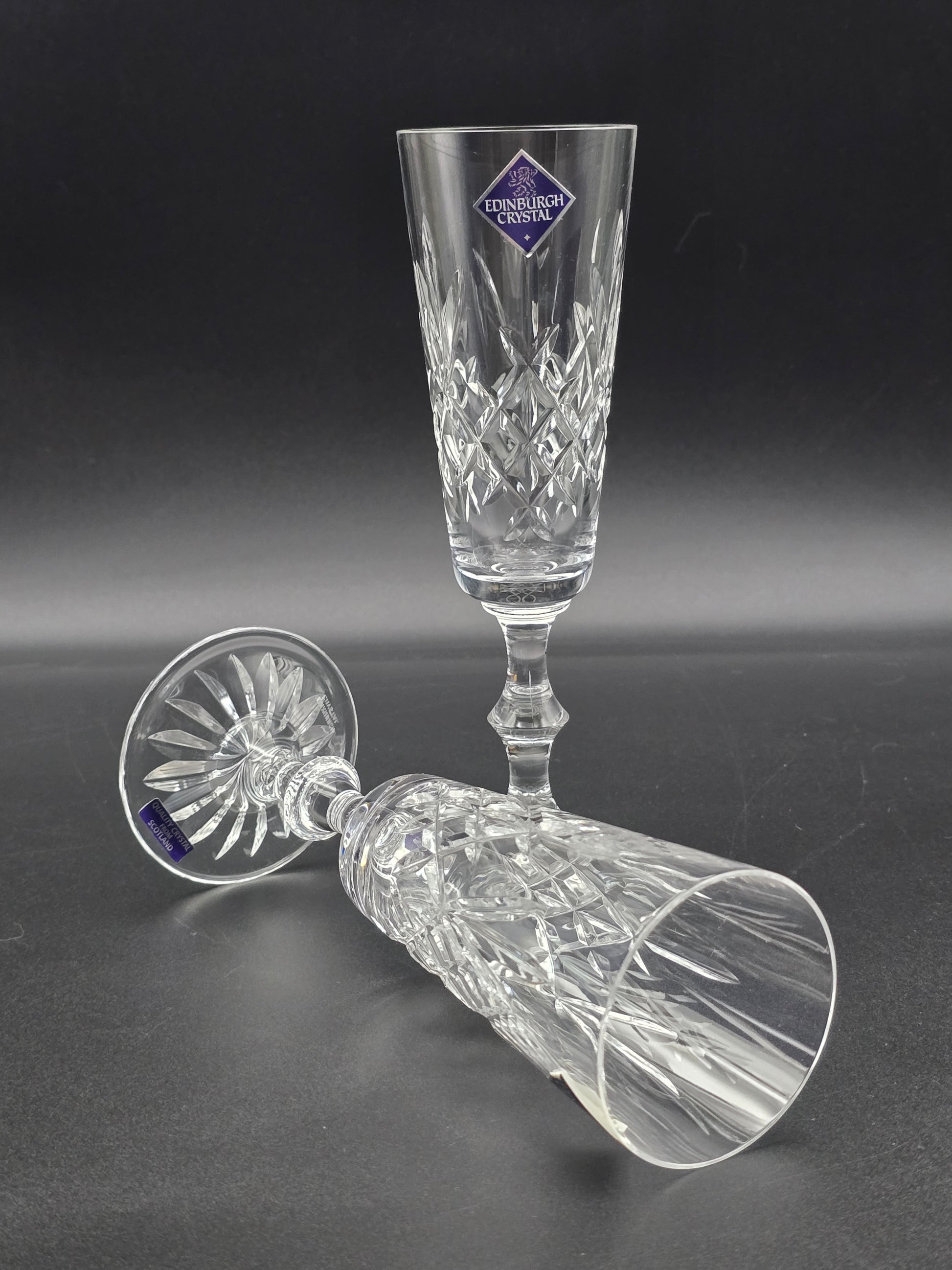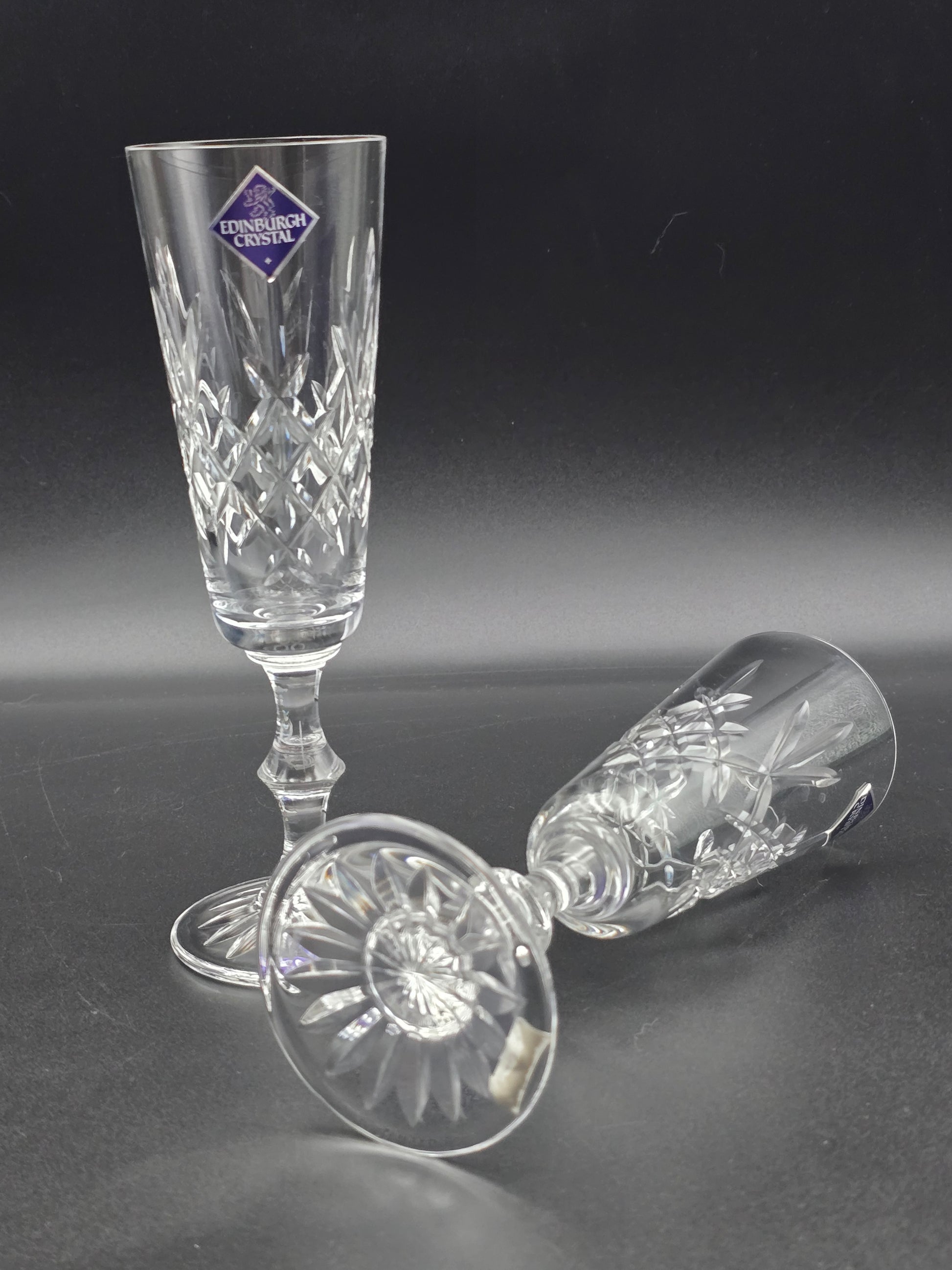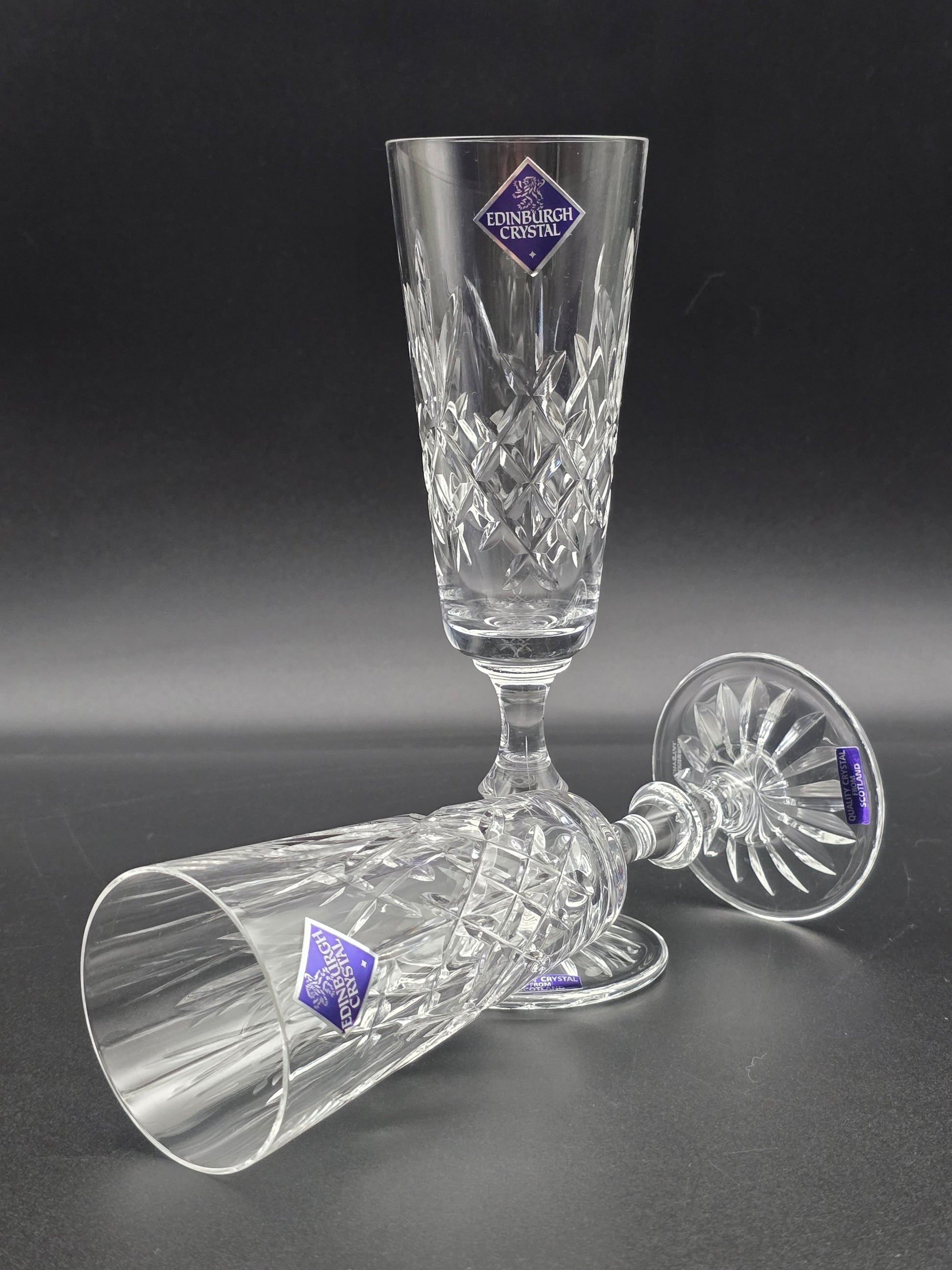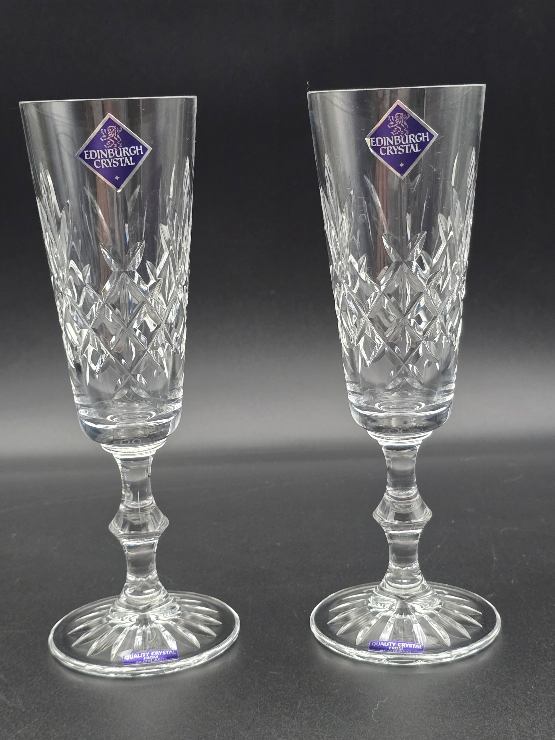 Pair of Edinburgh Crystal Lomond Pattern Crystal Champagne Flutes. 150ml. 19.5cm tall. Boxed.