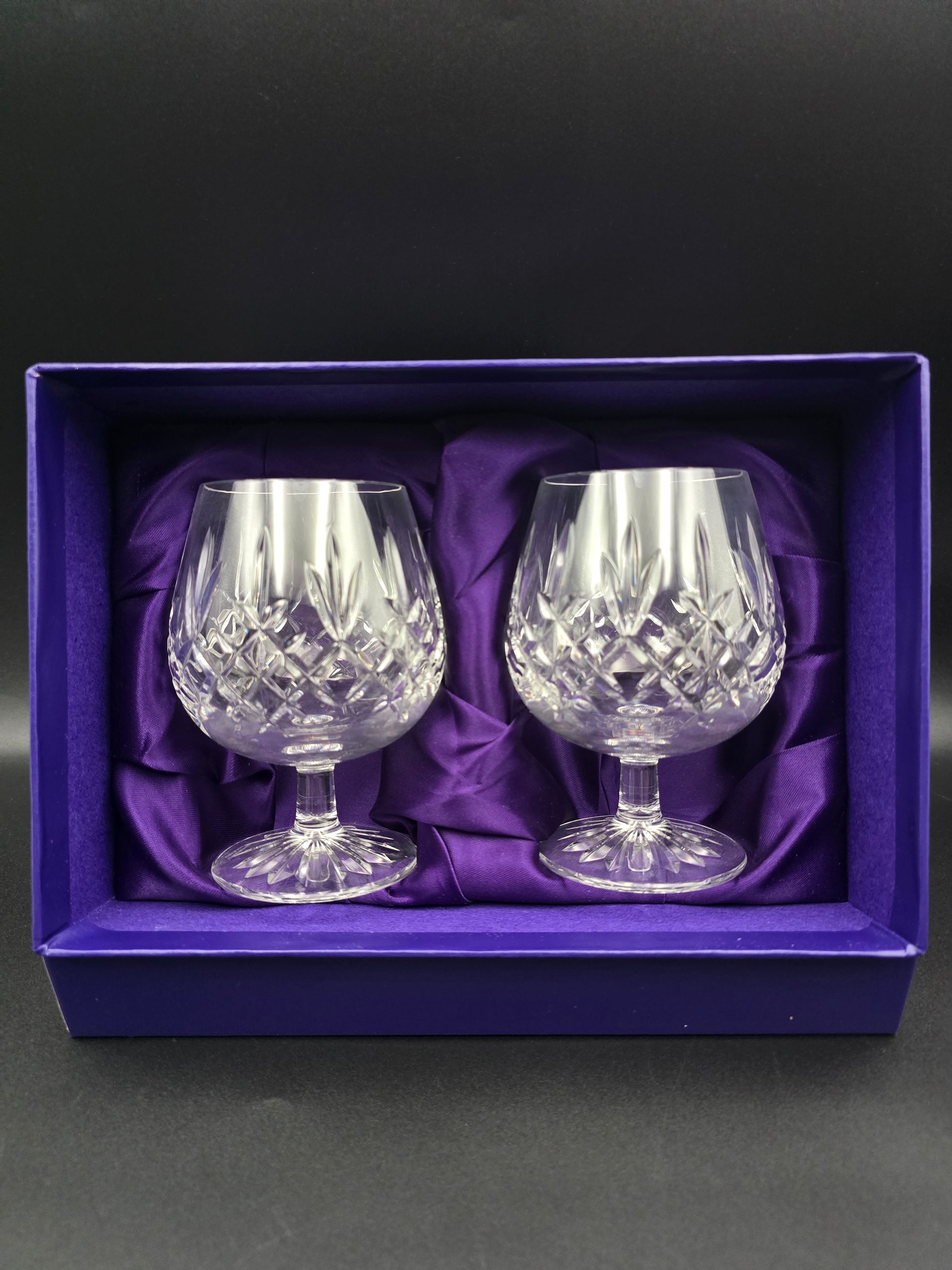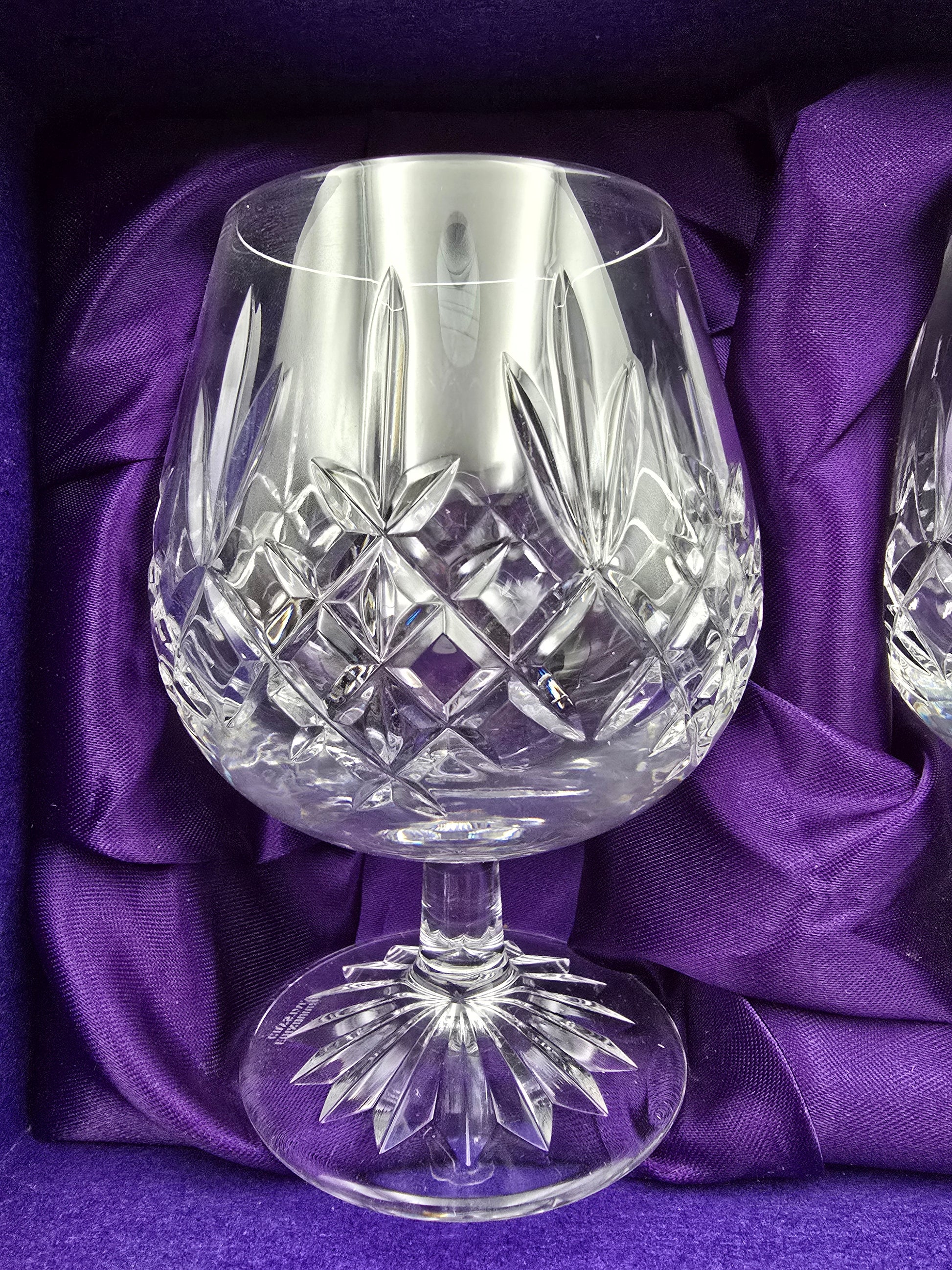 Pair of Vintage Edinburgh Crystal Lomond Pattern Brandy Glasses 12oz, Star Cut Base, Boxed, 12.7cm Tall