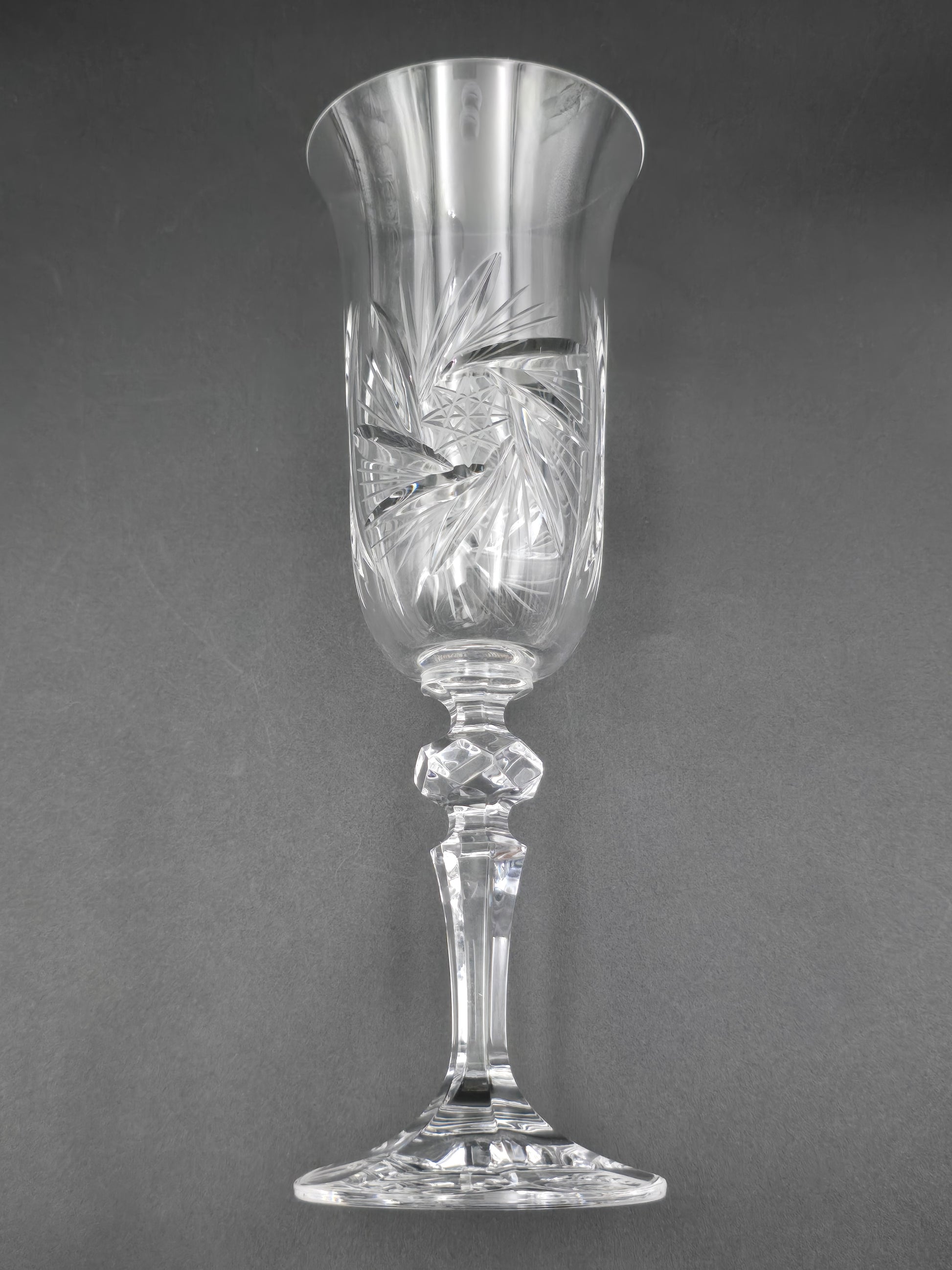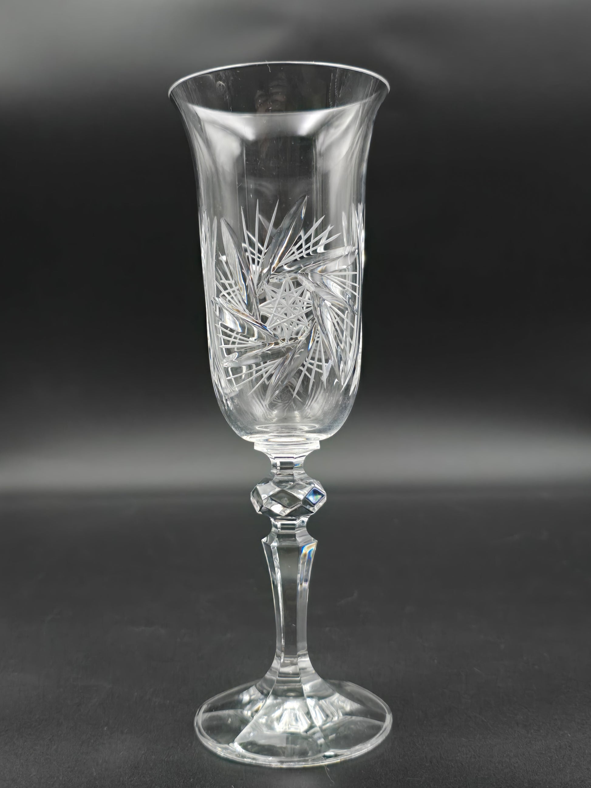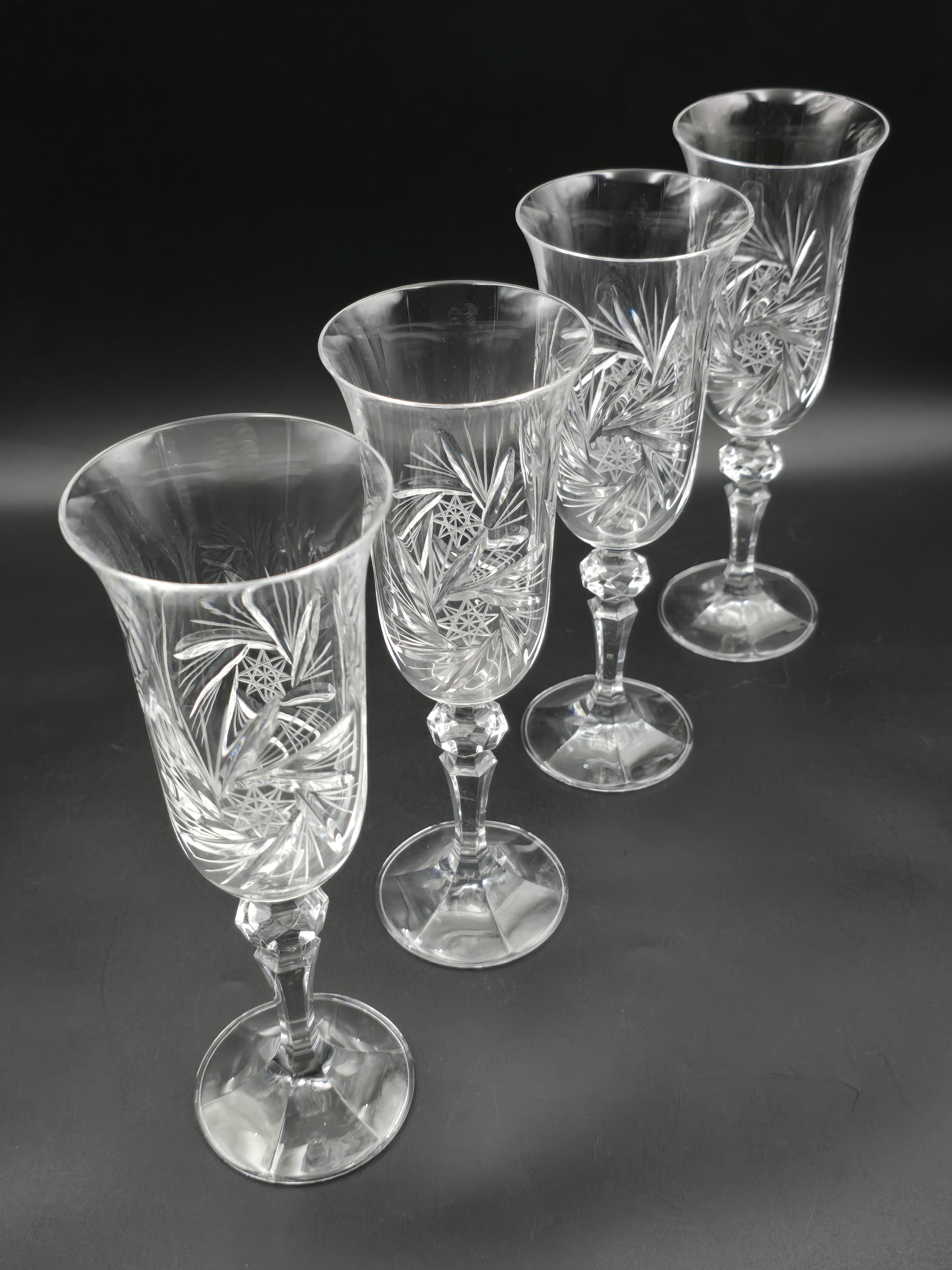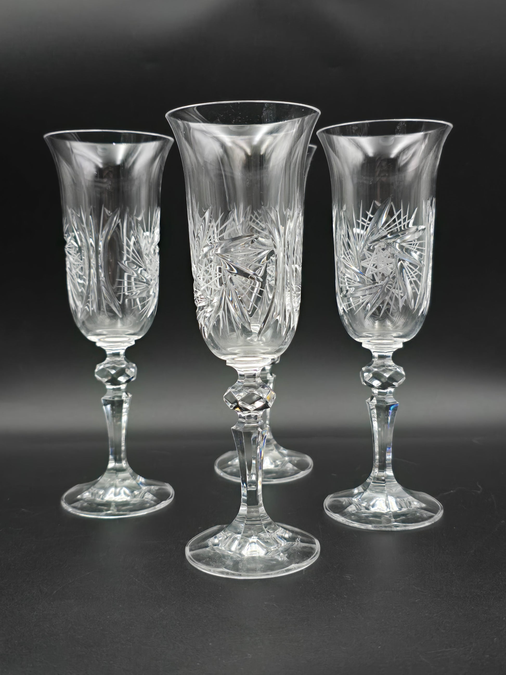 A beautiful set of four vintage Bohemian crystal champagne flutes — each one a work of art, cut with precision and elegance.