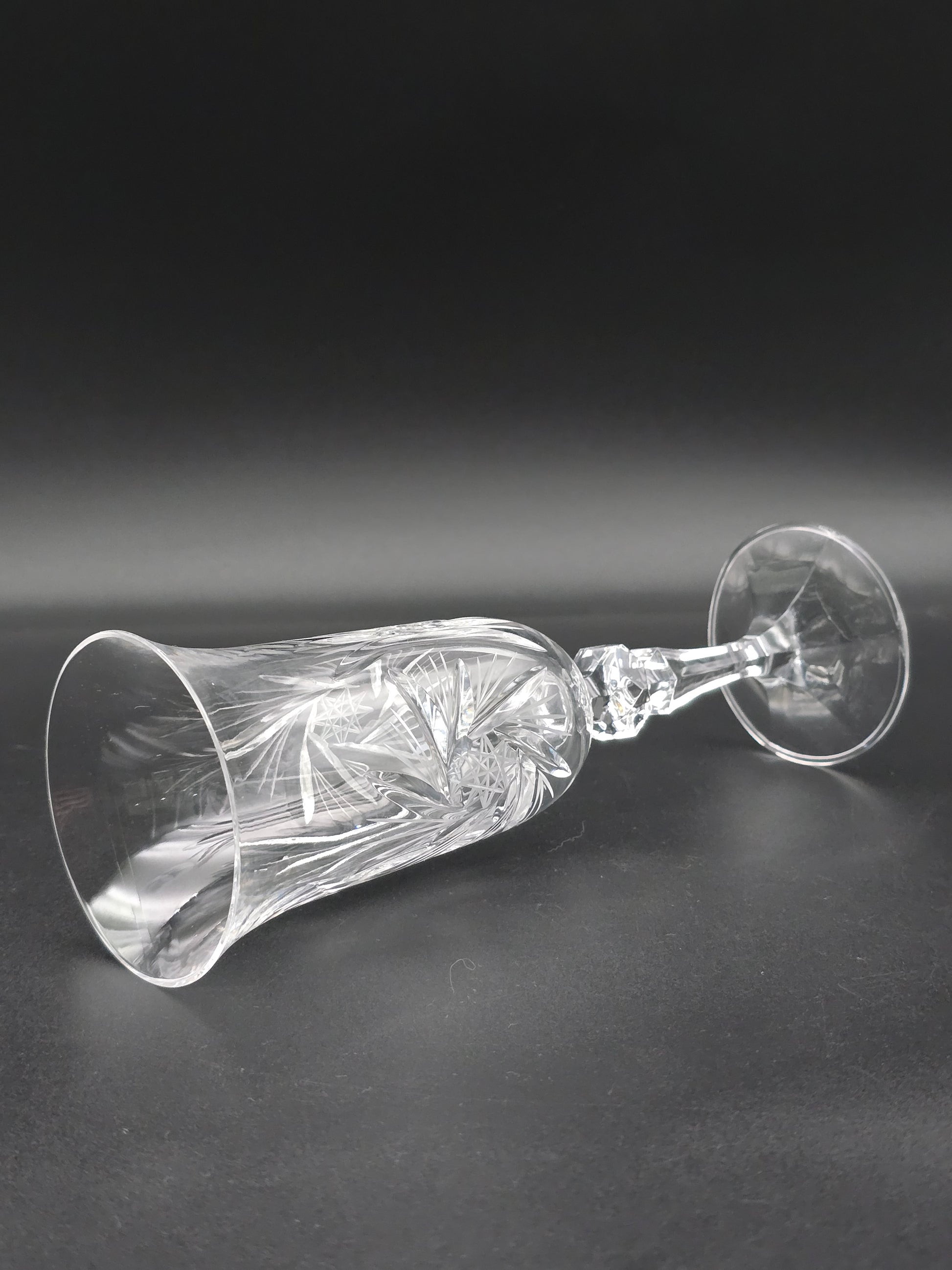 They feature a tall flared bowl, finished with a classic deep starburst and fern-like cut design, sitting gracefully atop a beautifully faceted ball stem — a true hallmark of mid-century Czech glassmaking.