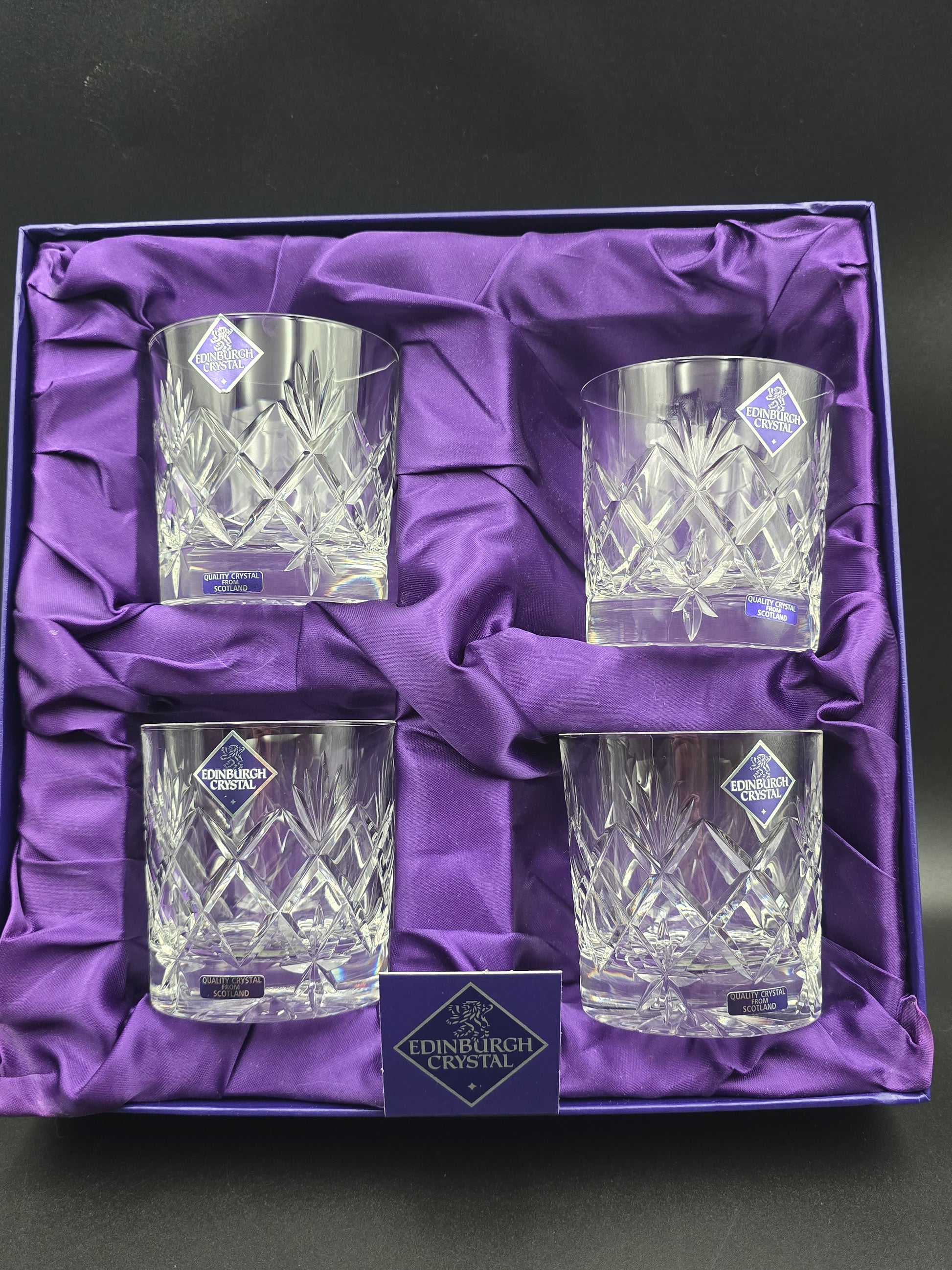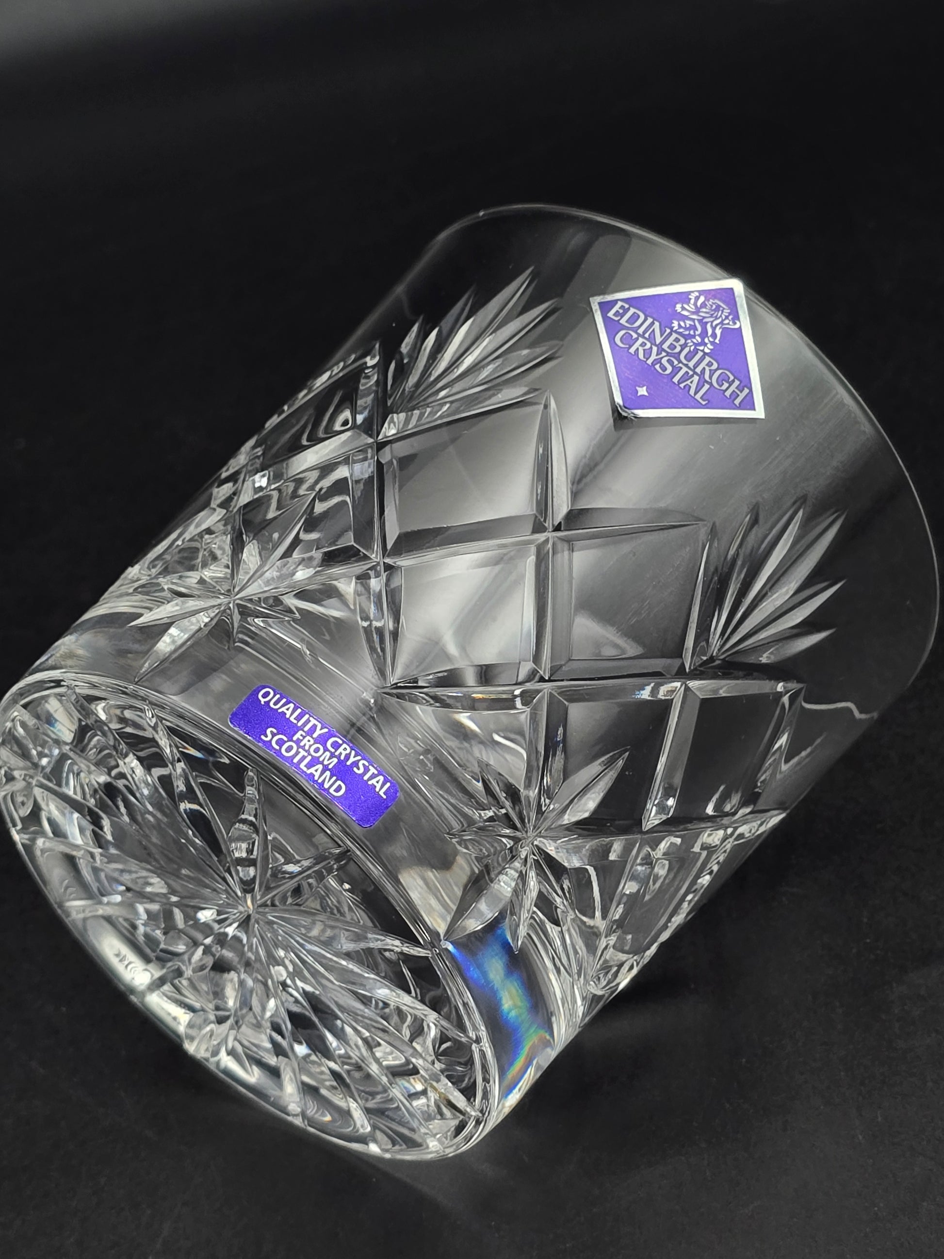 Elevate your glassware collection with this pristine boxed set of four Edinburgh Crystal Kelso tumblers, each expertly cut in Scotland and still housed in their original box, complete with factory stickers.