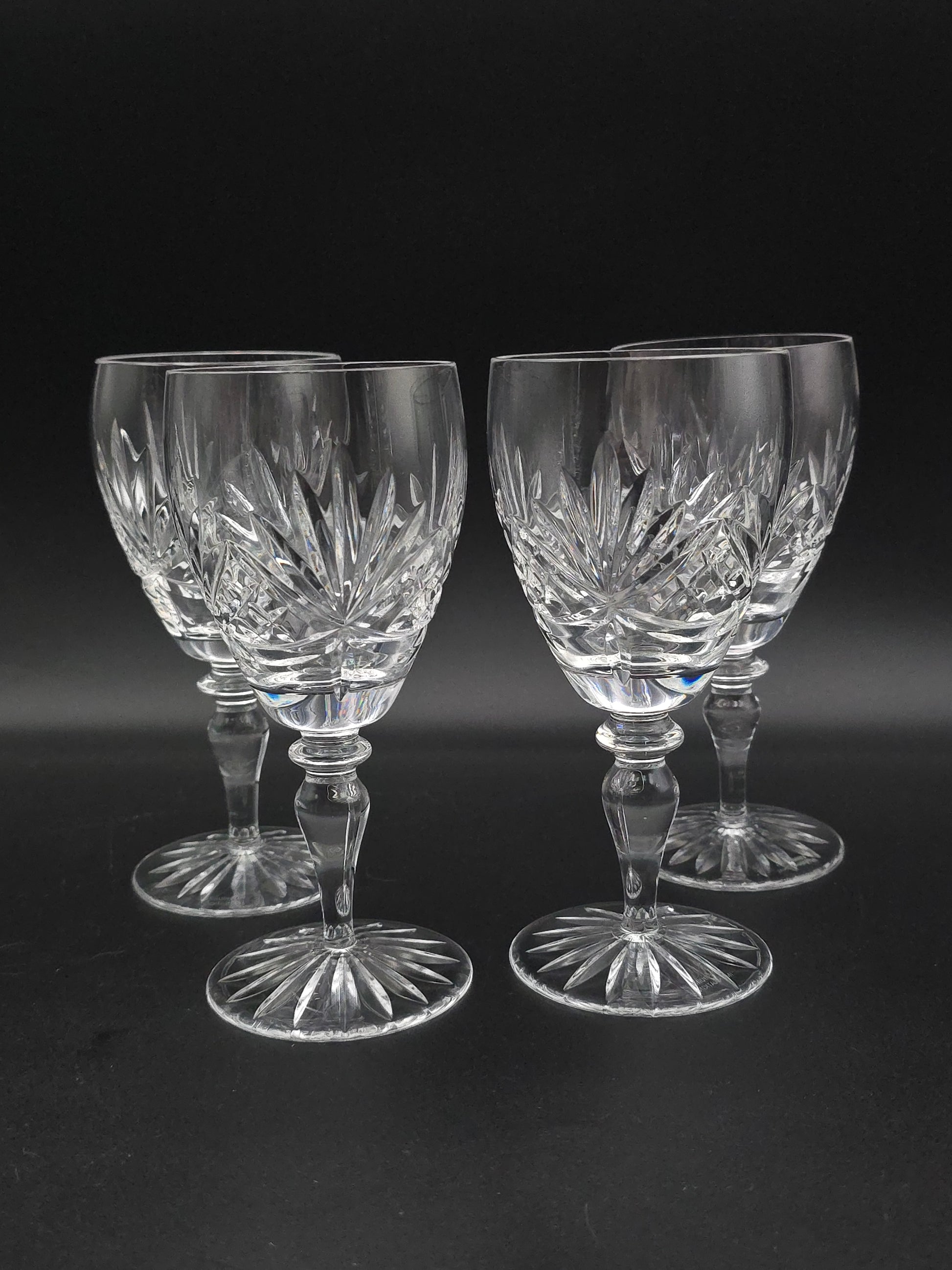 A beautiful set of four Edinburgh International Edinburgh Crystal wine glasses in the refined Sterling pattern.
