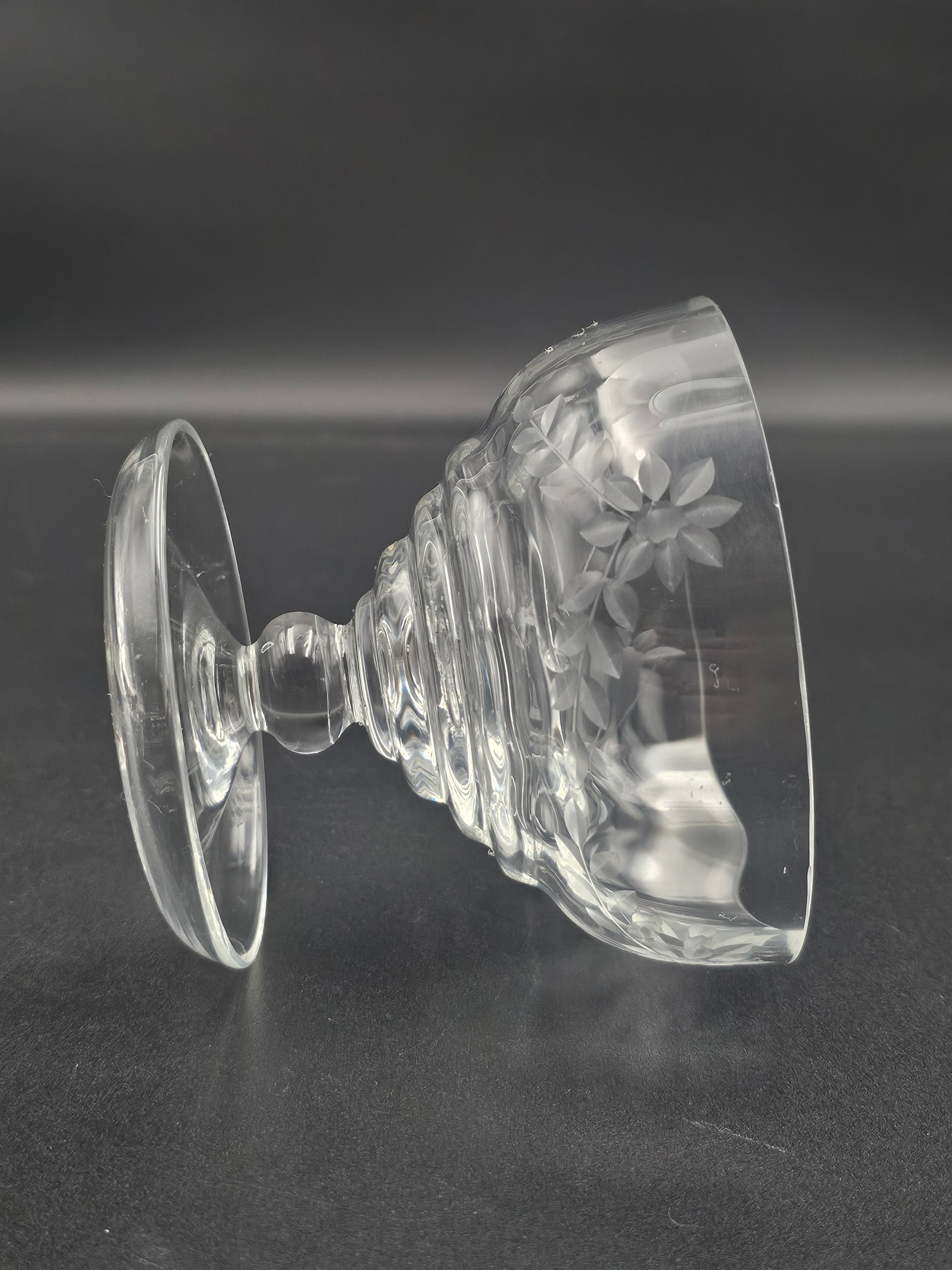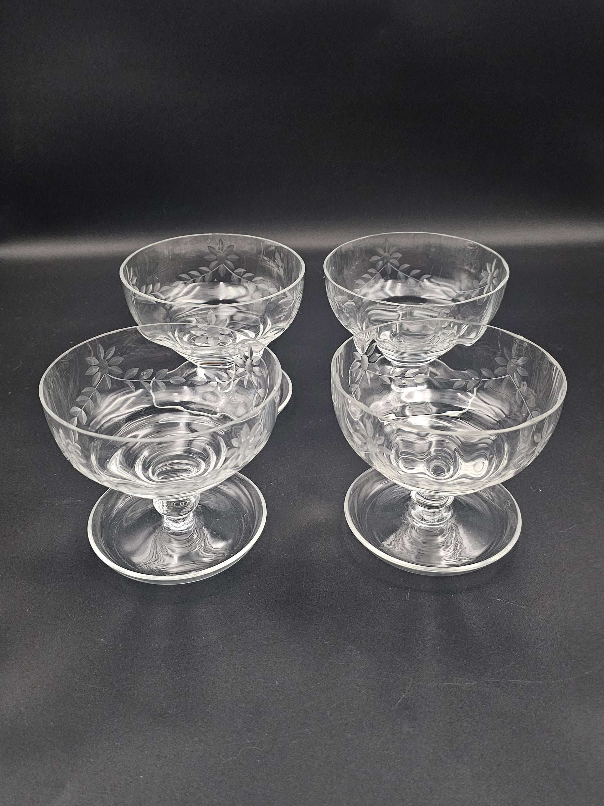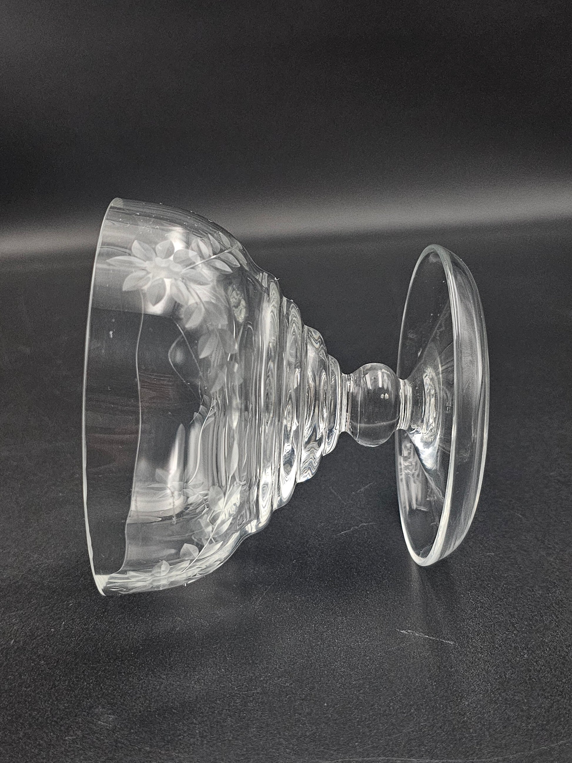 These beautiful bowls feature intricate floral etchings, a short knopped stem, and a lipped saucer for a touch of elegance.