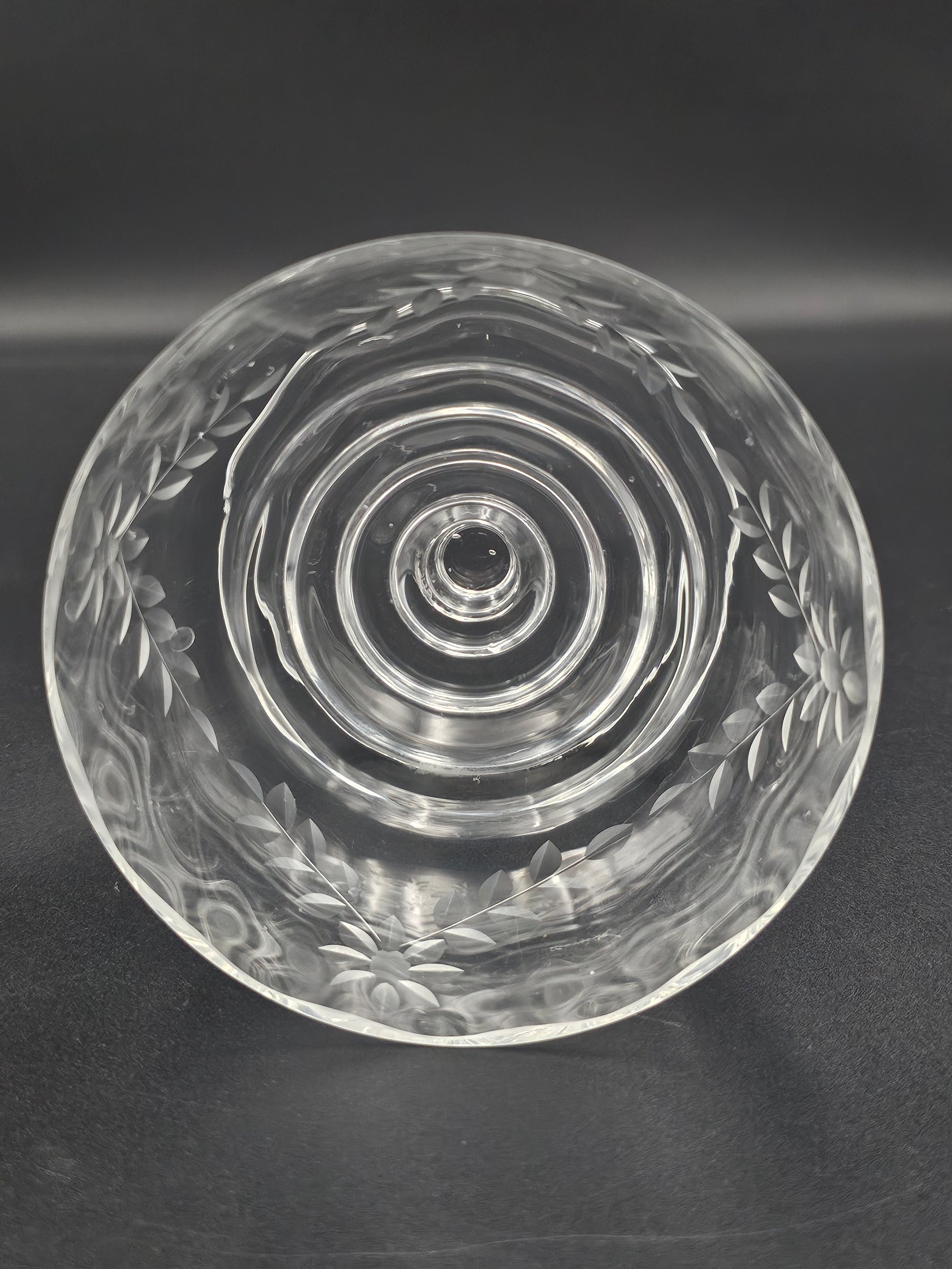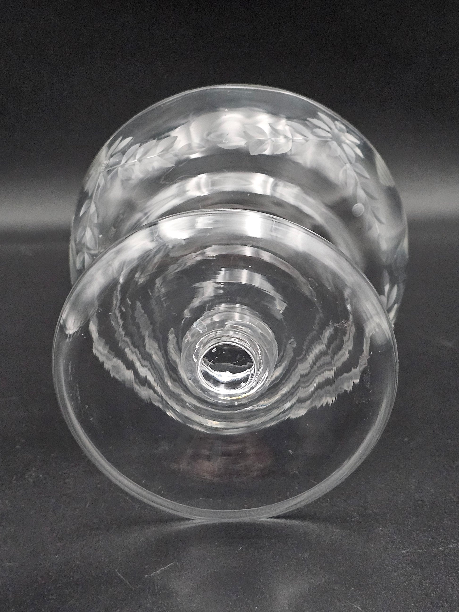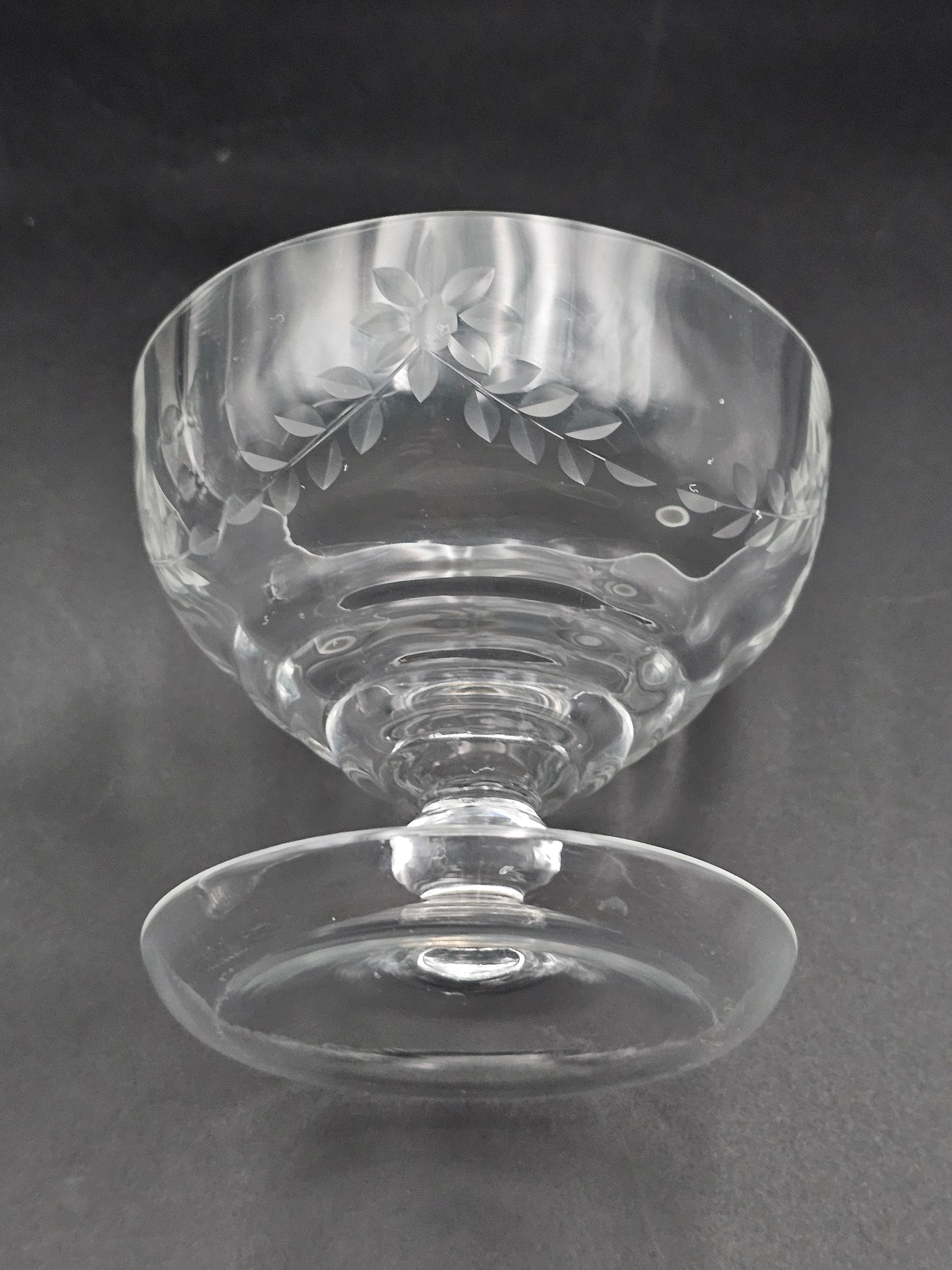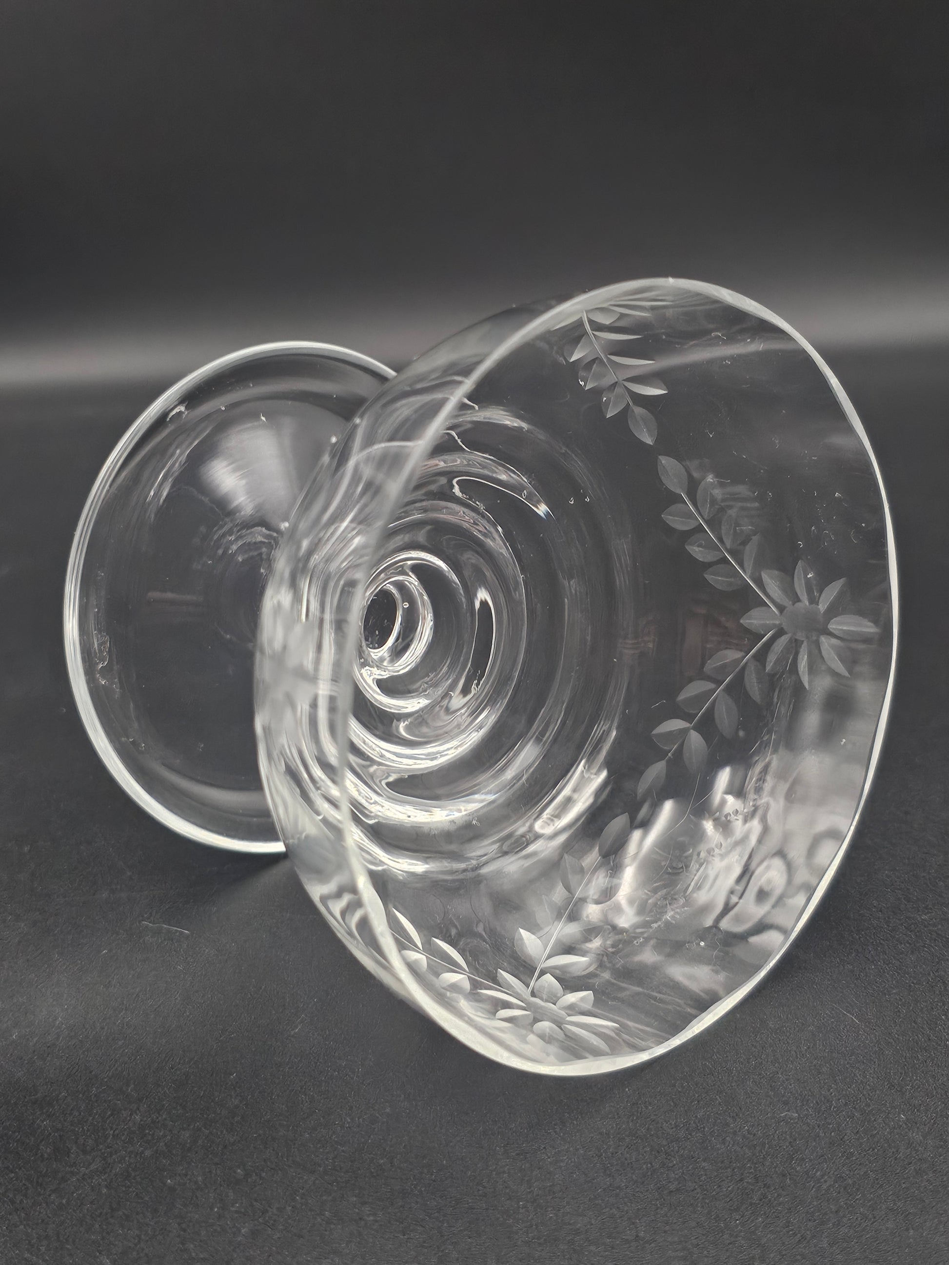 These beautiful bowls feature intricate floral etchings, a short knopped stem, and a lipped saucer for a touch of elegance.