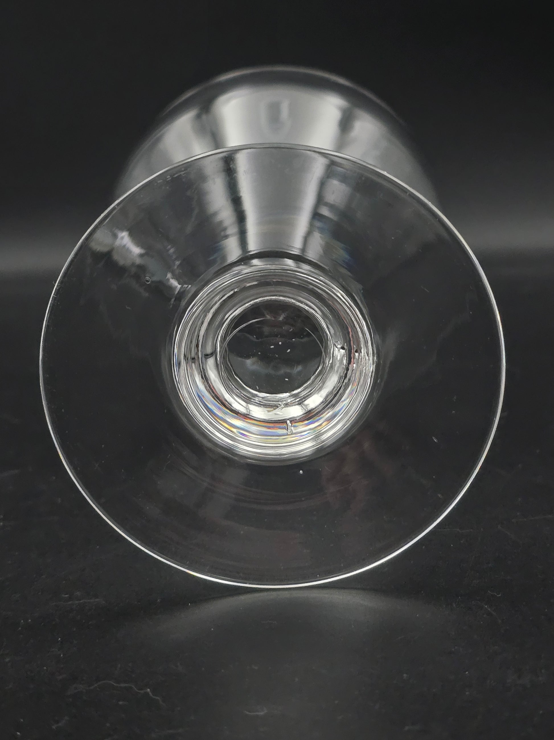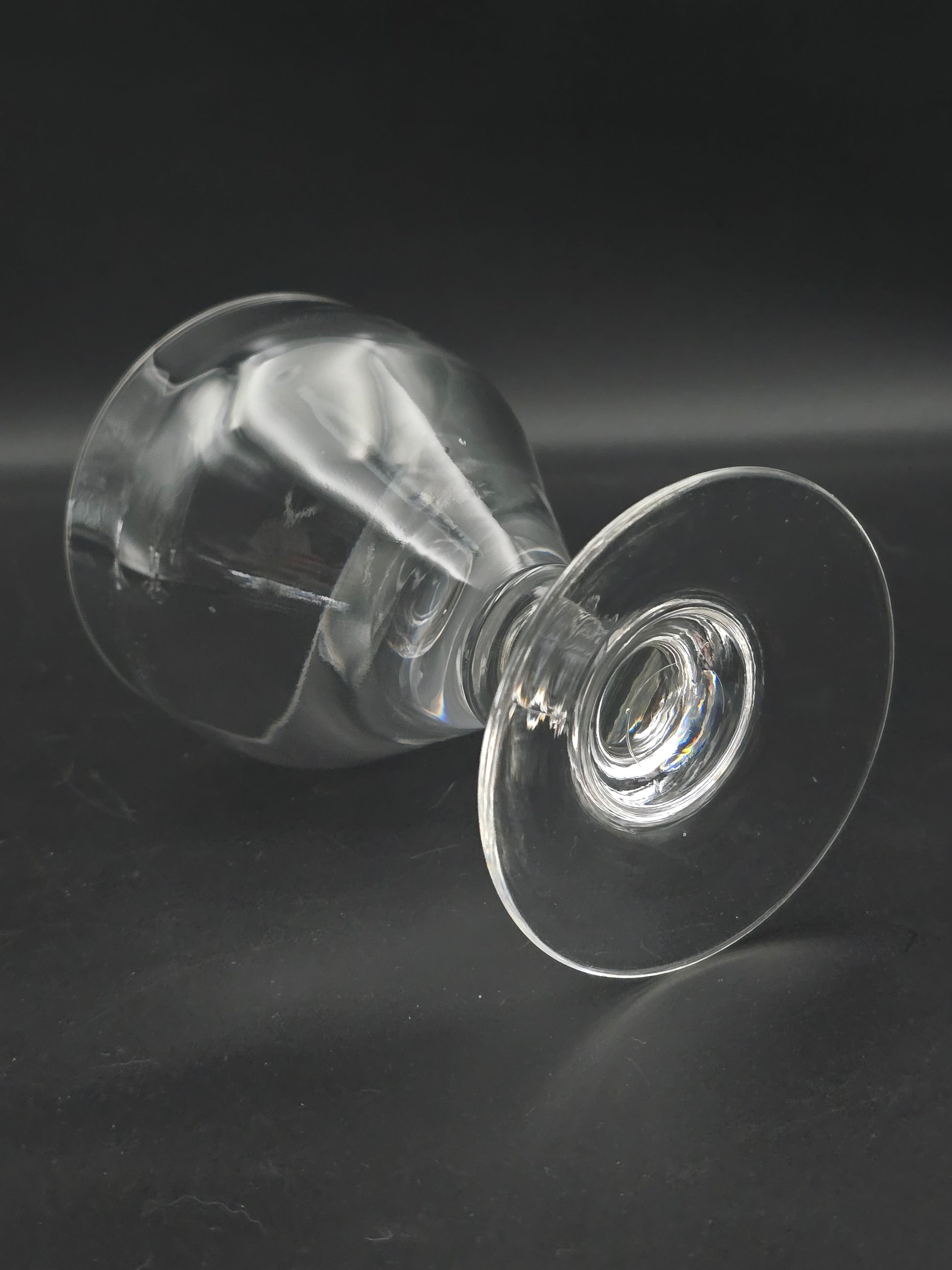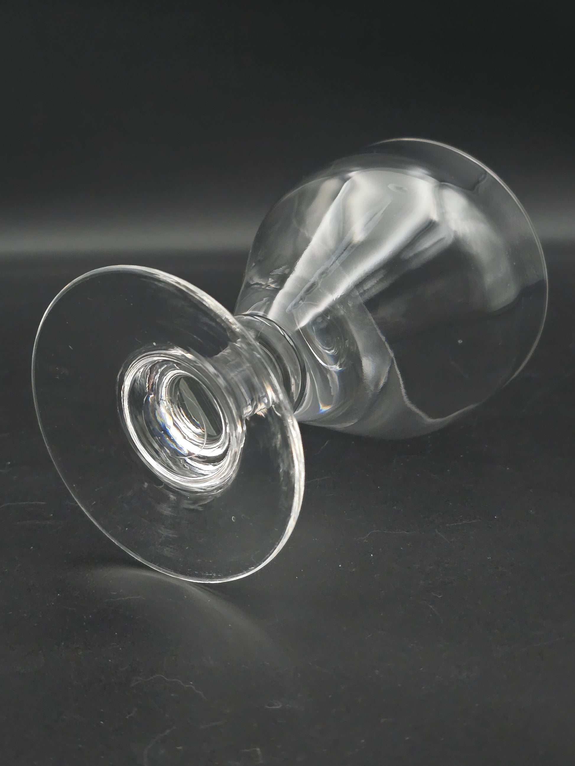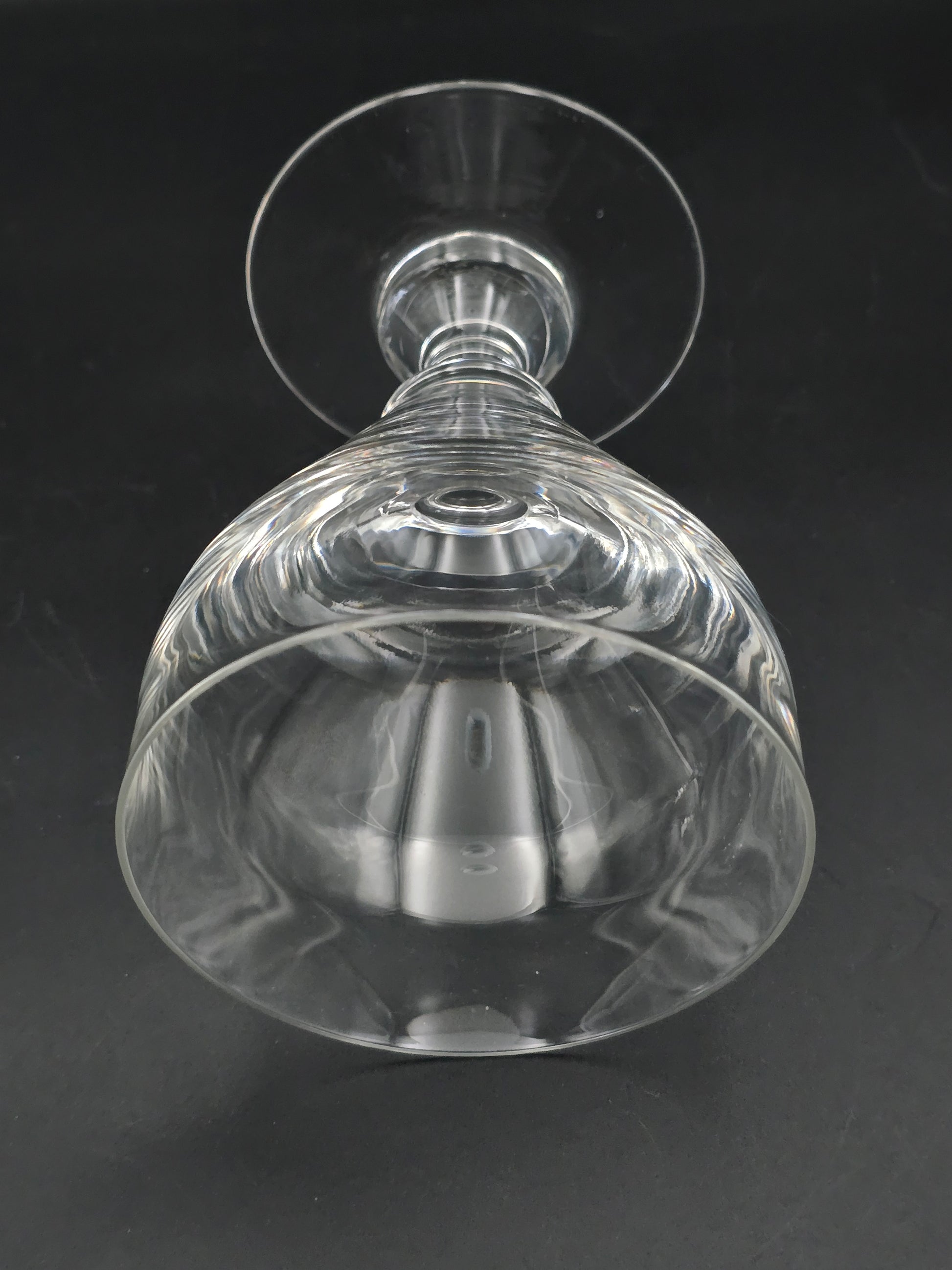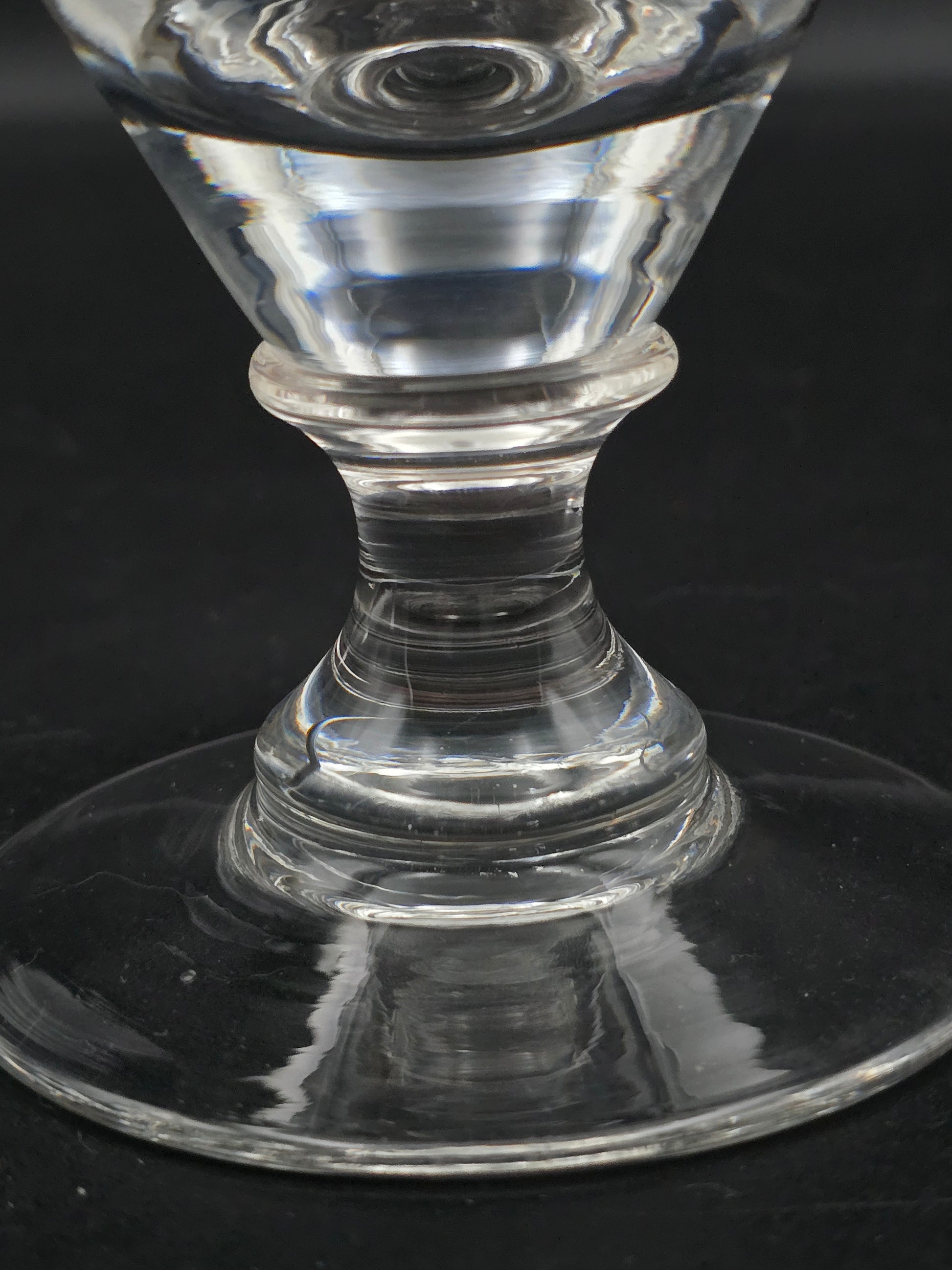 The goblets are reminiscent of the style of Georgian rummers, with a straight-sided bowl that then tapers in towards the thickened base. This sits on a pronounced discoid collar, which merges with the thick, waisted stem. This widens out again to merge with the thick, discoid foot. The latter is plain and unmarked.
