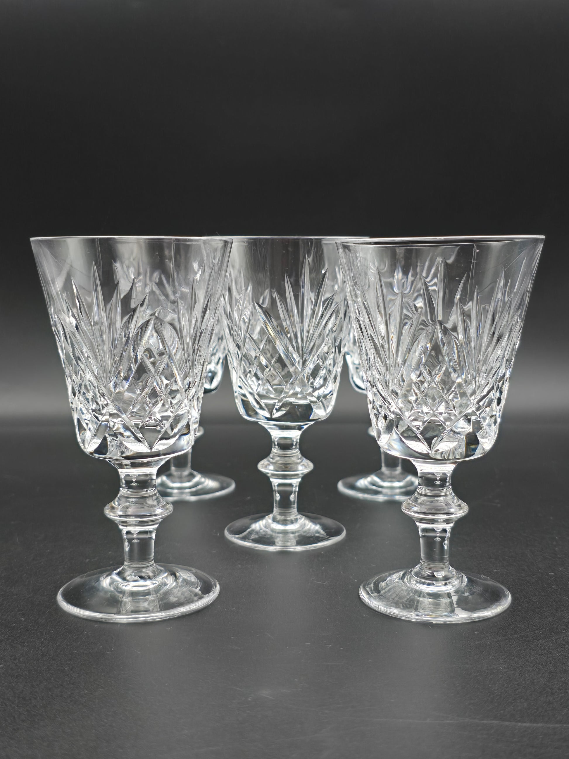 A beautifully elegant set of five Royal Doulton crystal glasses in the timeless Juno pattern, known for its classic cut and fine British craftsmanship.