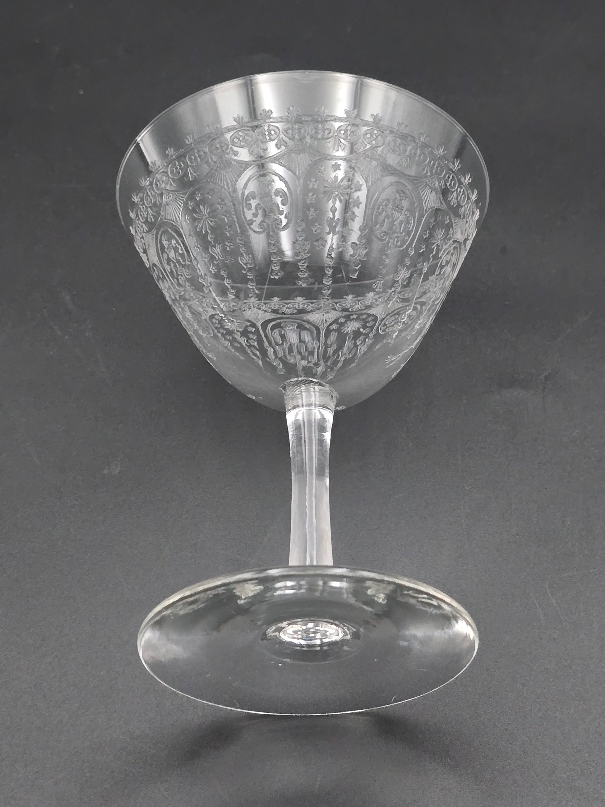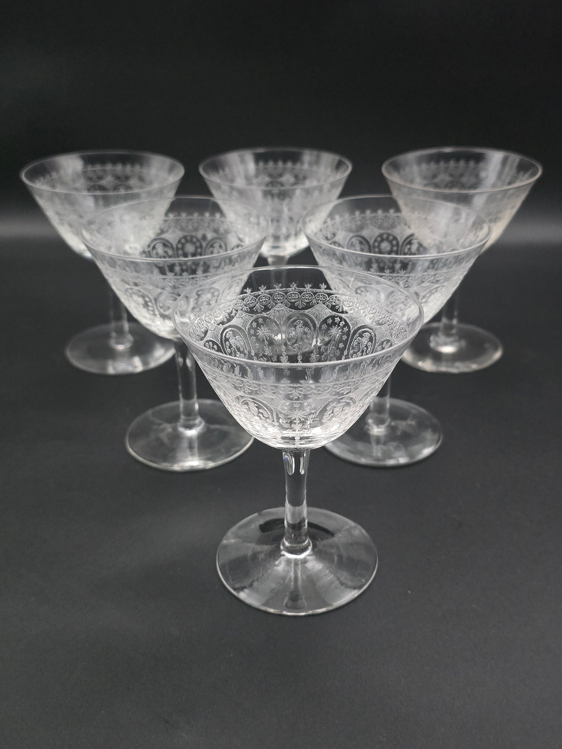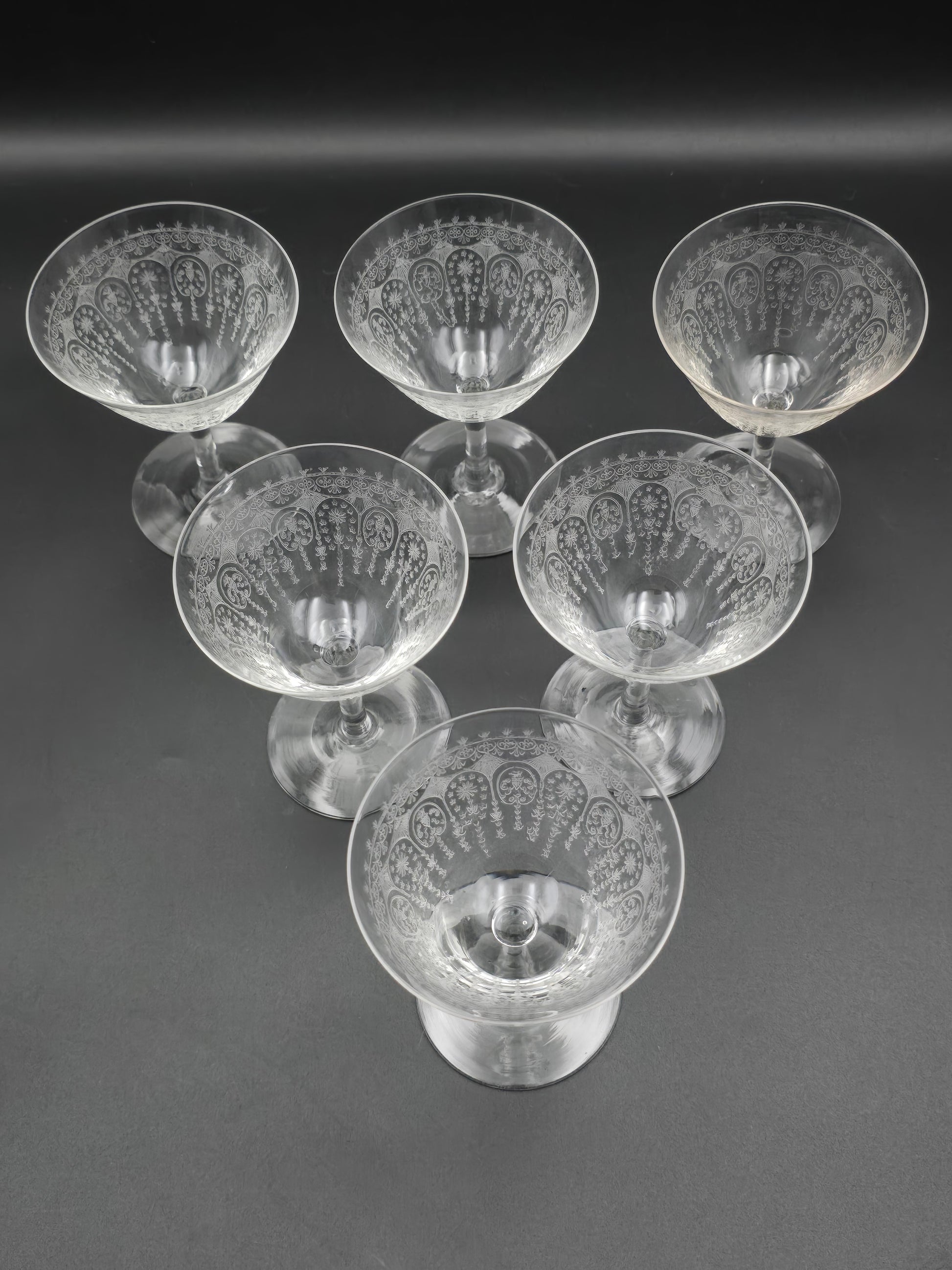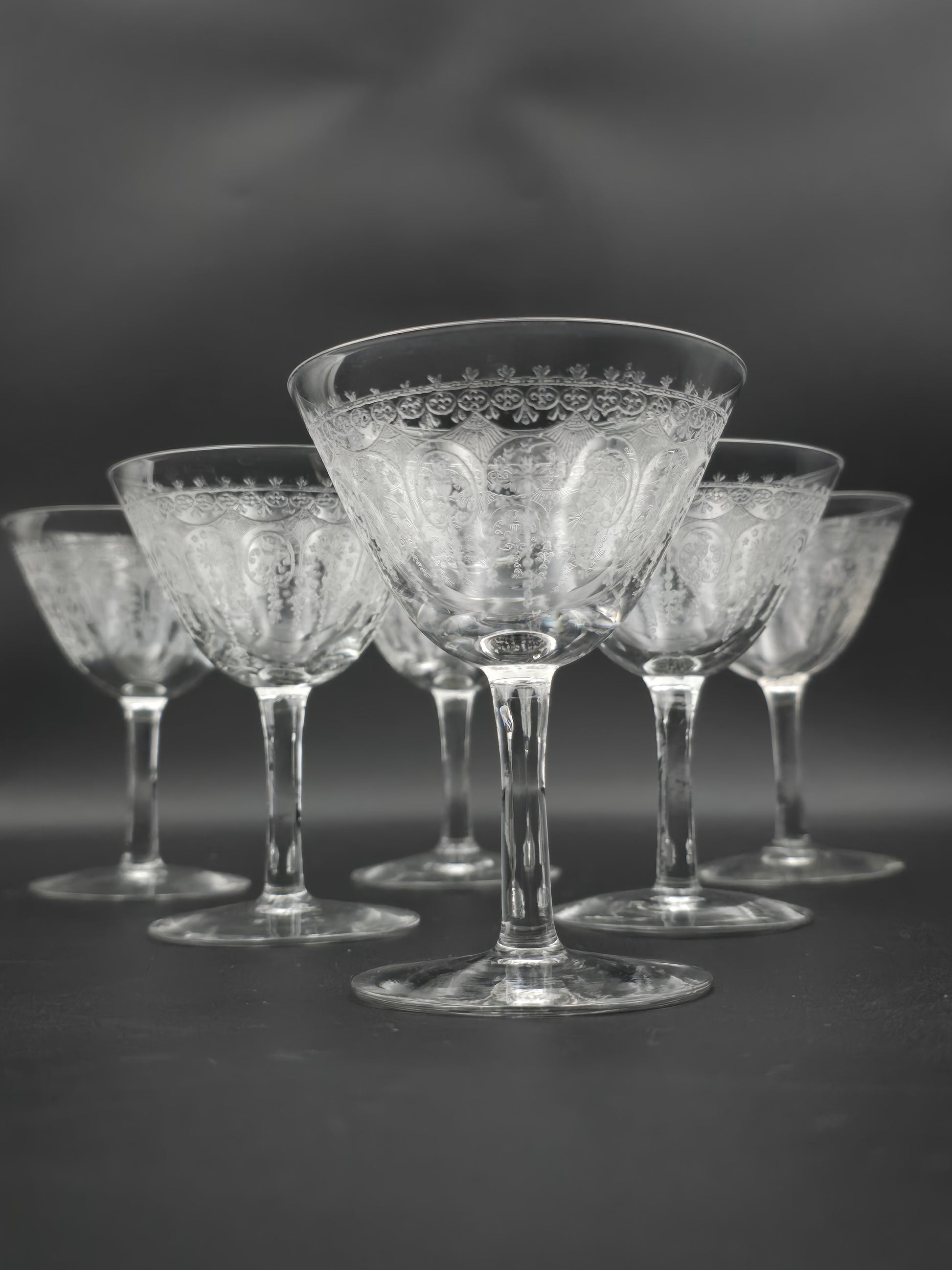 Set of 6 Beautifully etched crystal champagne coupes. 125ml. 11cm tall