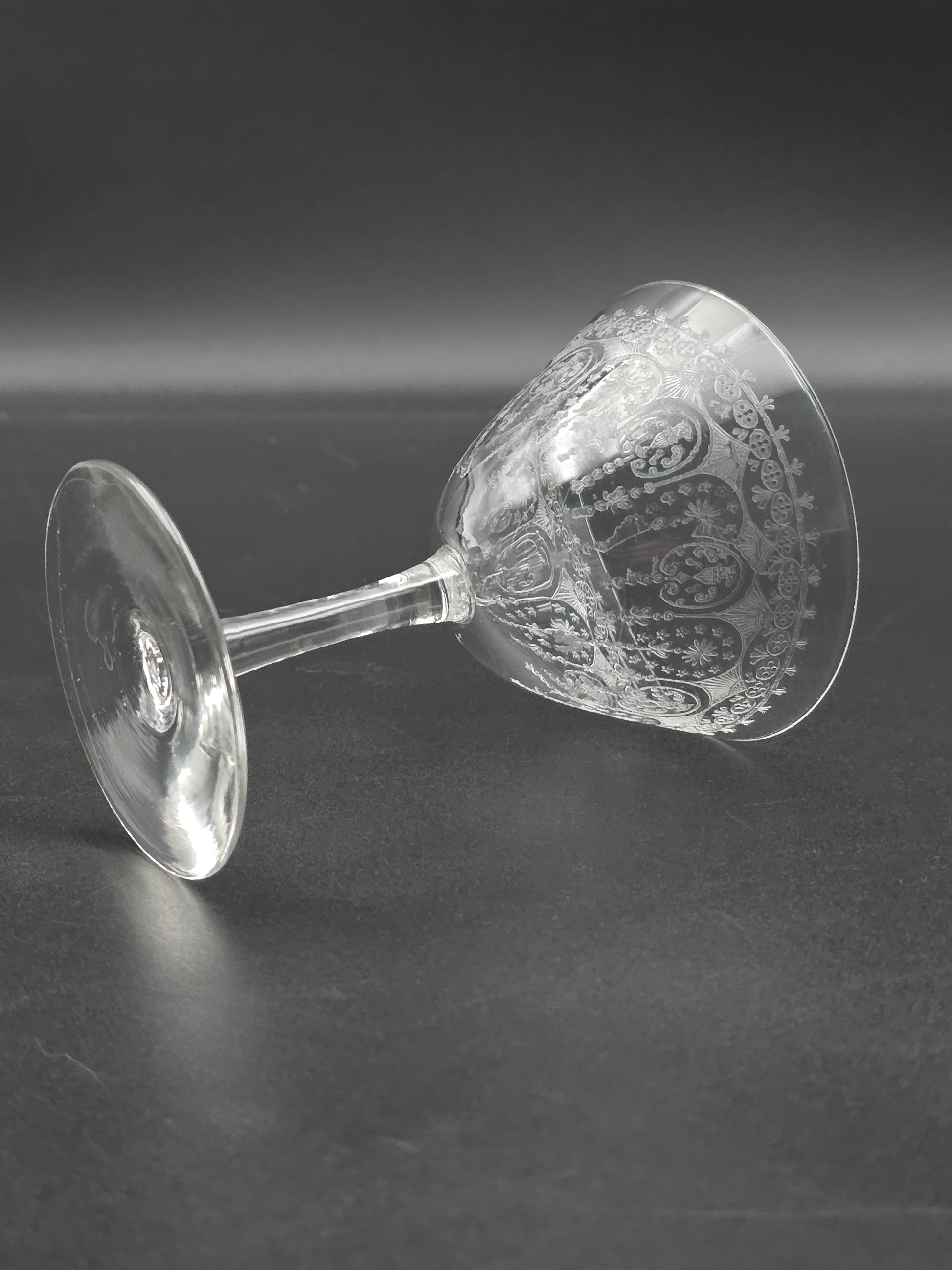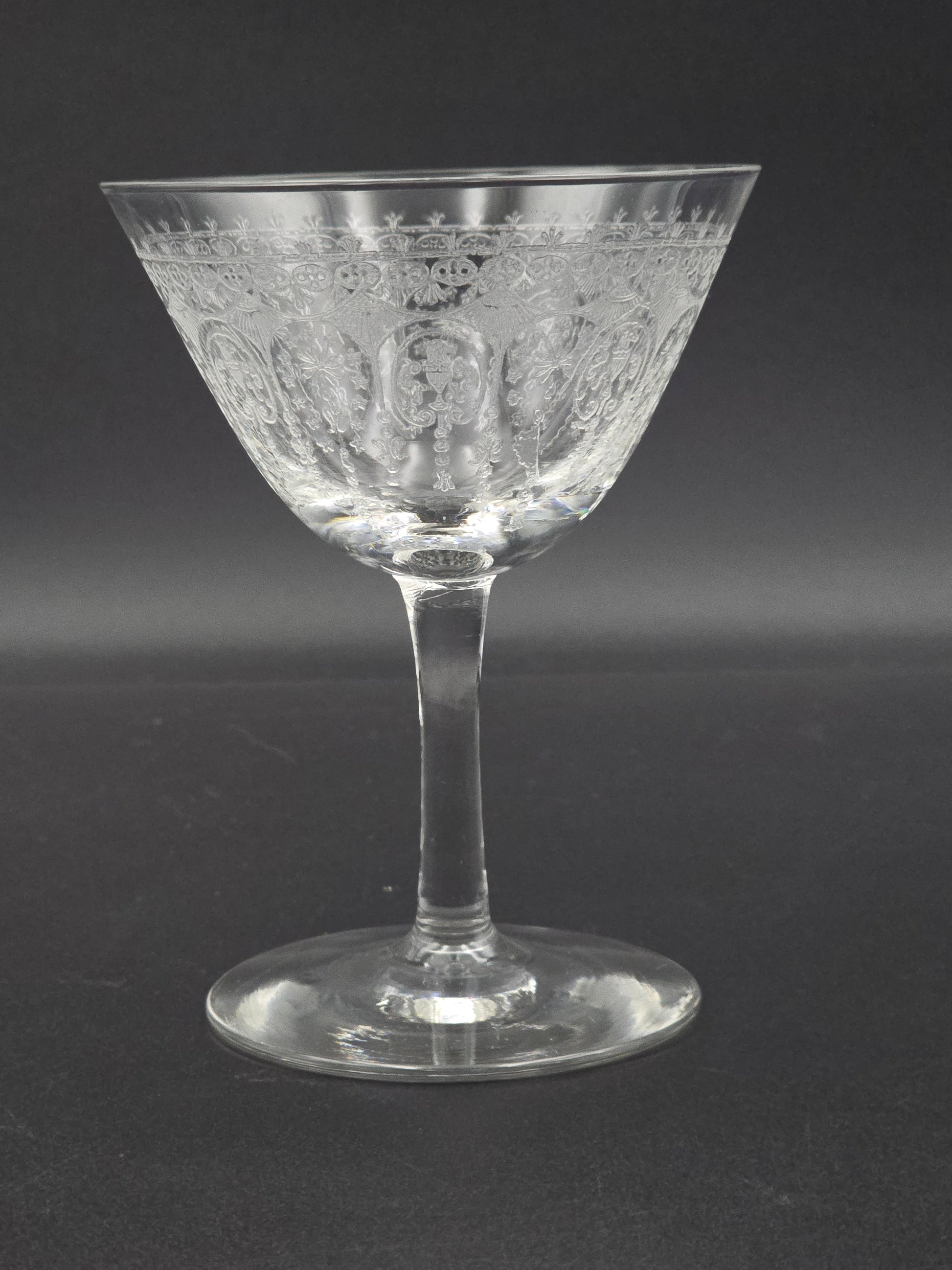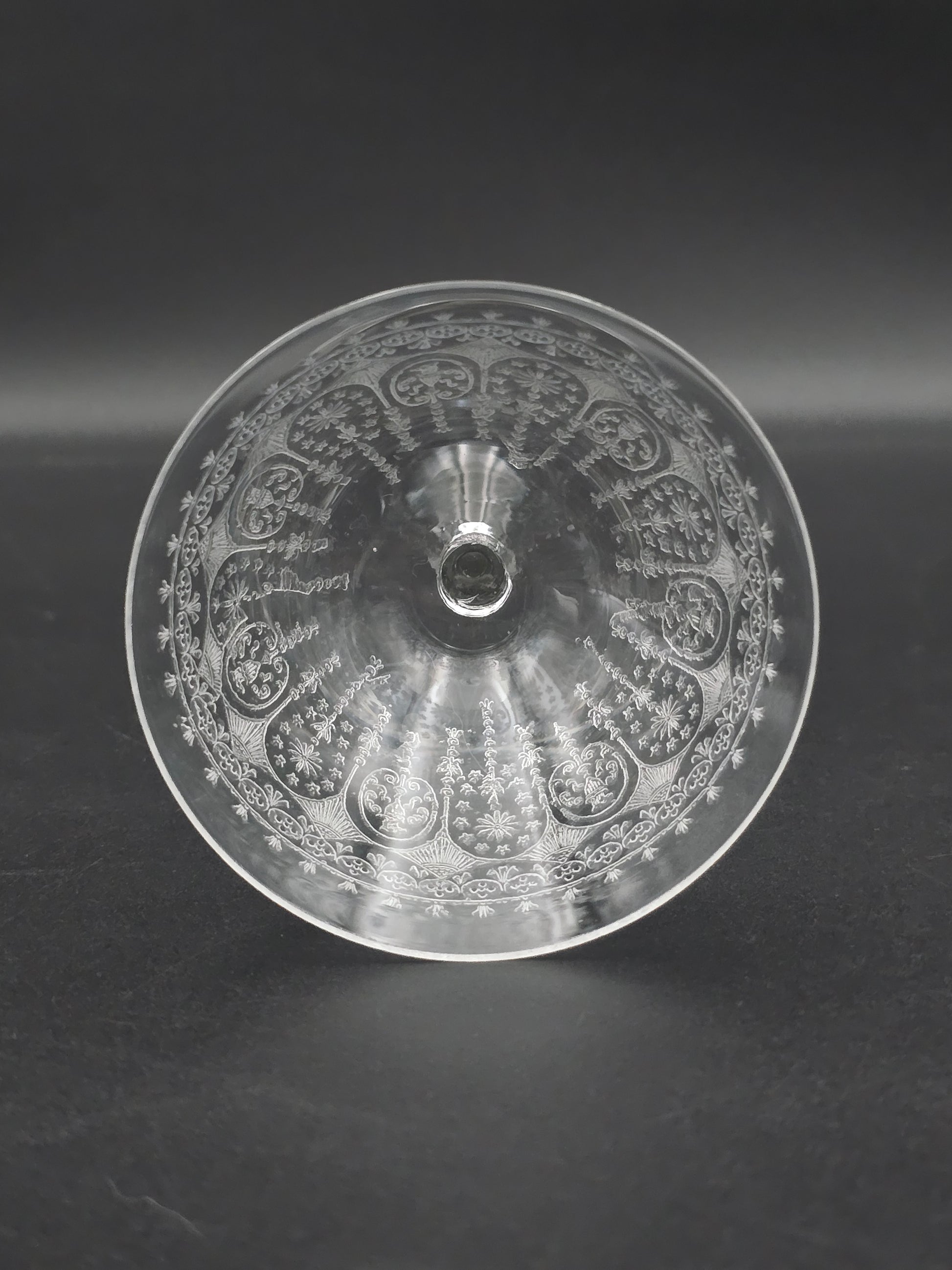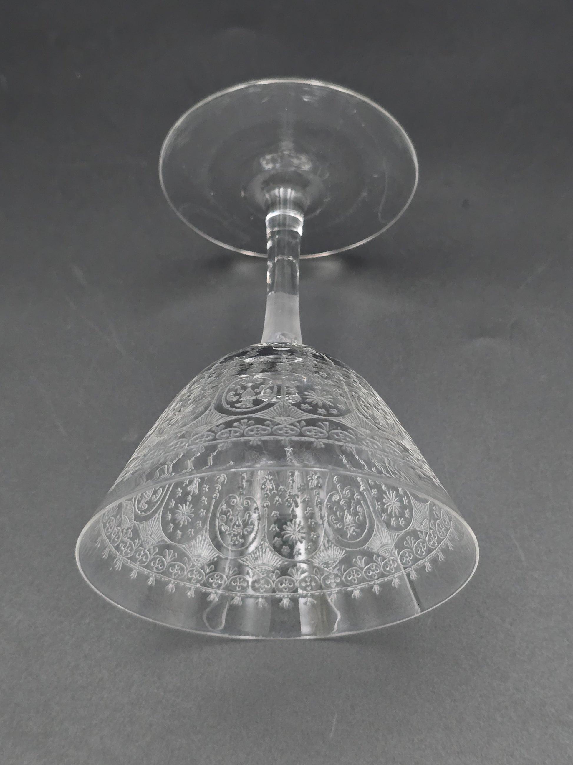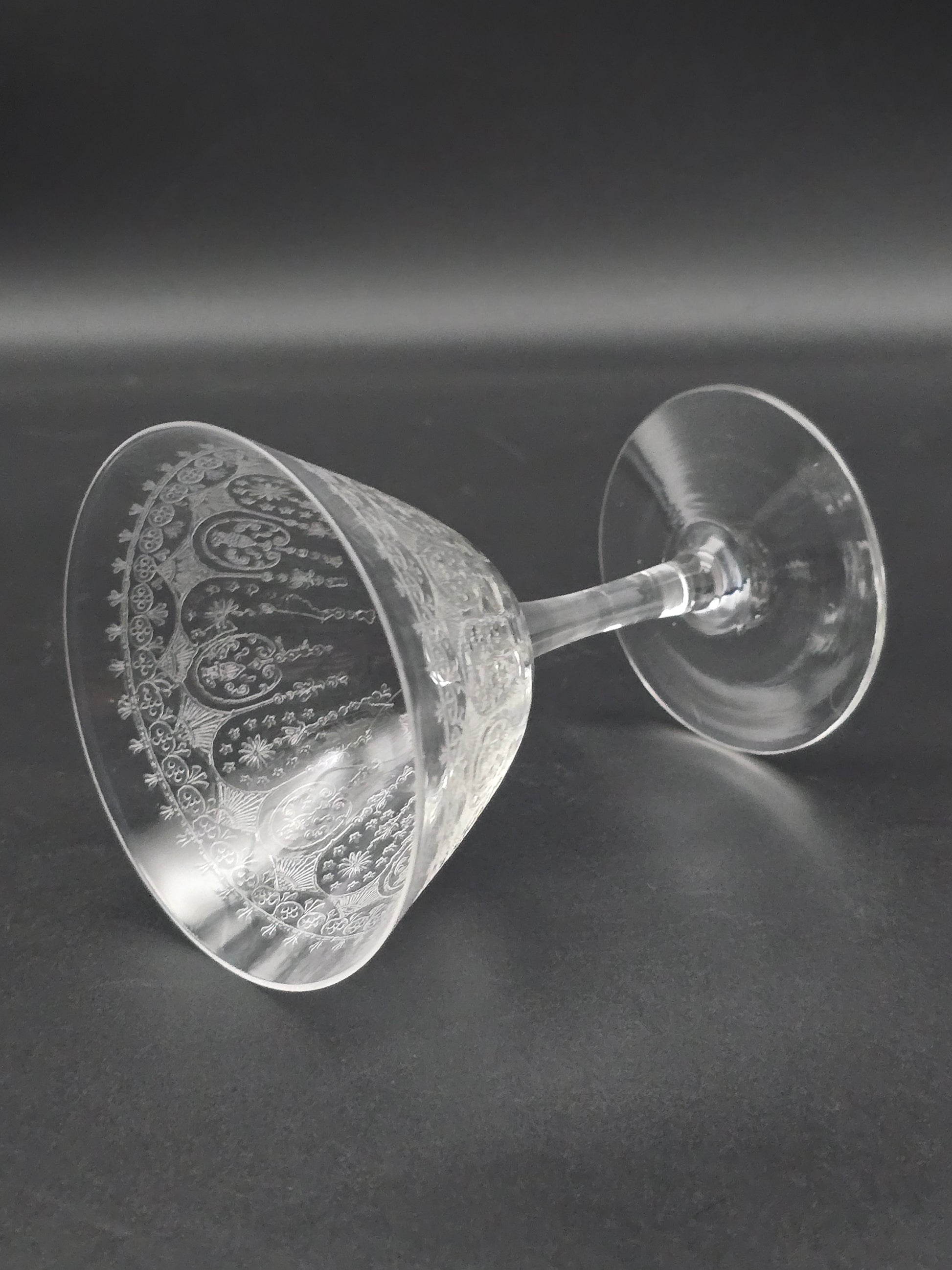 Set of 6 Beautifully etched crystal champagne coupes. 125ml. 11cm tall