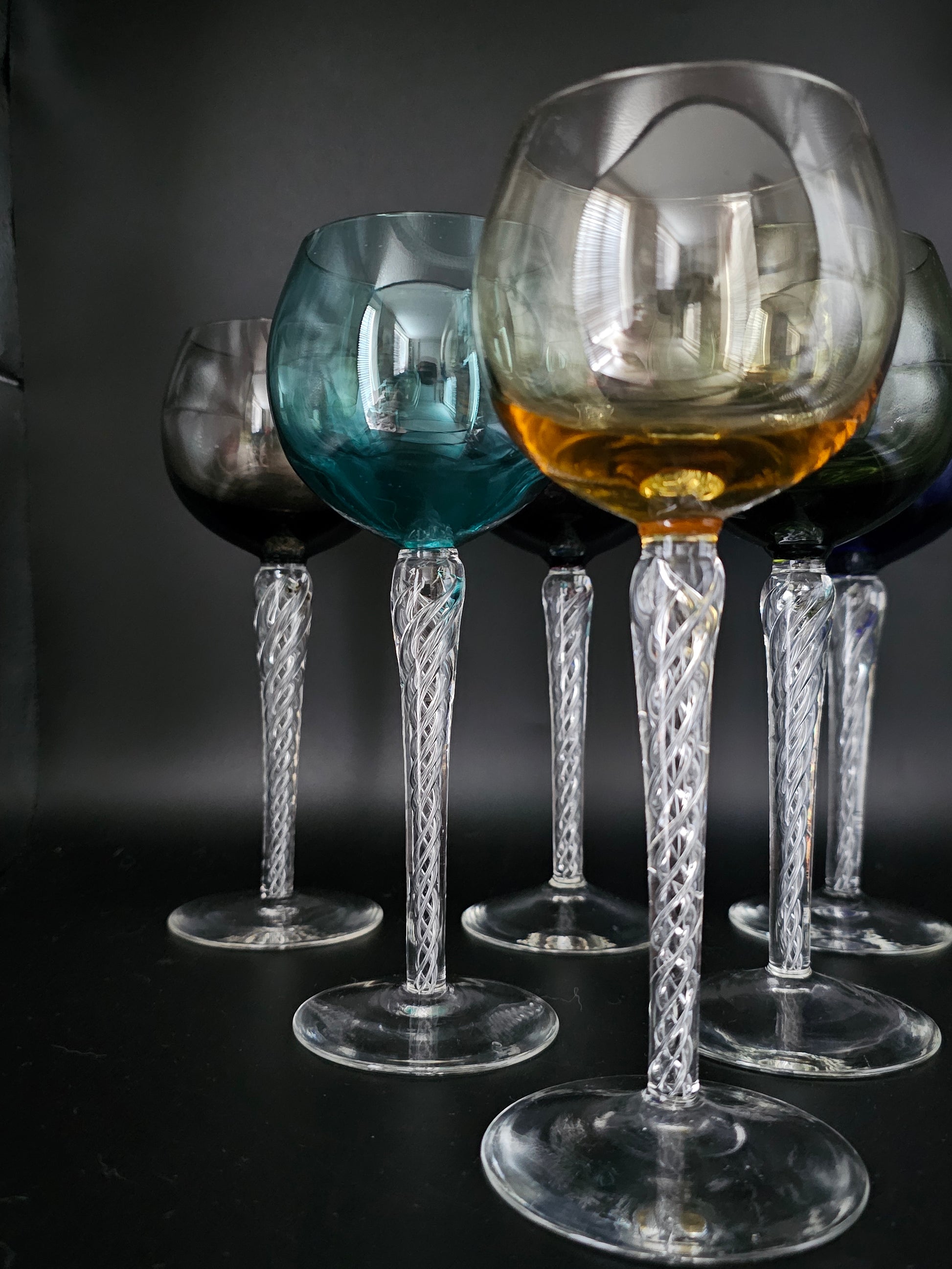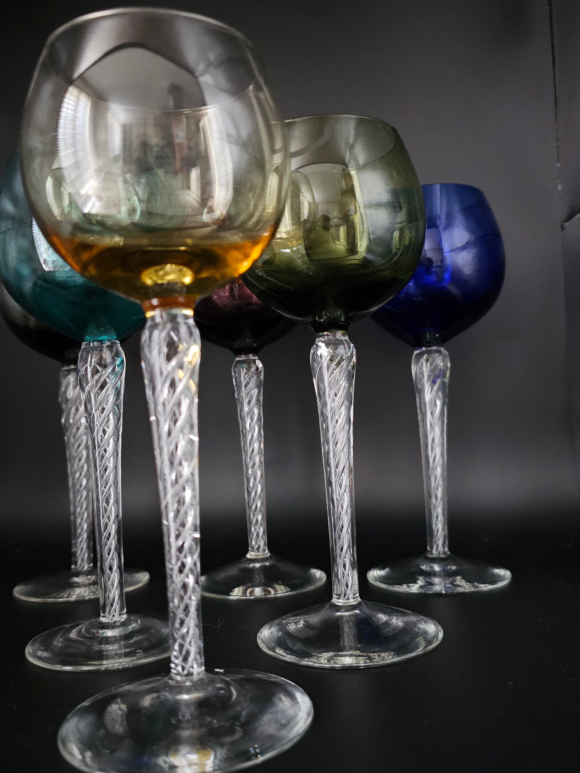 Set of 6 Coloured Air Twist Stem Coloured Crystal Hock Glasses. 250ml