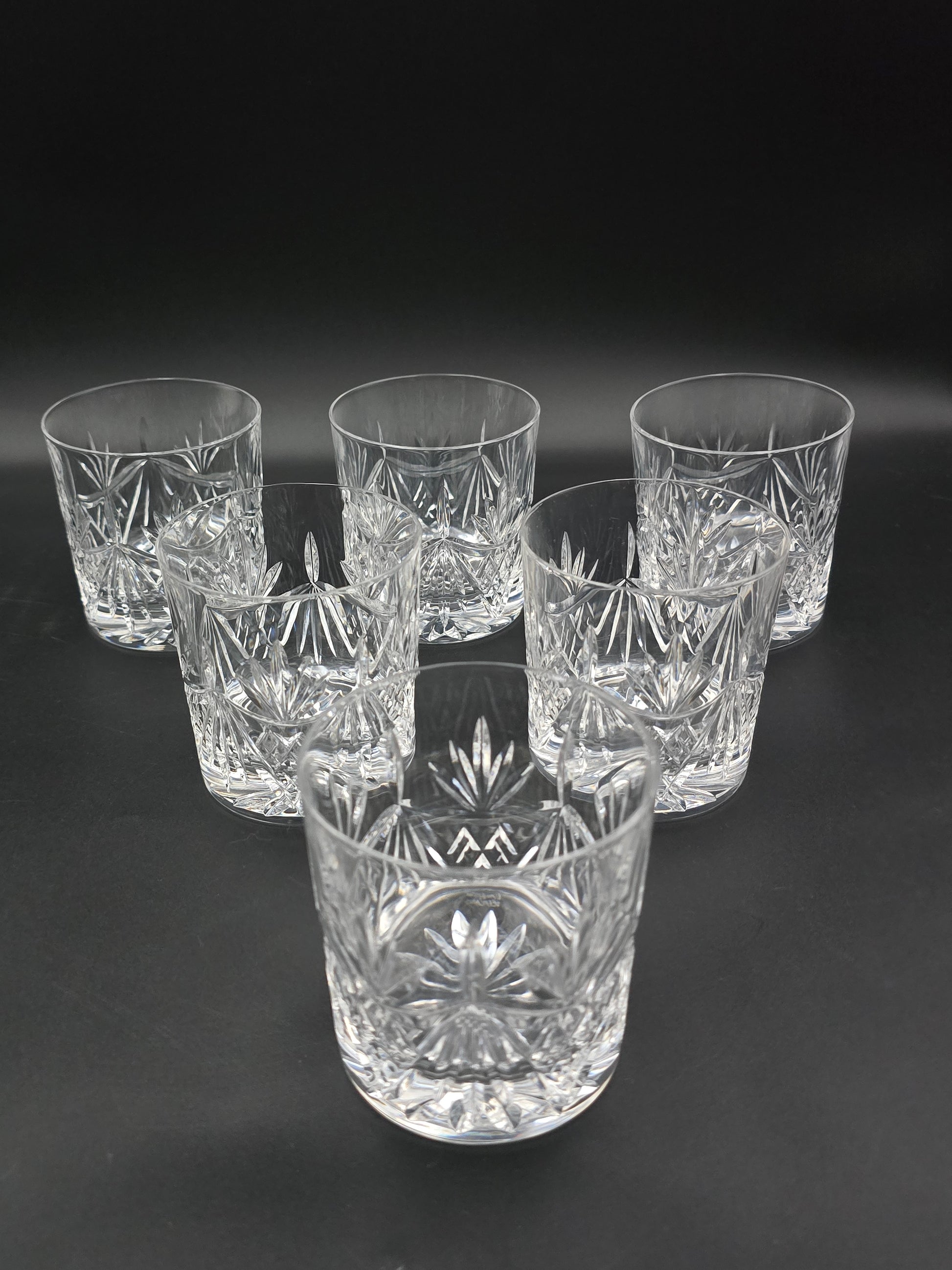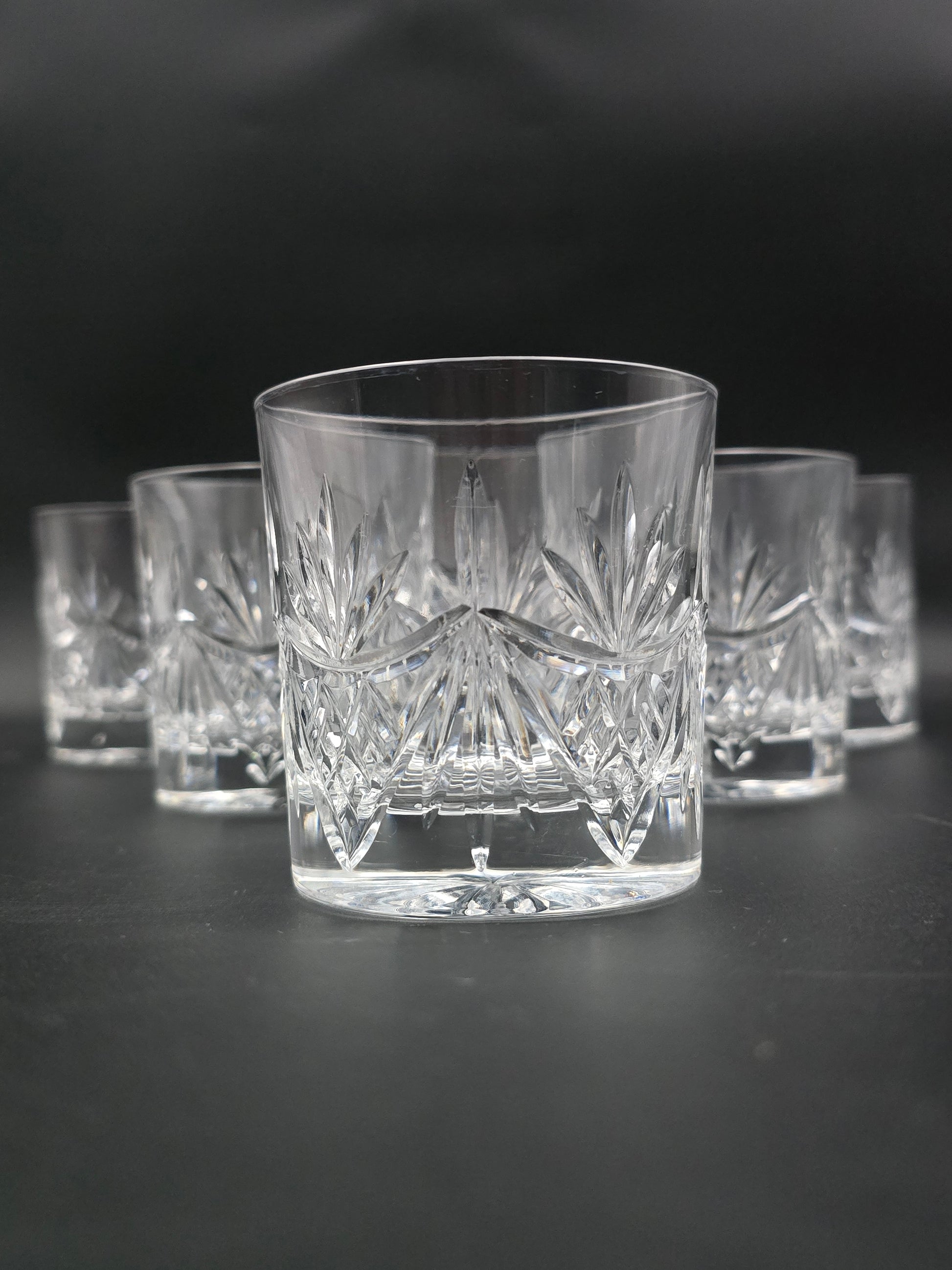 Elegant and timeless, this set of six Edinburgh Crystal Beauly pattern tumblers is a stunning addition to any home bar or crystal collection: