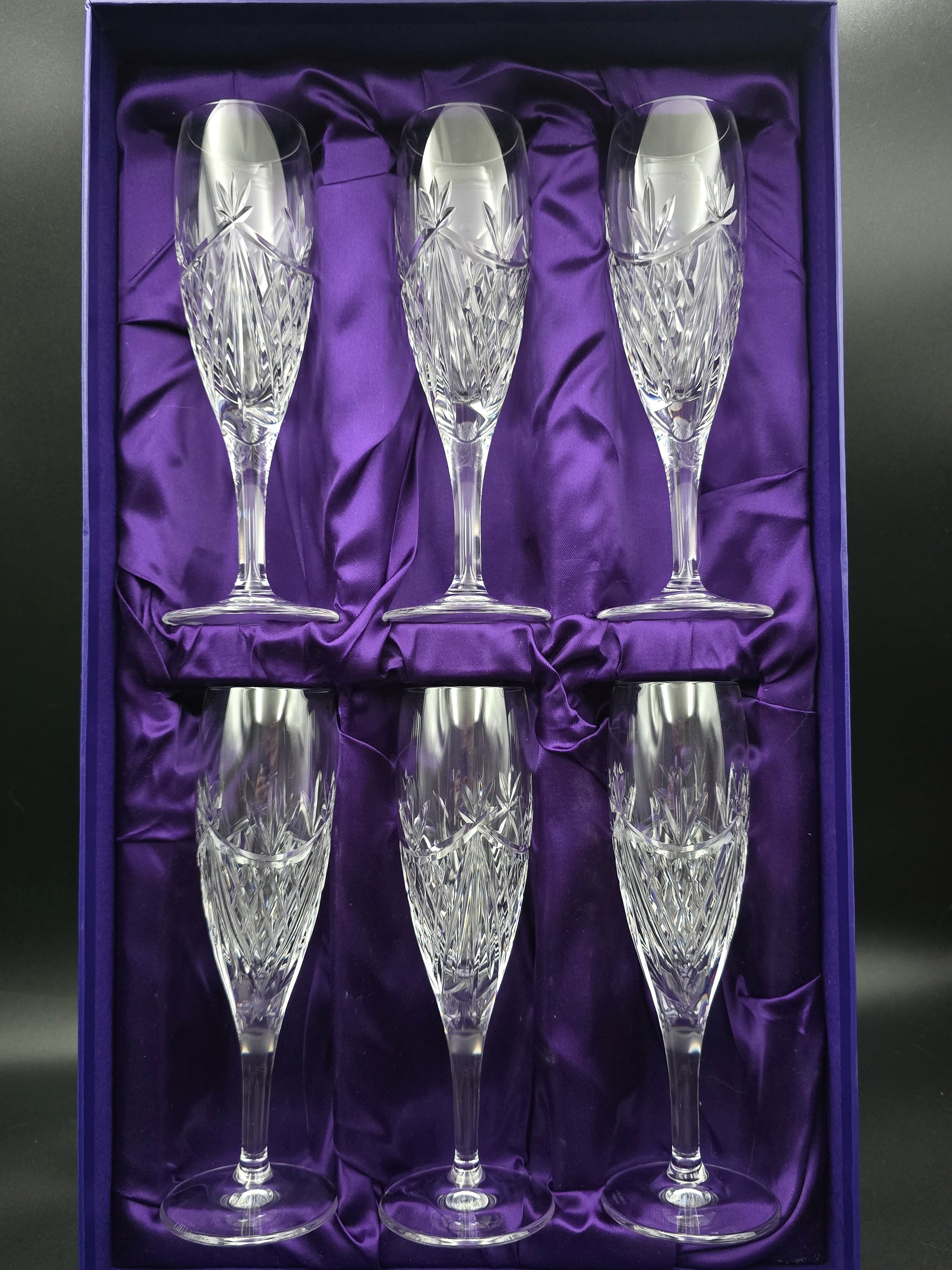 A stunning, complete box set of six Edinburgh Crystal Beauly pattern champagne flutes, all presented in their original branded box—perfect for gifting or elevating any celebration.