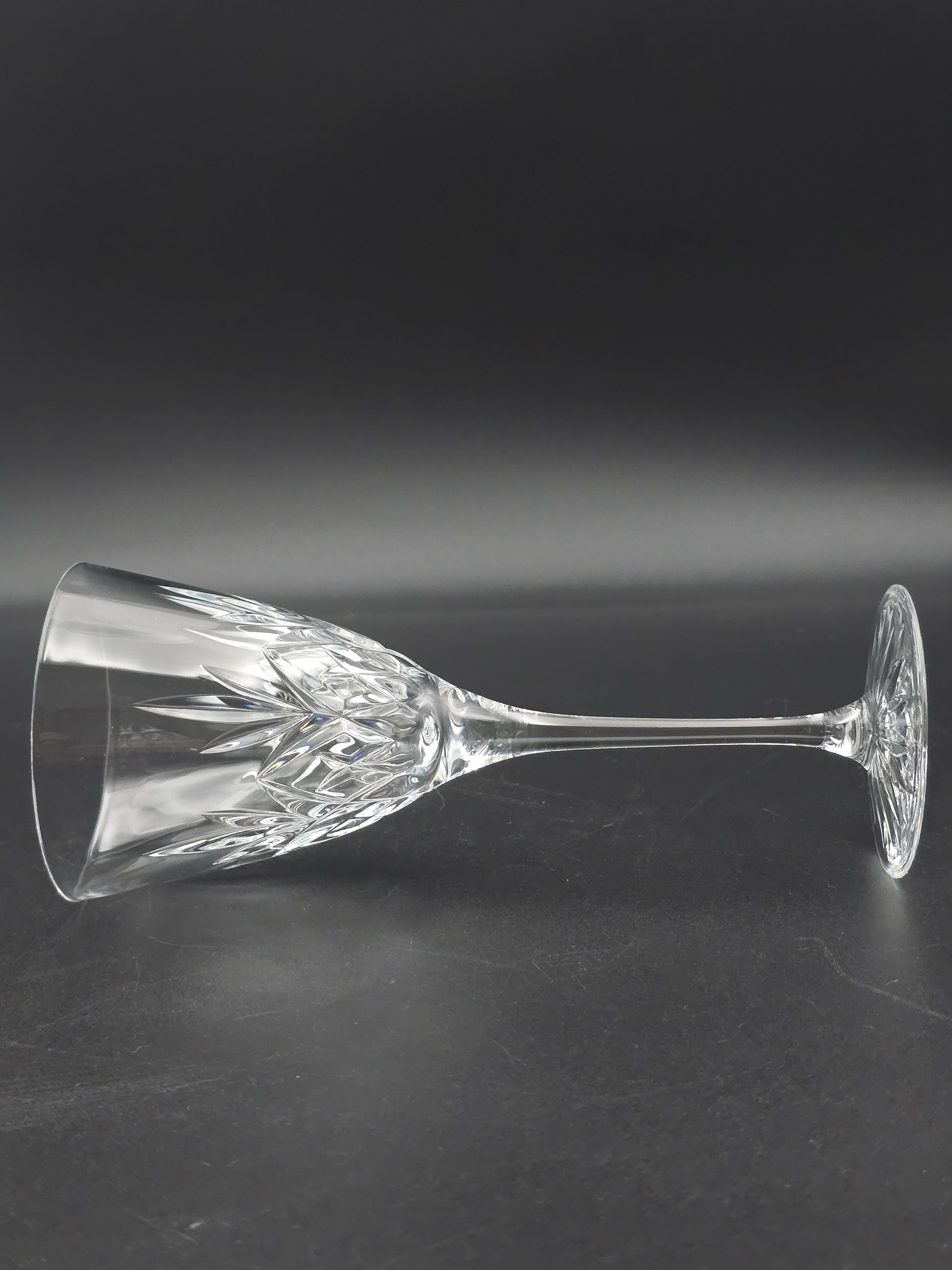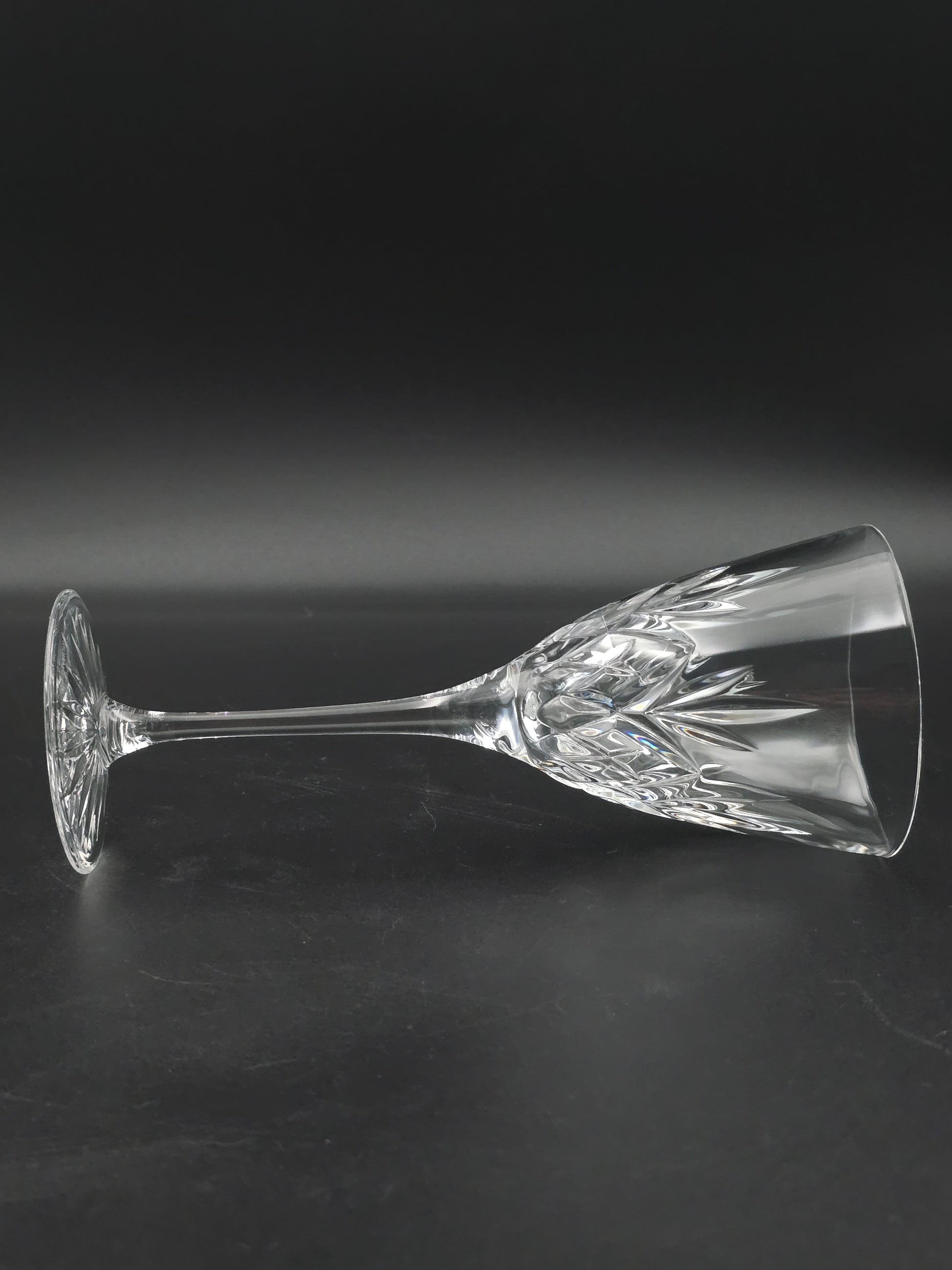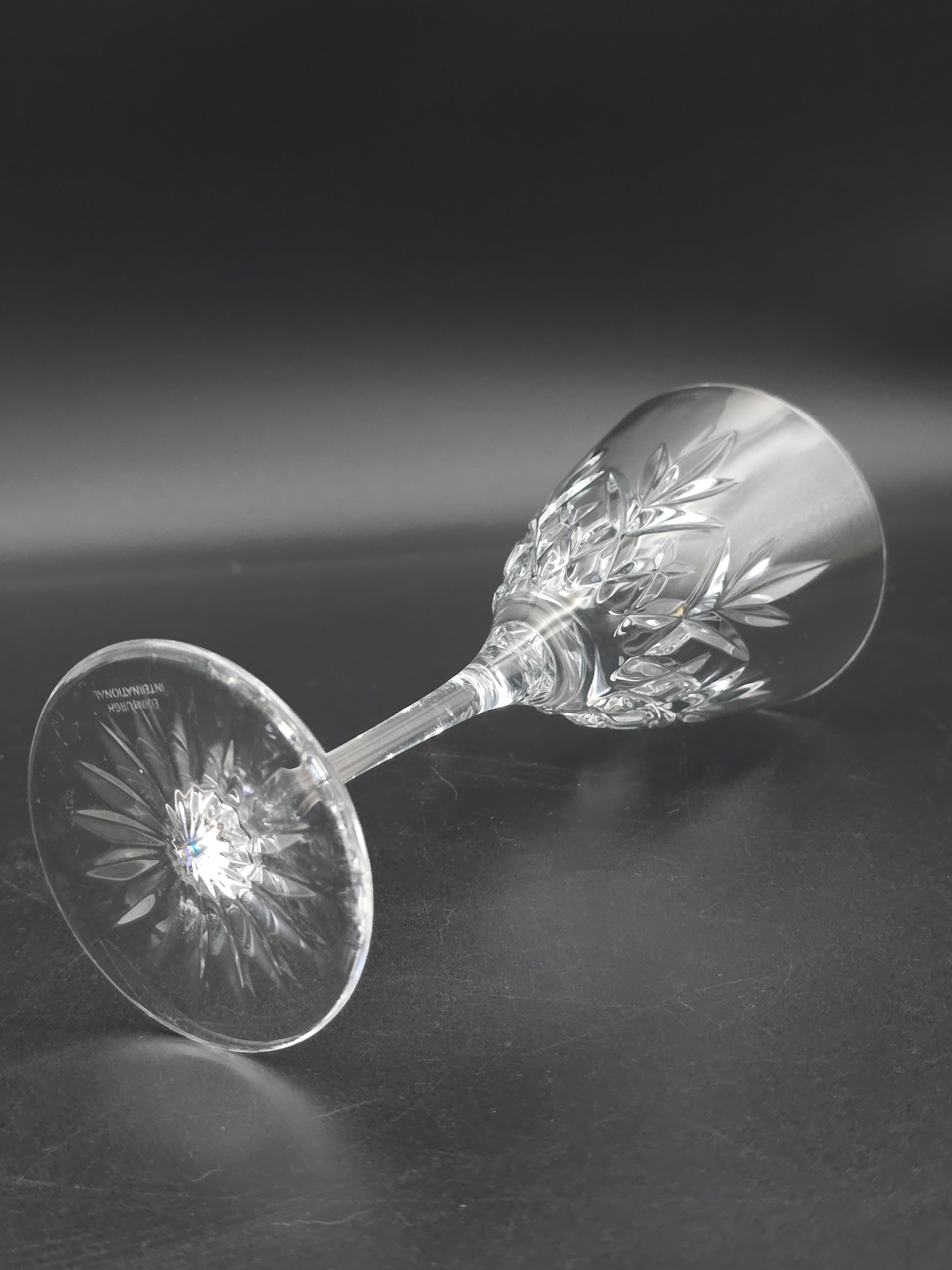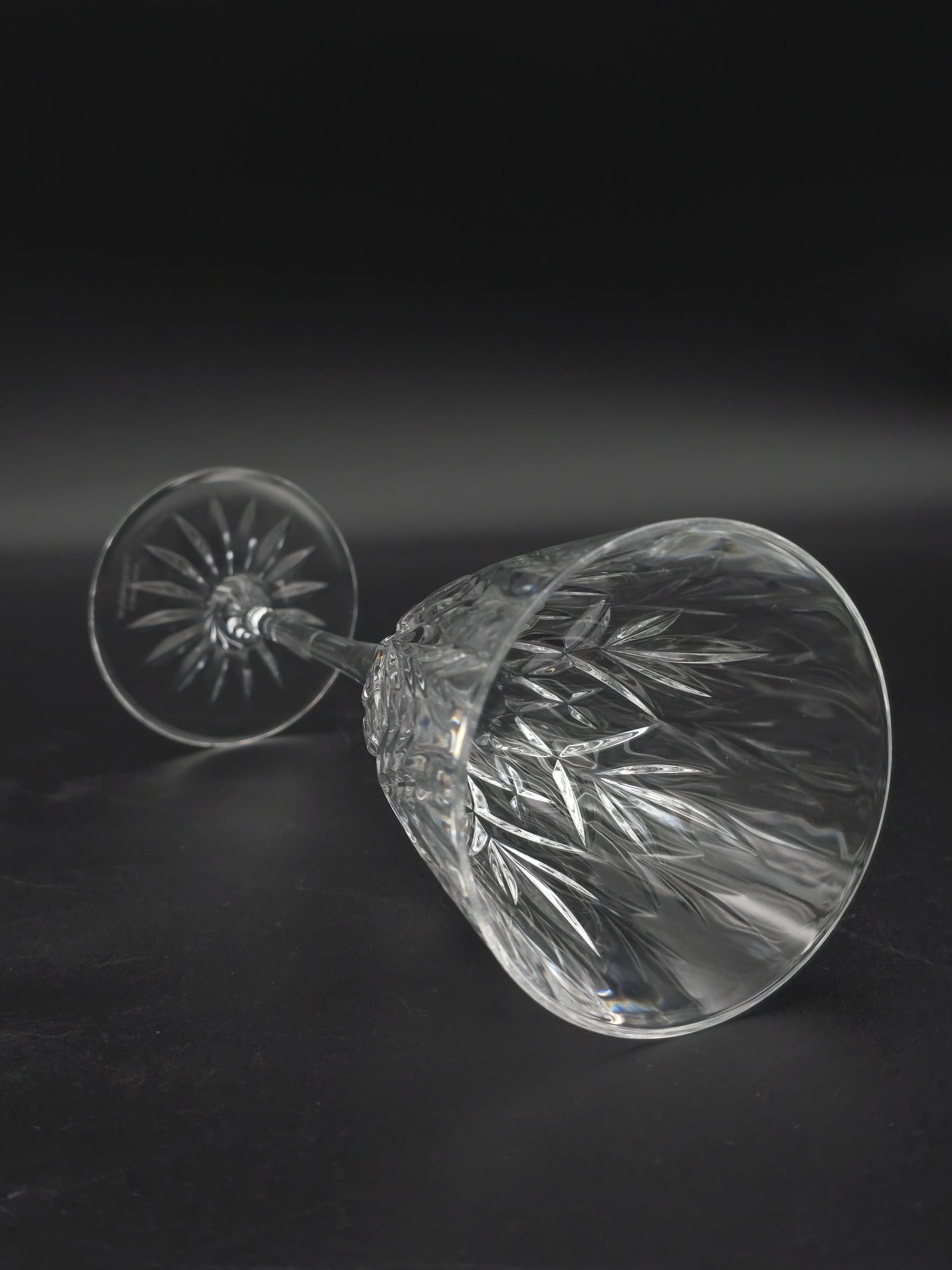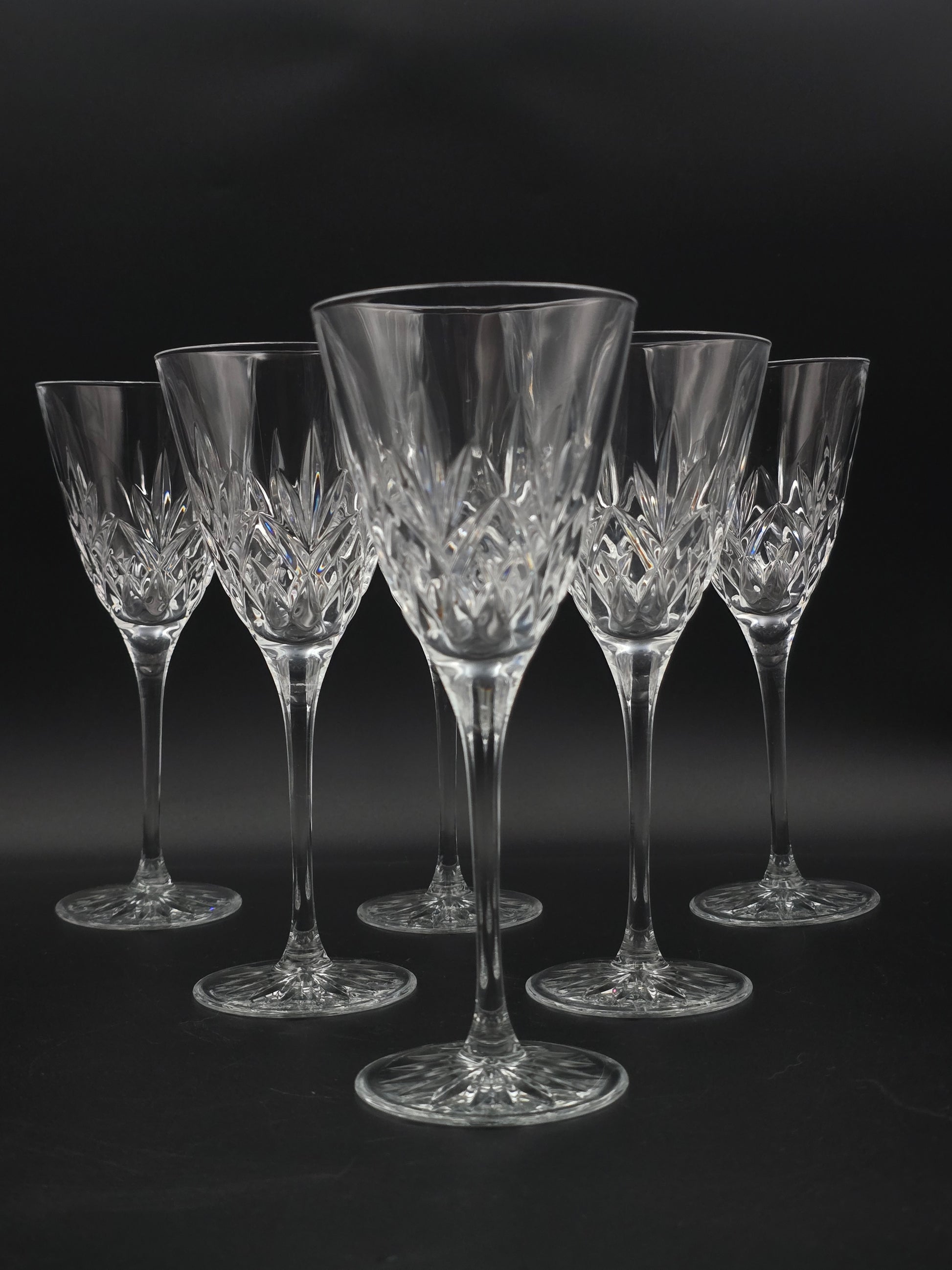 You’re holding a graceful set of six Edinburgh Crystal International “Romeo” wine glasses, each crafted in Scotland during the late 20th century—likely between the 1960s and early 2000s, before the original Edinburgh Crystal company entered administration in 2006.