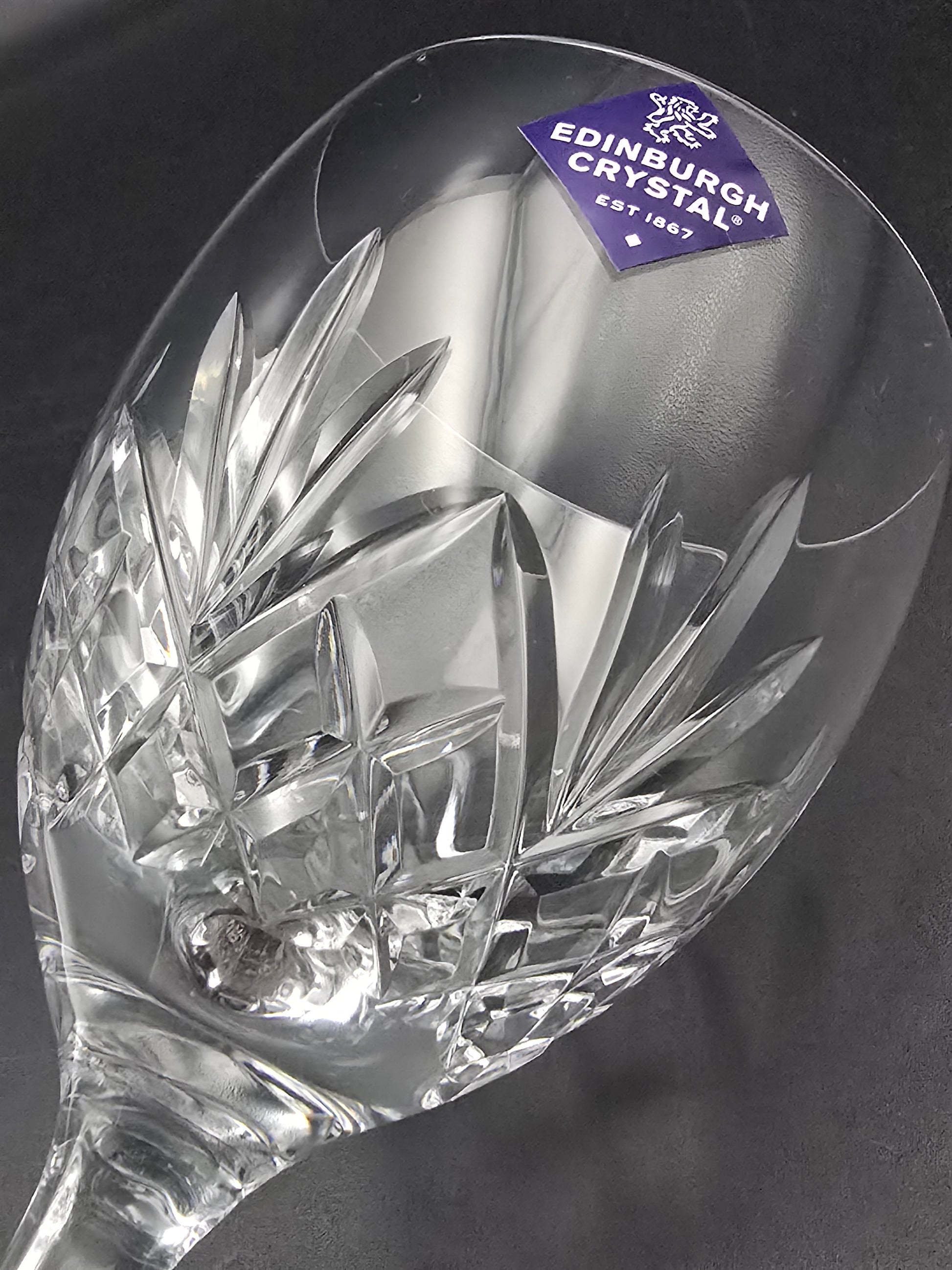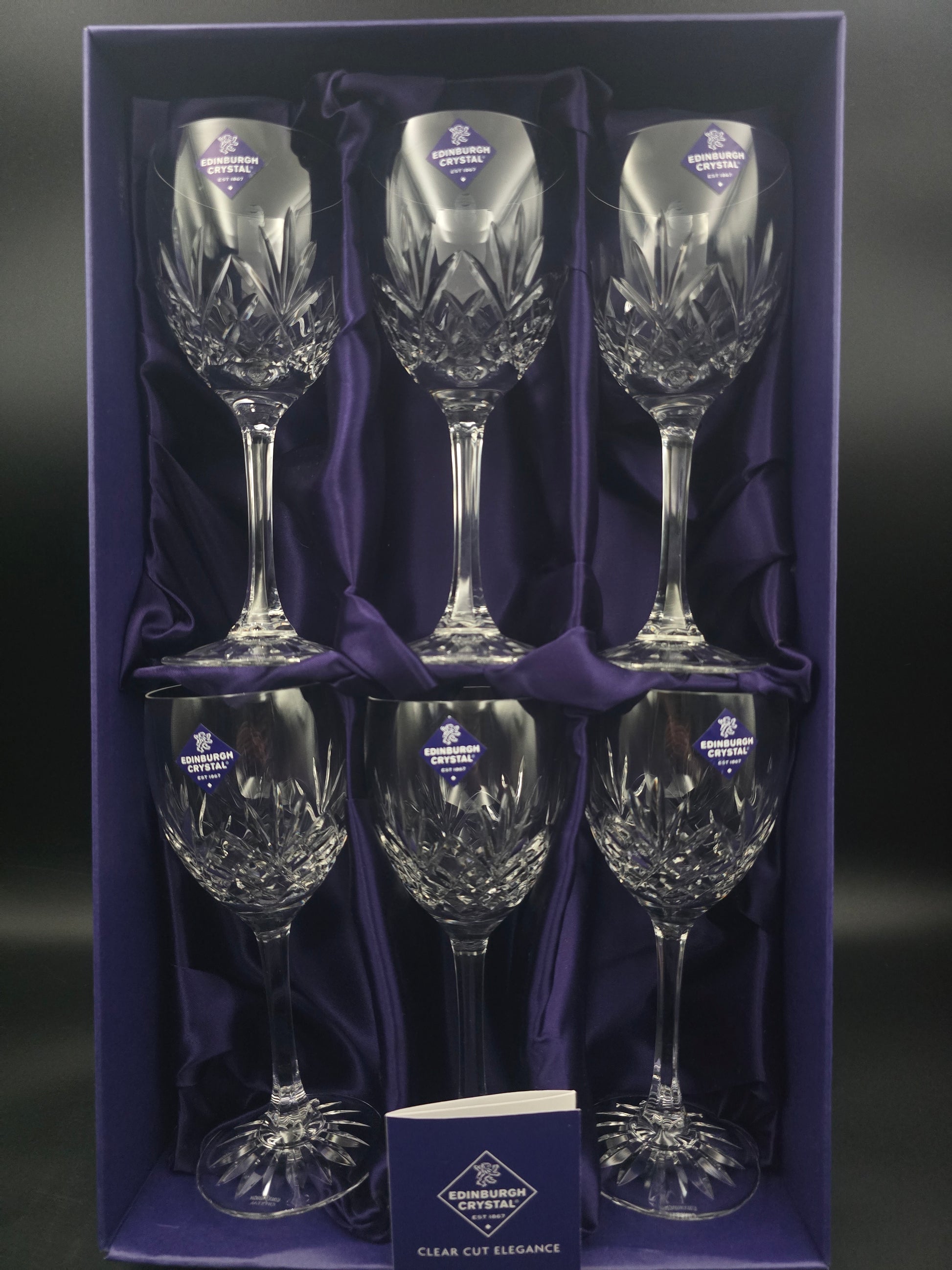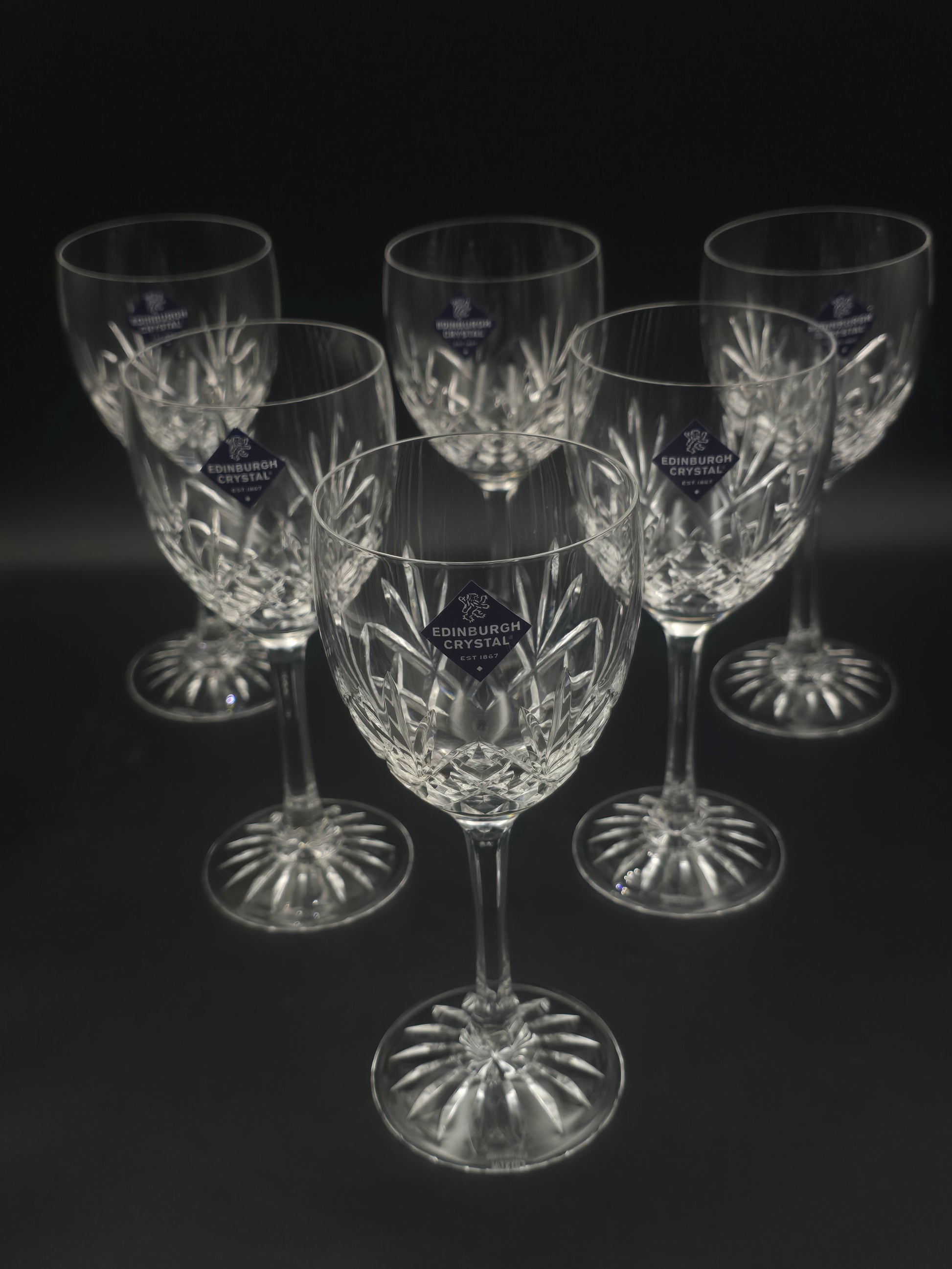 These are brand new and come complete in their original Edinburgh Crystal presentation box. All six glasses still retain their original Edinburgh Crystal stickers on the bowl, a mark of their unused, pristine condition.