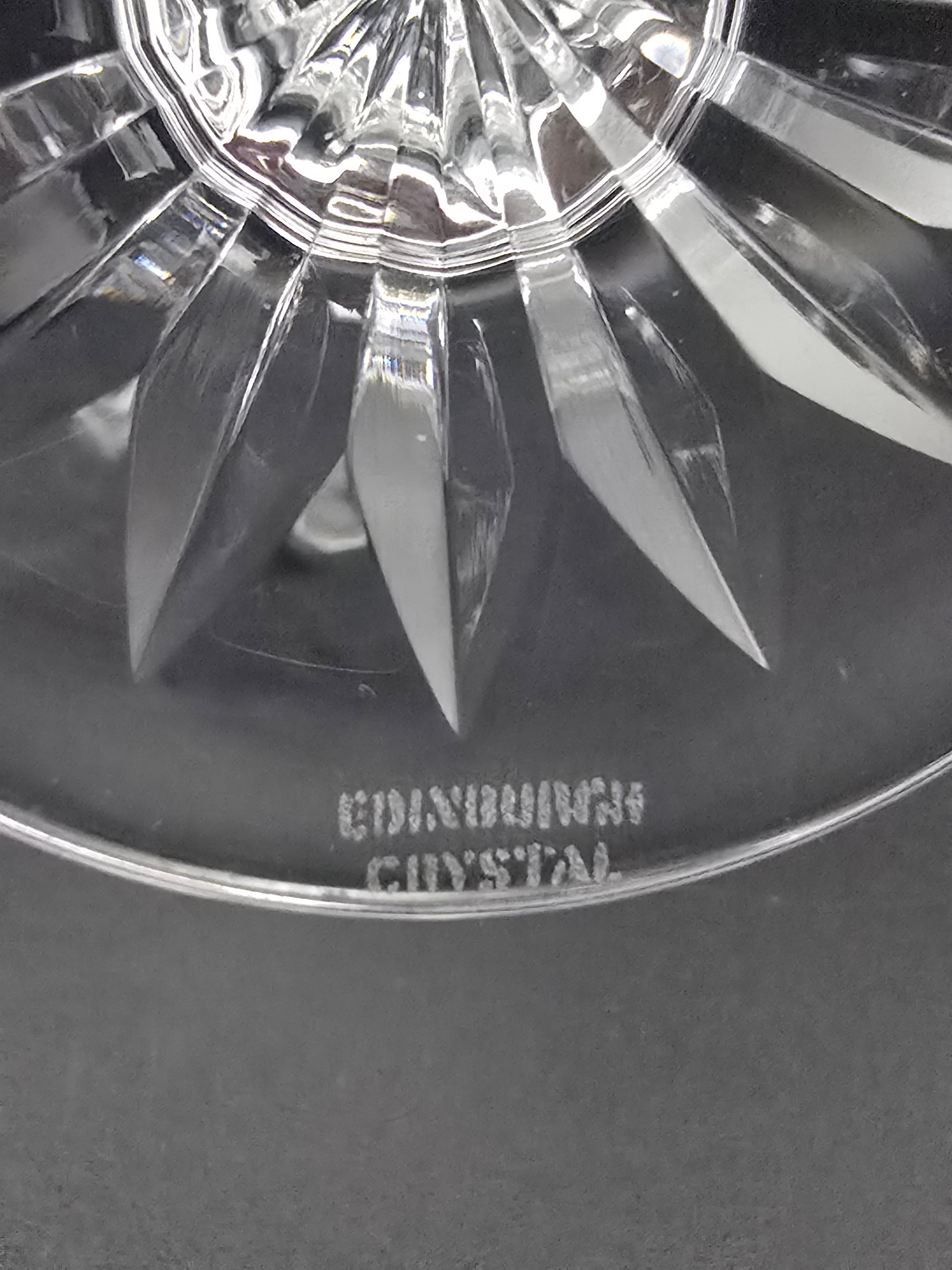 Each glass features the later etched Edinburgh Crystal mark to the base, cut into a classic starburst design, and the elegant textured stem adds both grip and a refined look in the hand.