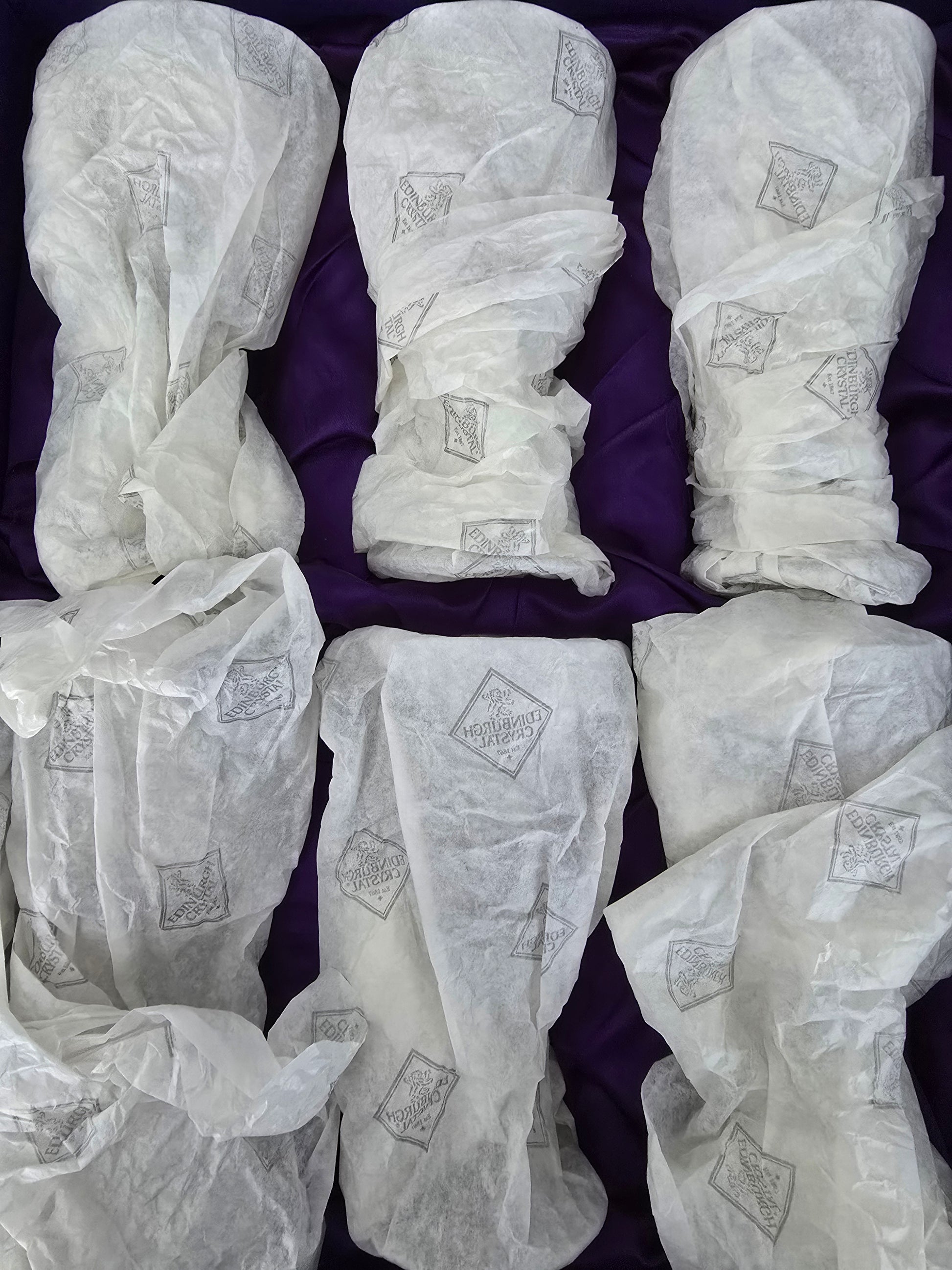 All six glasses come supplied in their original blue Edinburgh Crystal presentation box, lined with original tissue paper.