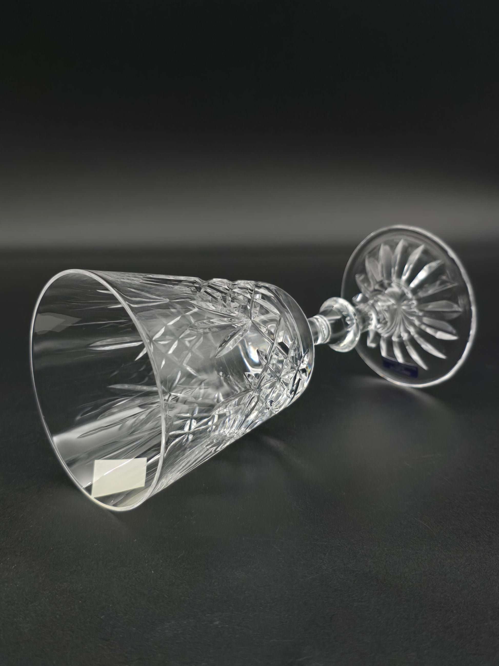 A rare and pristine set of six genuine Edinburgh Crystal wine glasses in the elegant and traditional Lomond pattern — beautifully presented in their original branded box, complete with the original tissue paper.