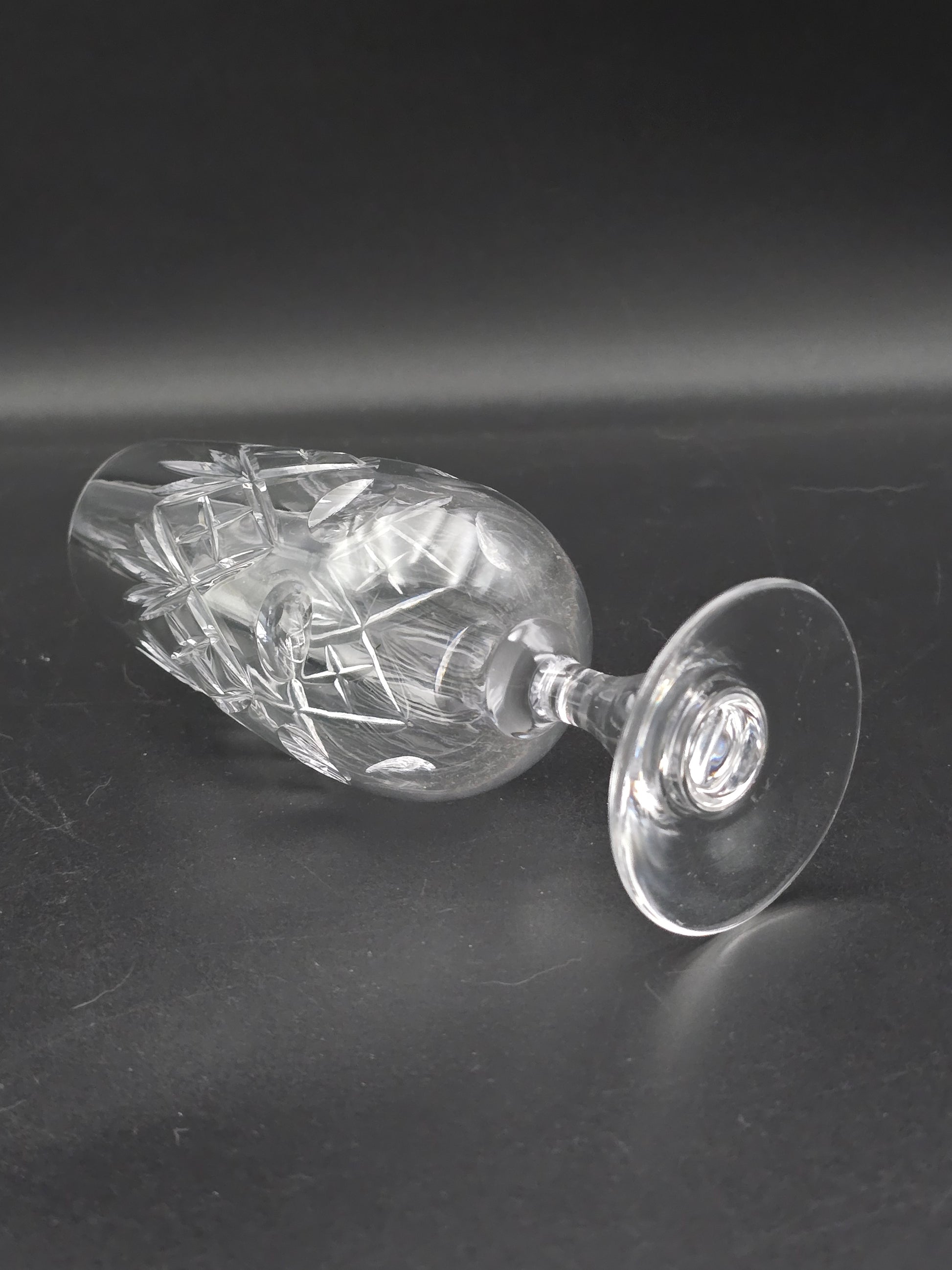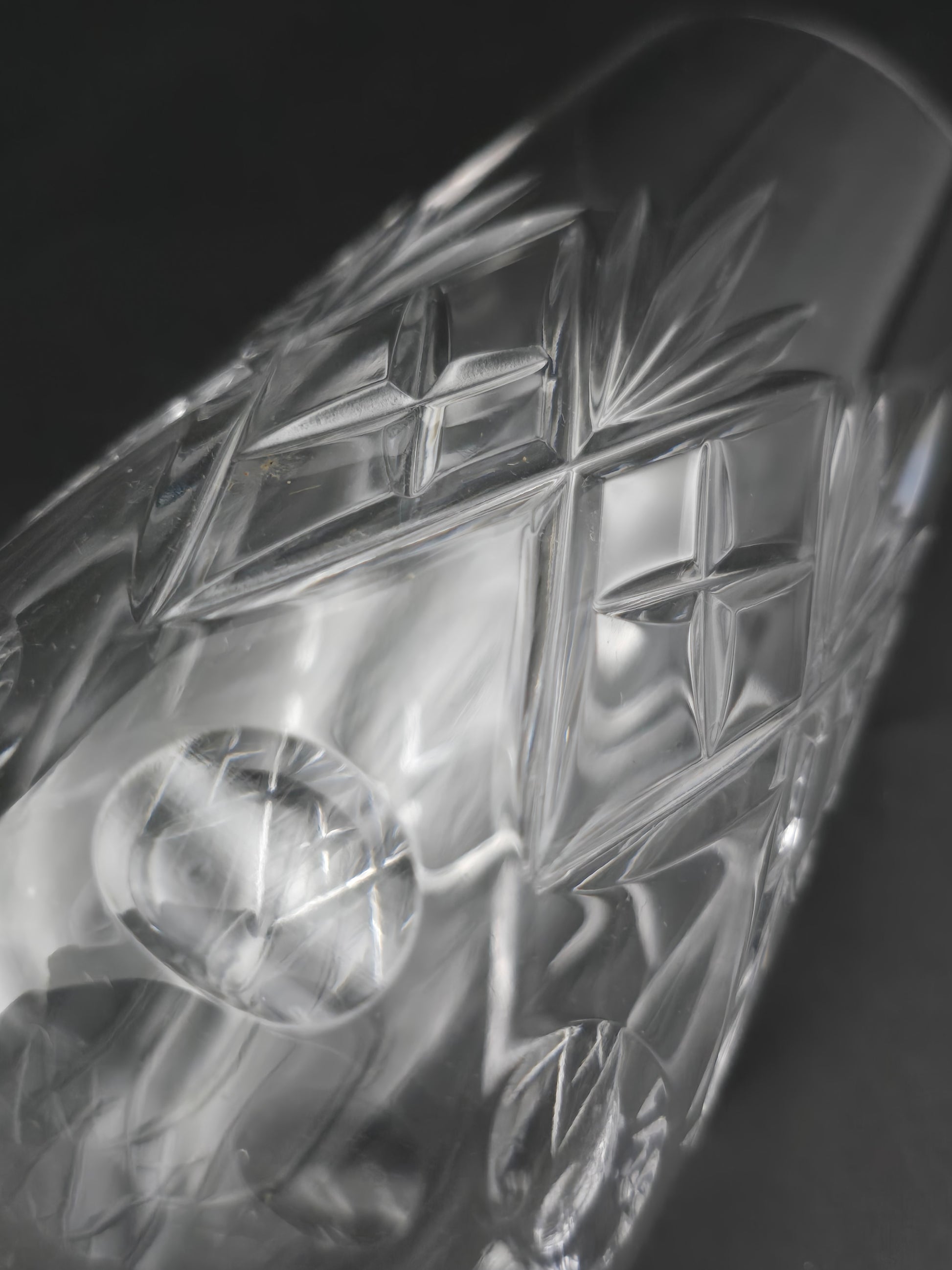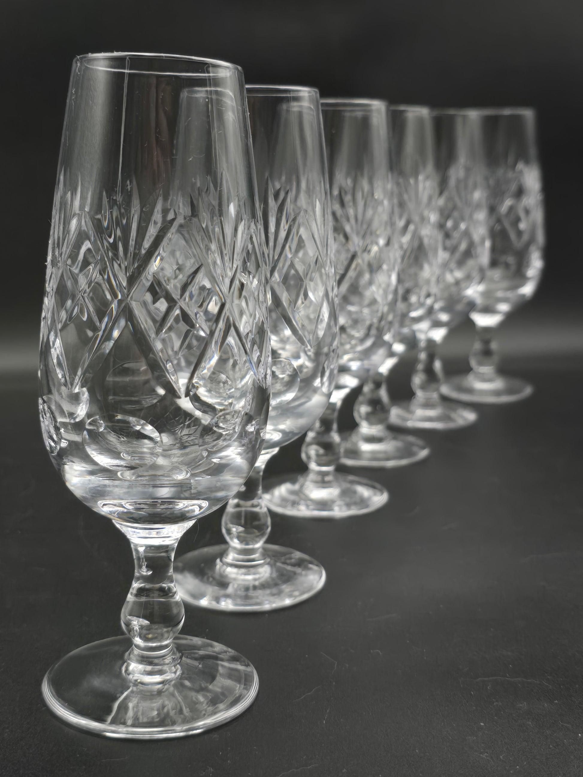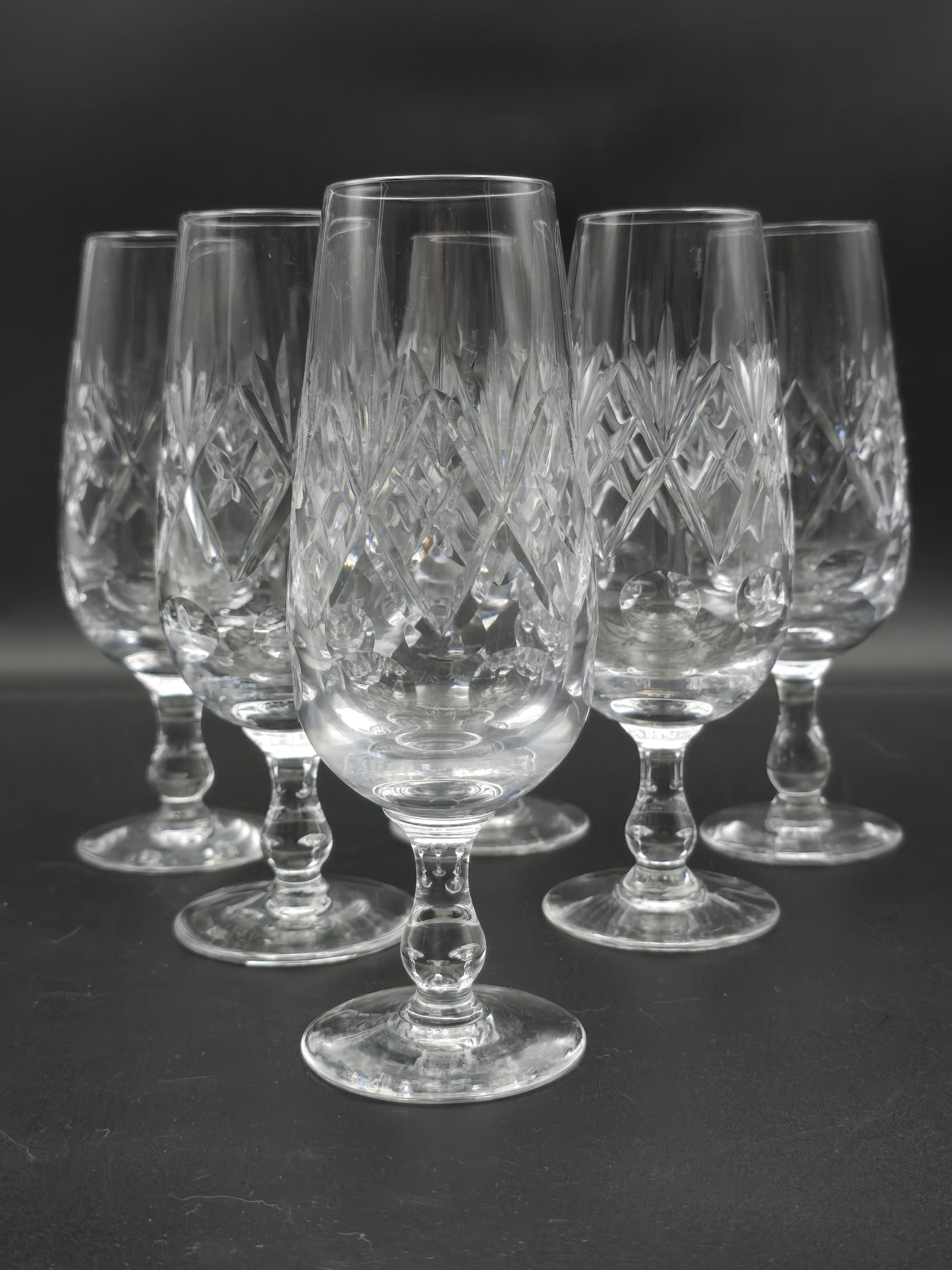 With a 200ml capacity, these short stemmed crystal flutes feature intricate crosses, flutes, and disc patterns on a teardrop stem.