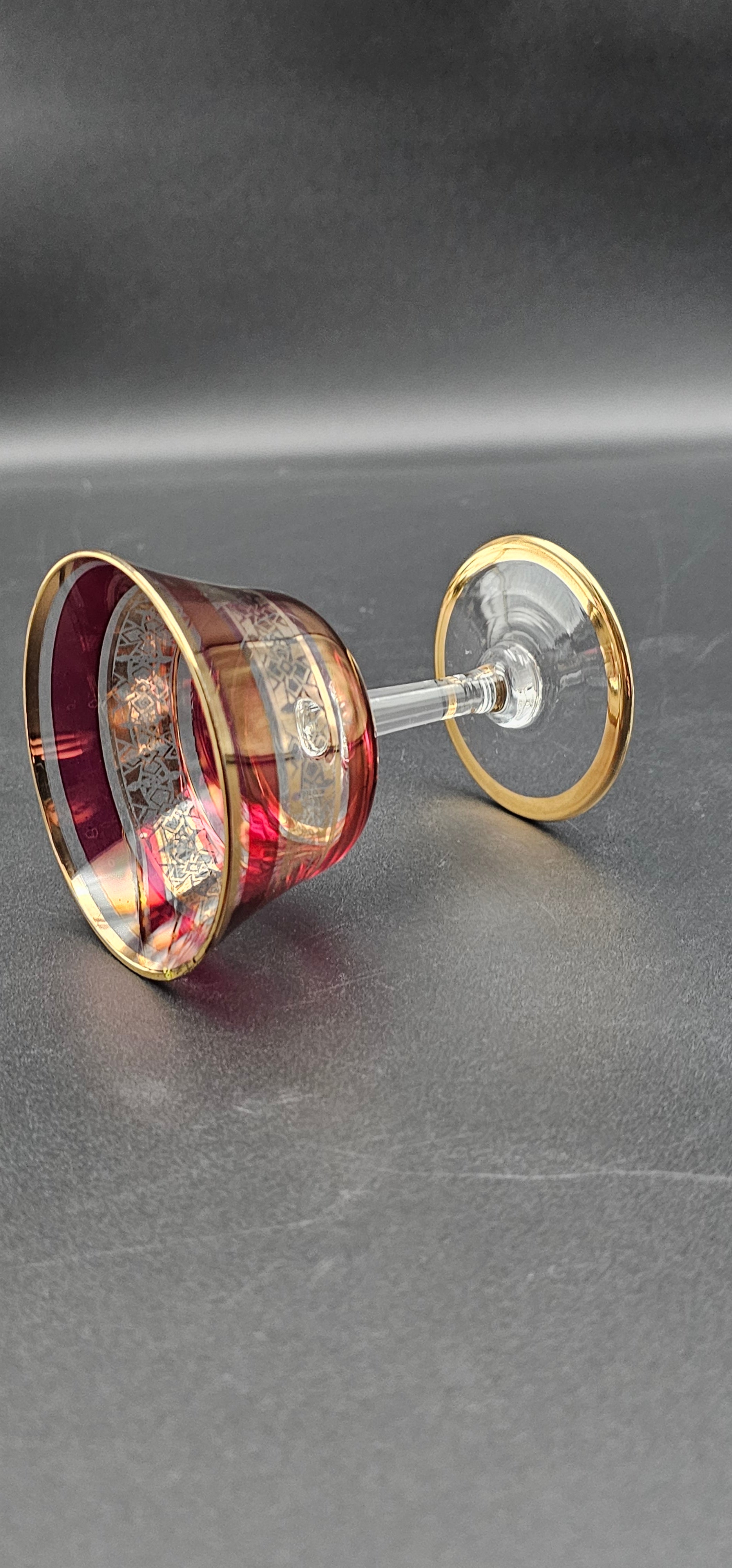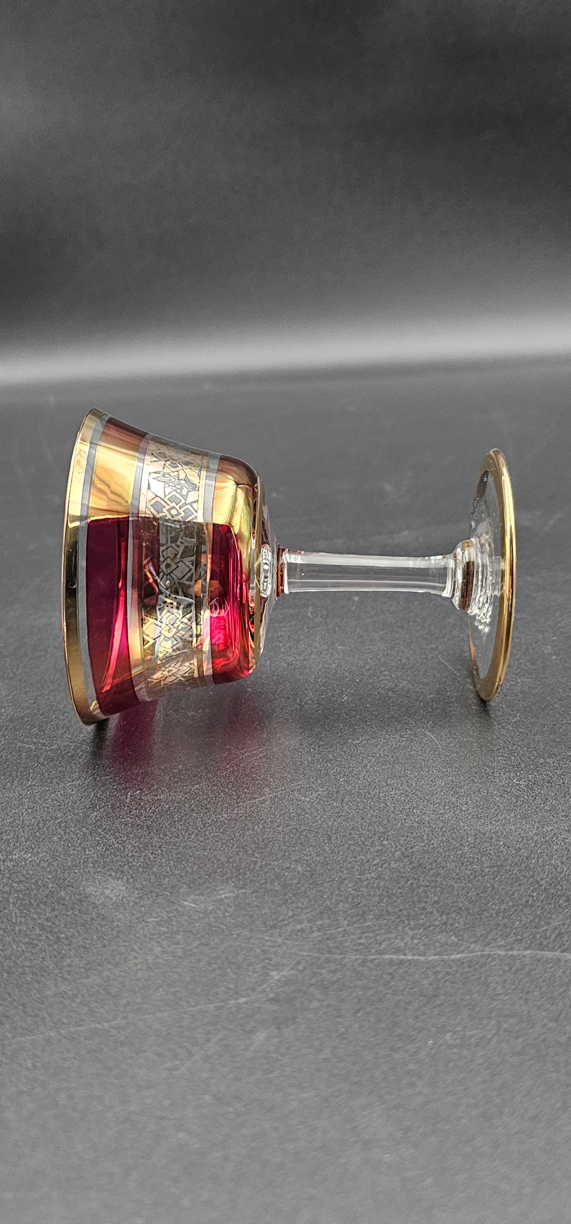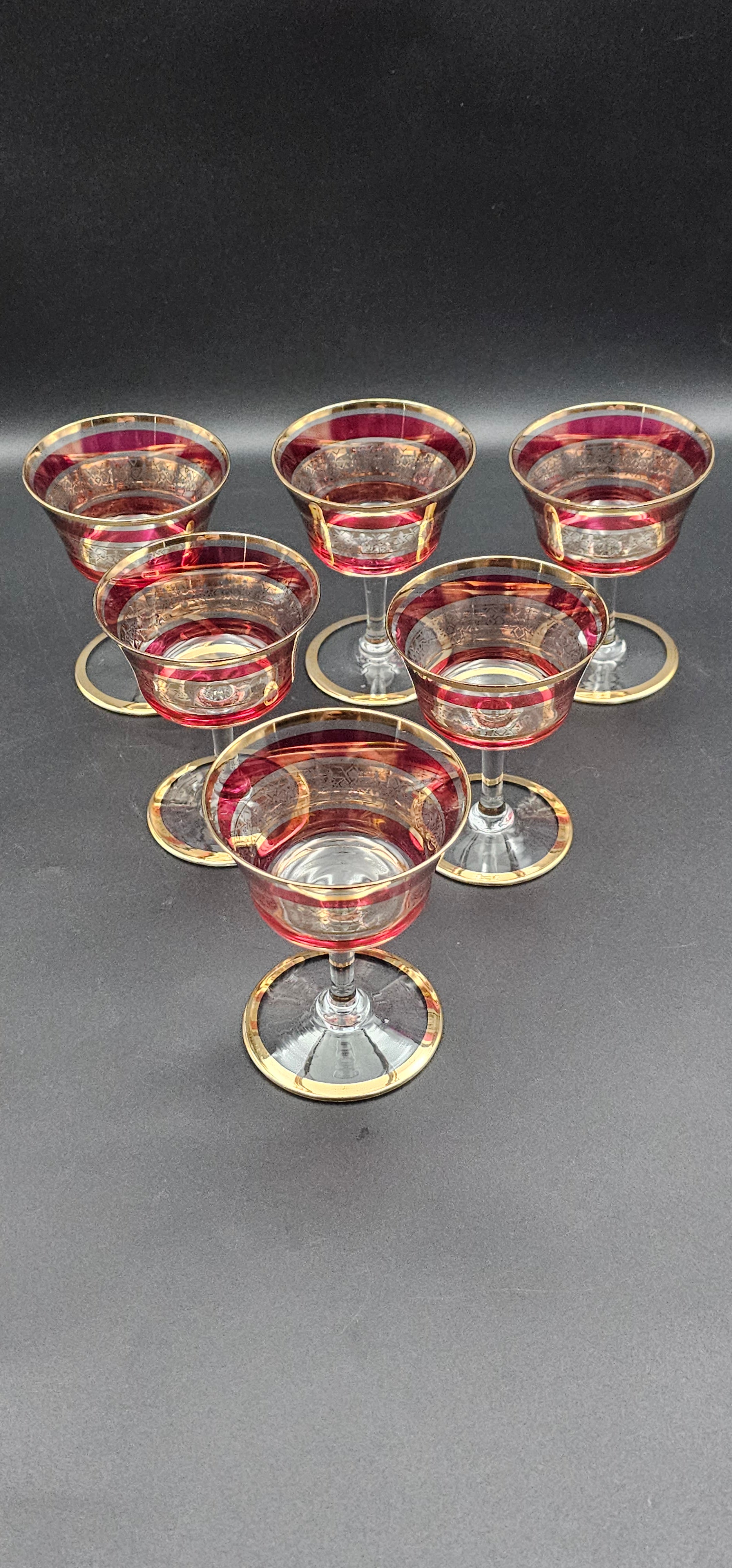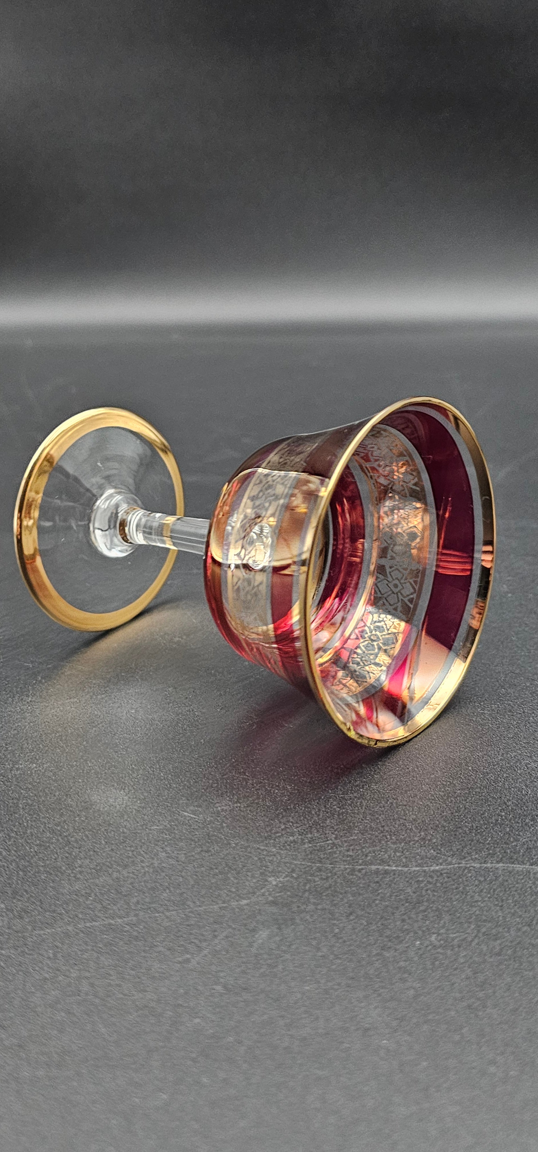 Set of 6 Small Crystal coupes with red and golden coloured detailing. 100ml 9.5cm tall