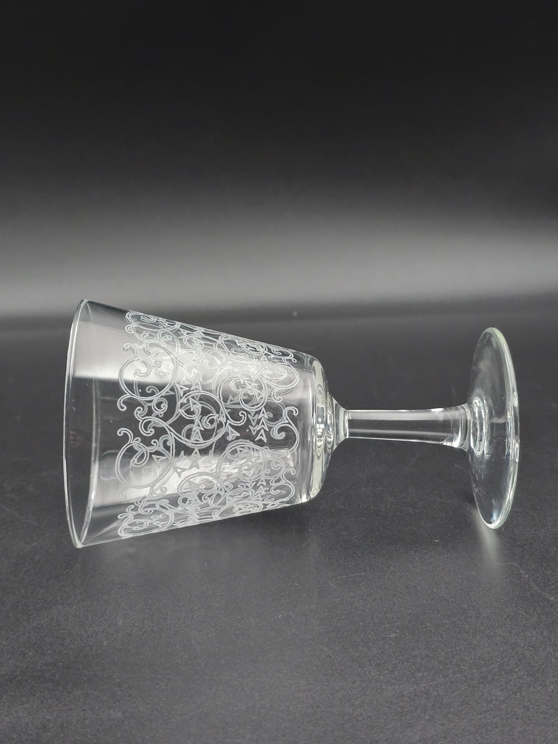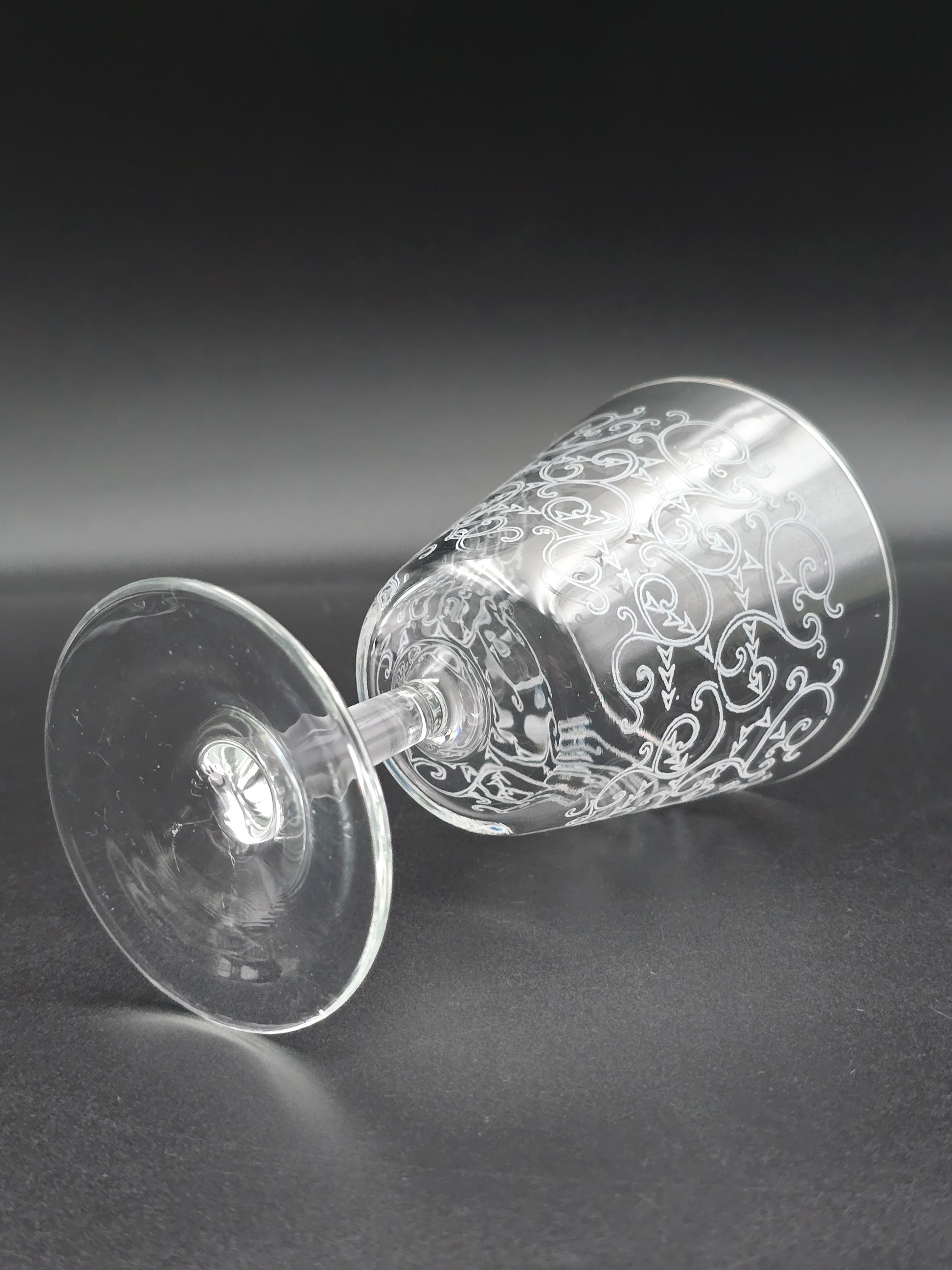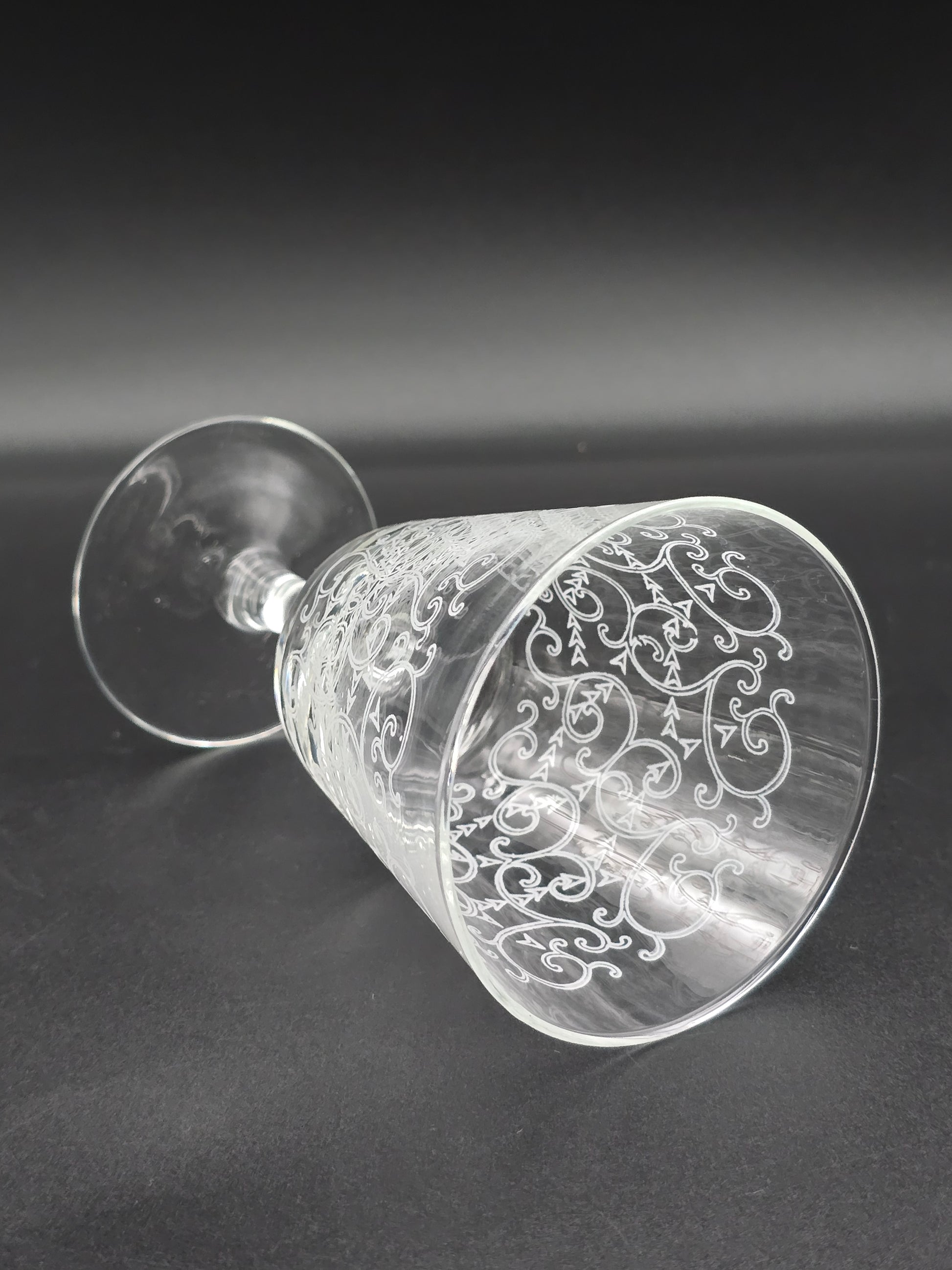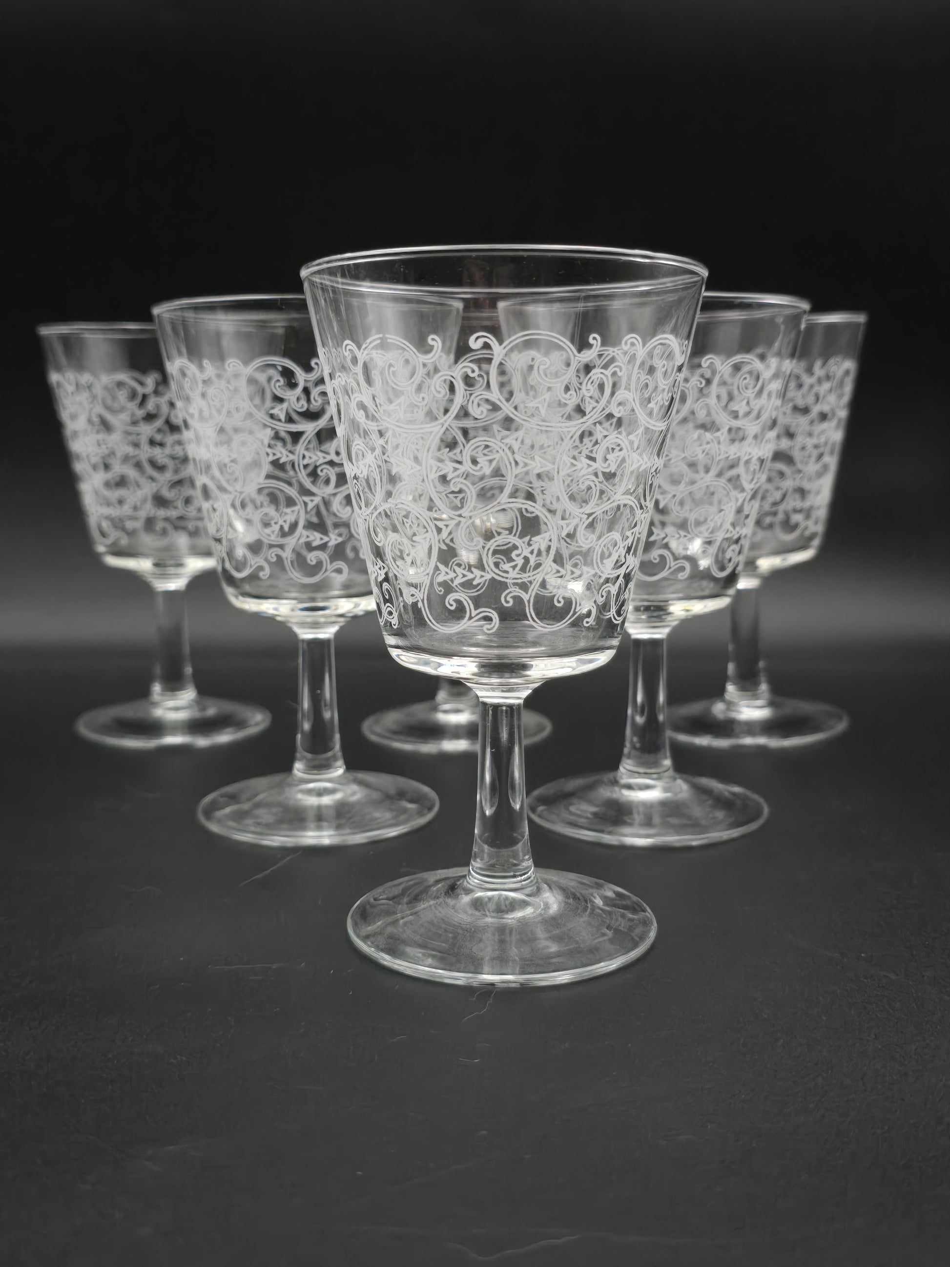 A charming set of six vintage etched glass wine goblets, featuring a delicate swirling design all around the bowl.