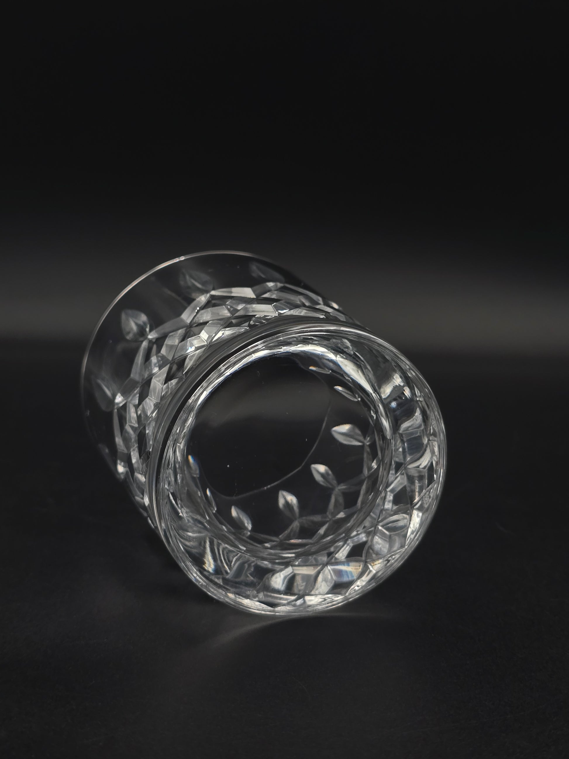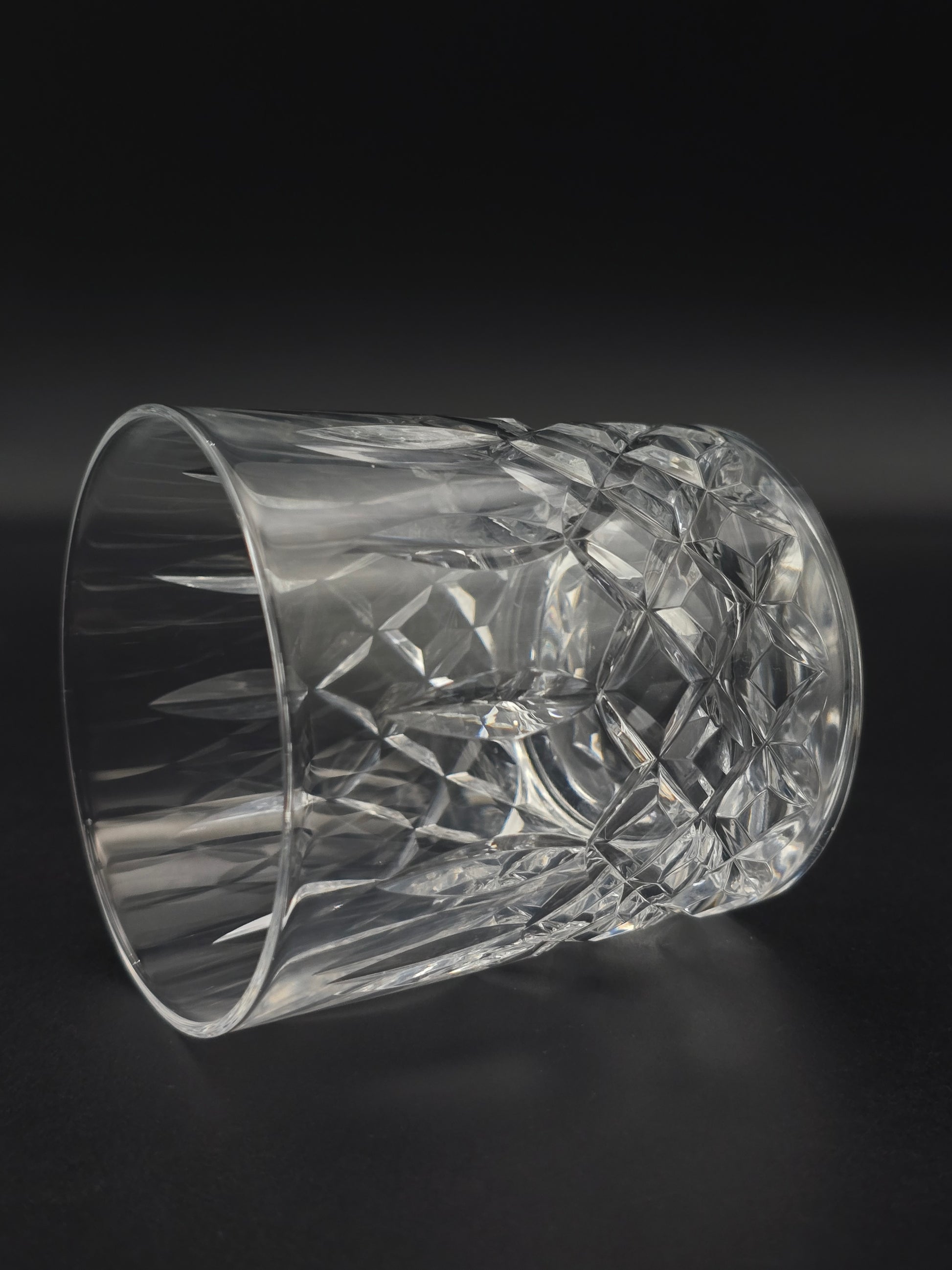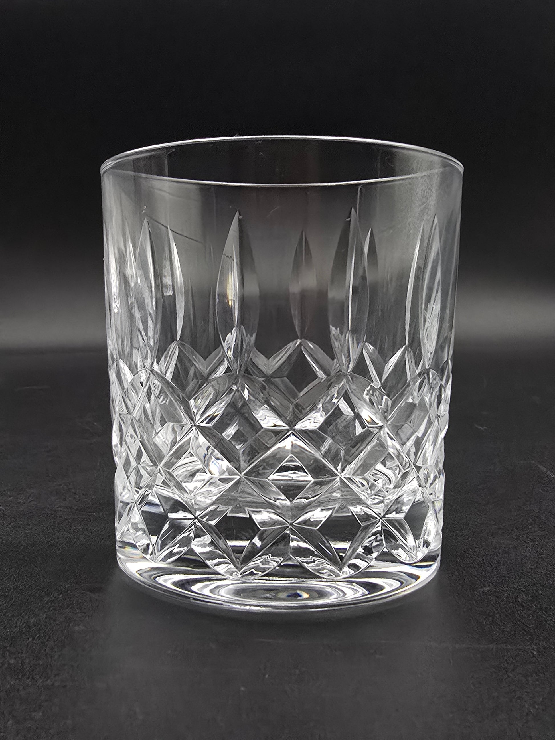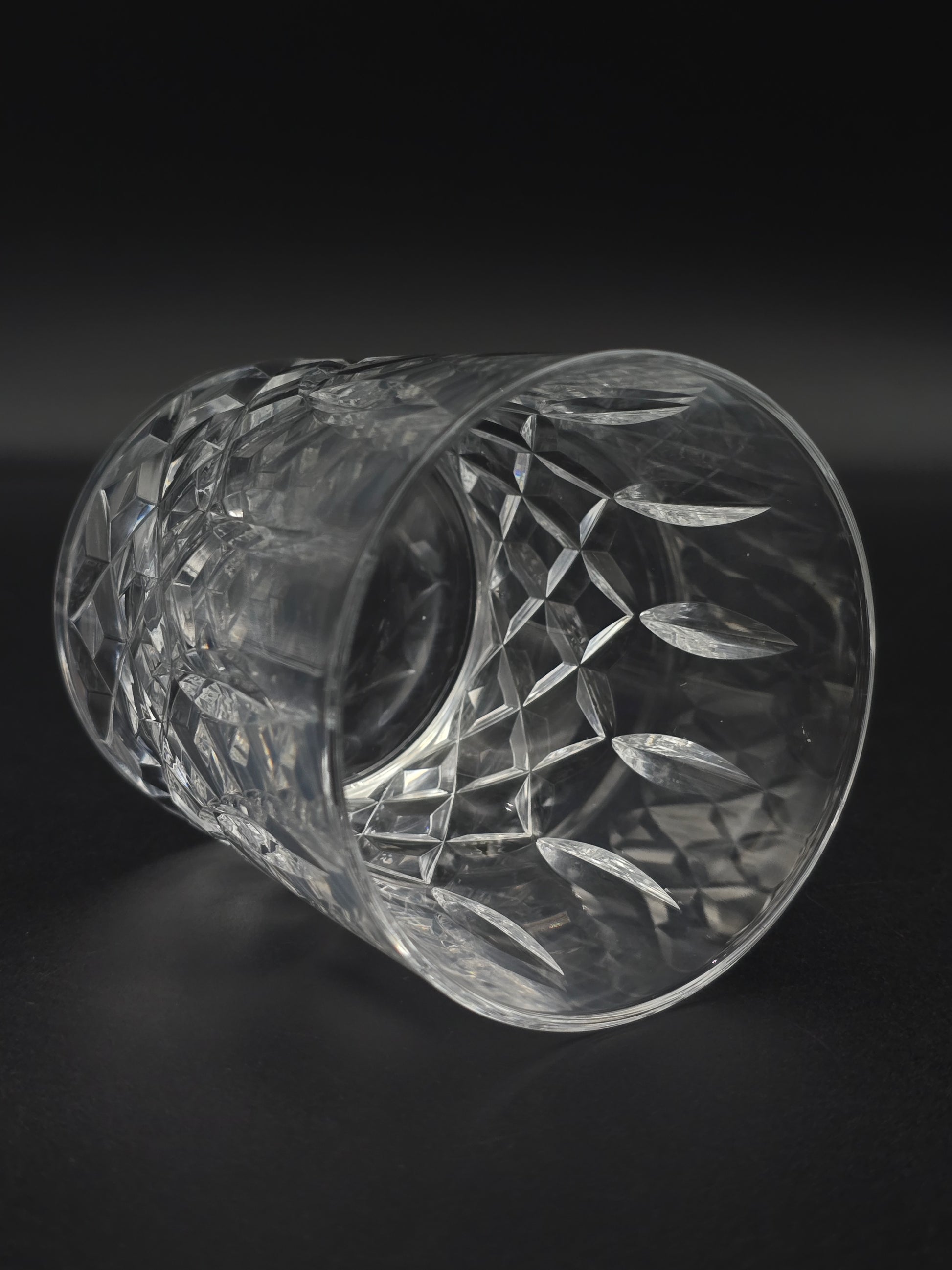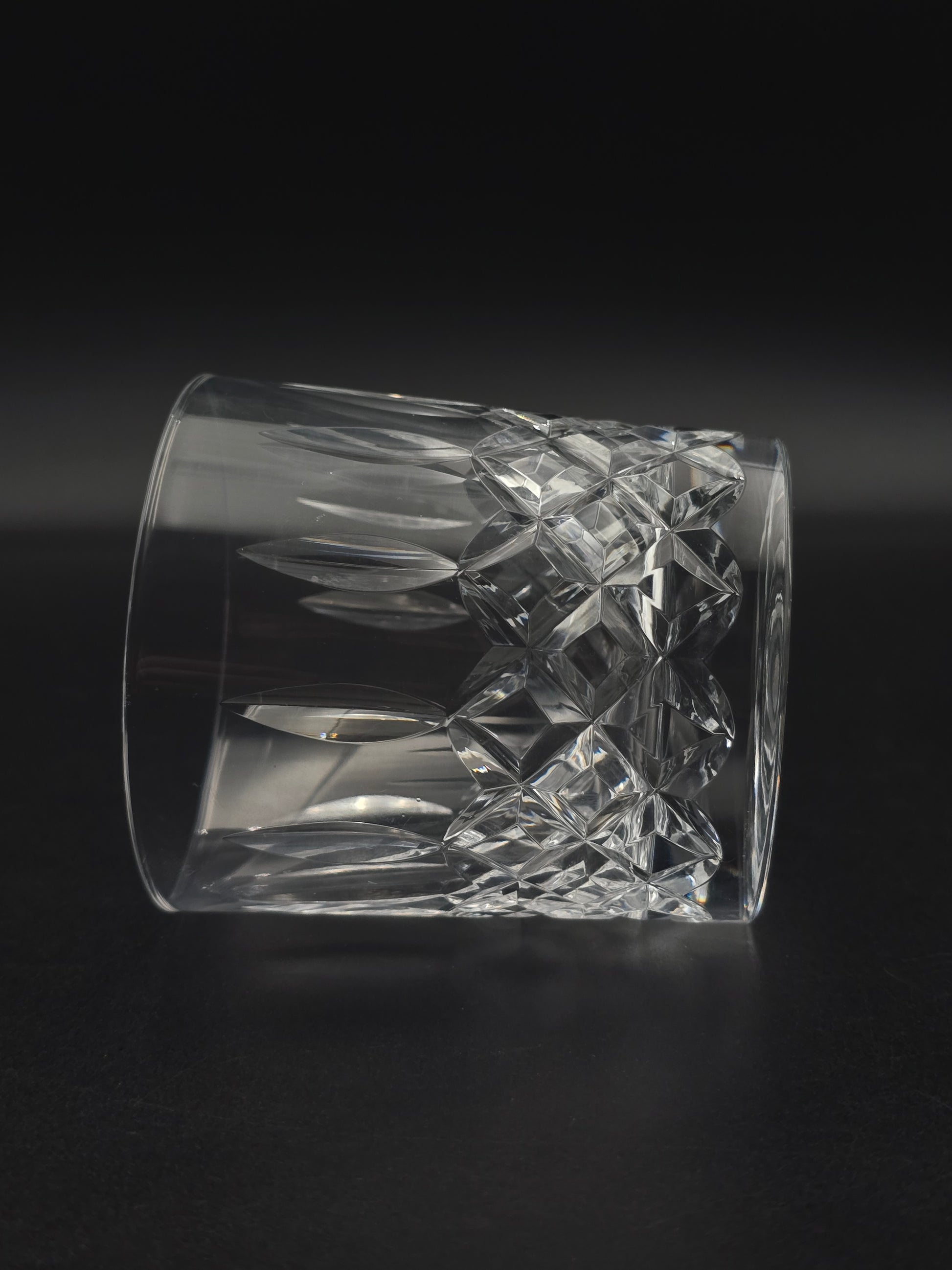 These weighty glasses feature a striking cross and flute cut pattern that catches and refracts light beautifully, lending an elegant sparkle to any table or bar setting.