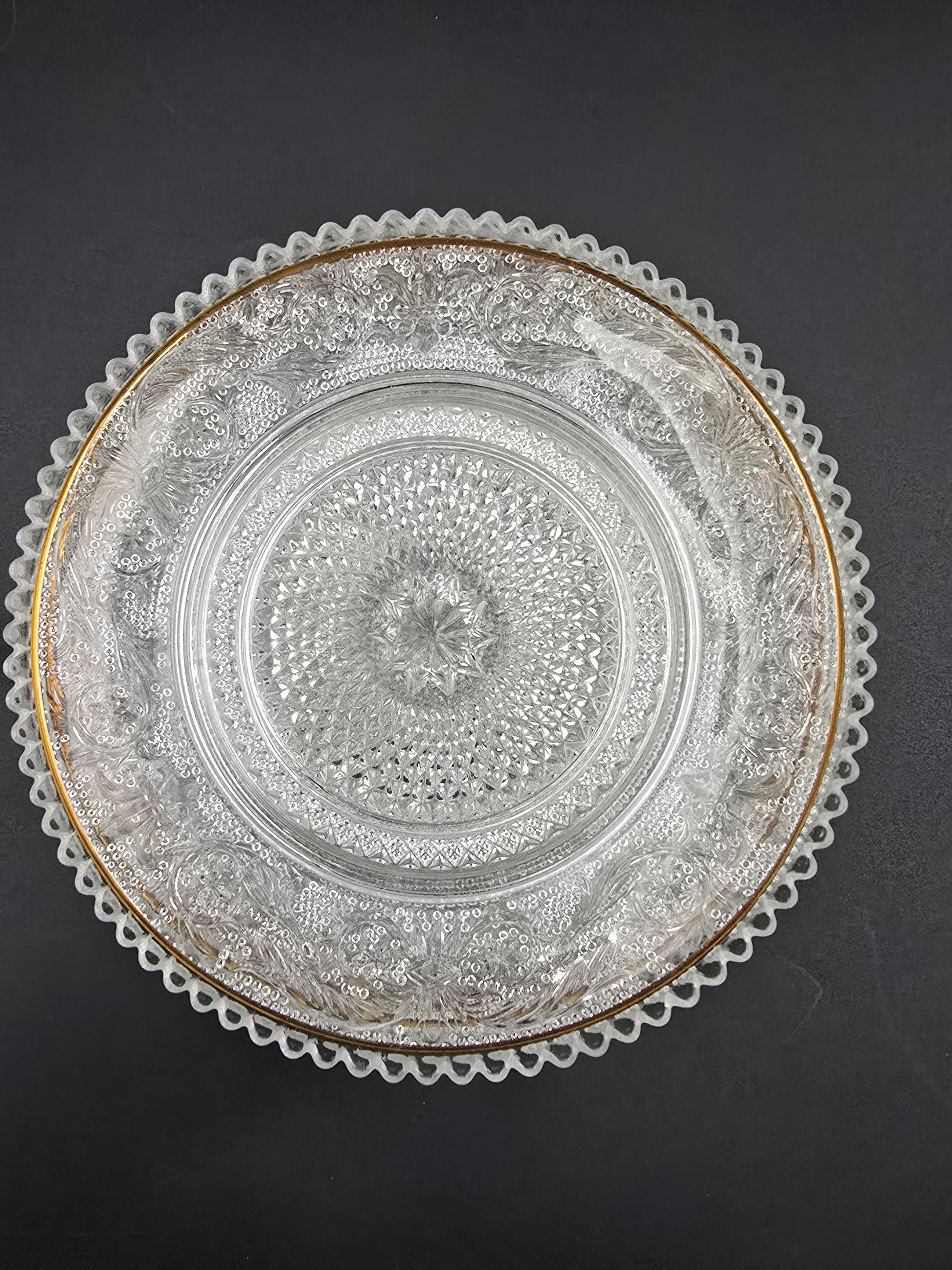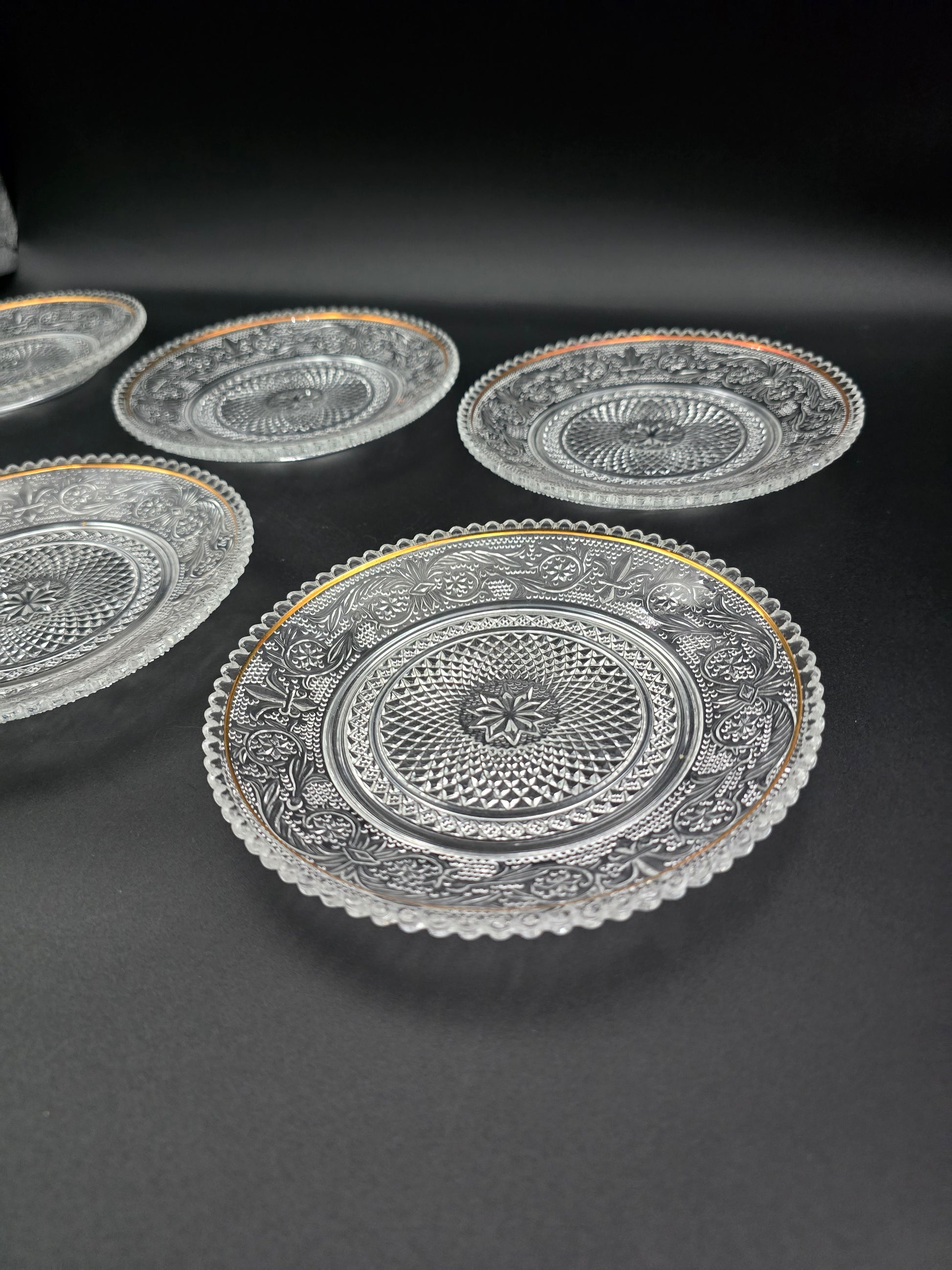 Enhance your dining experience with this set of 6 vintage pressed glass side plates. Each plate features a beautiful golden coloured banding, adding a touch of elegance to your table.