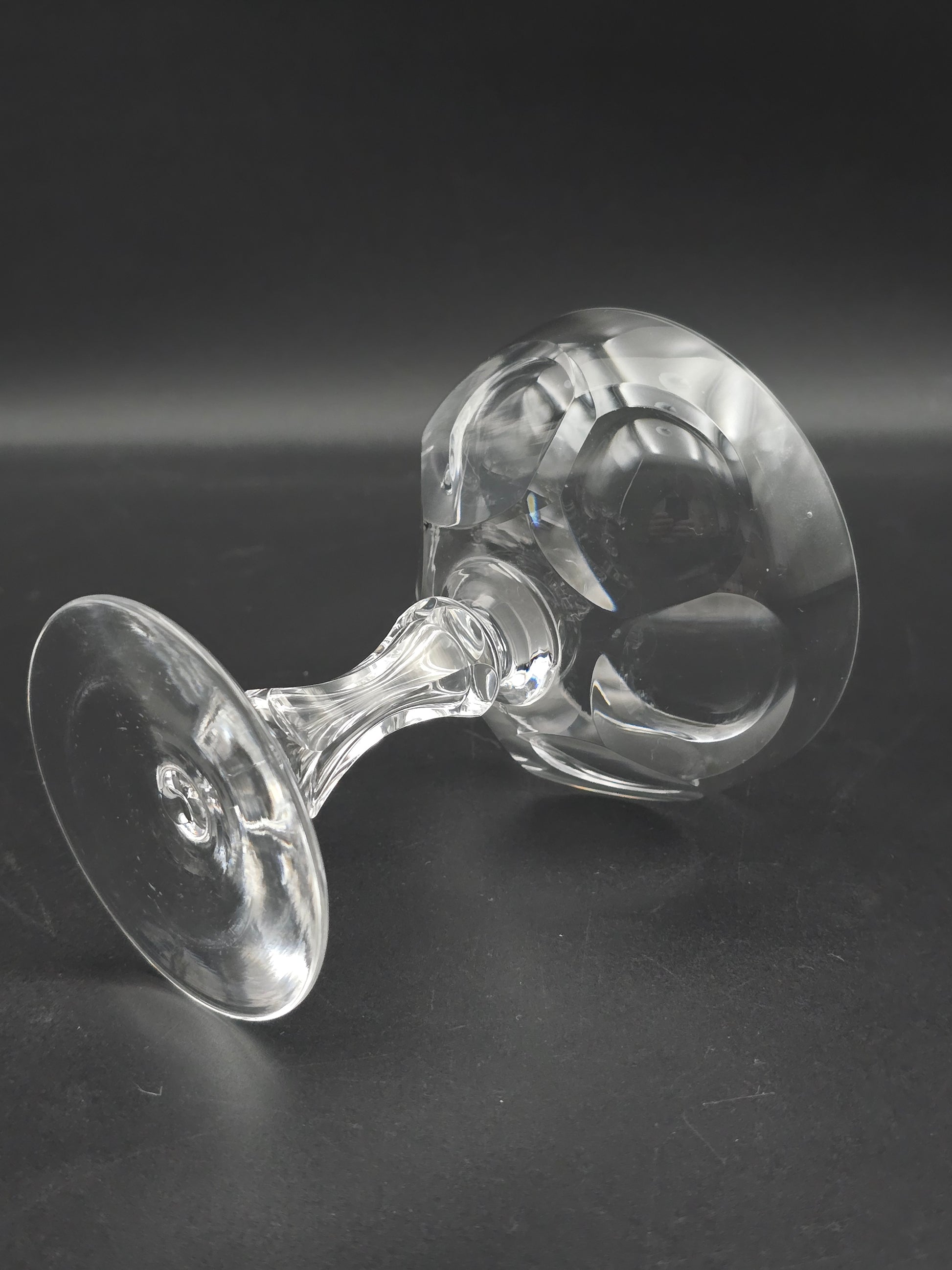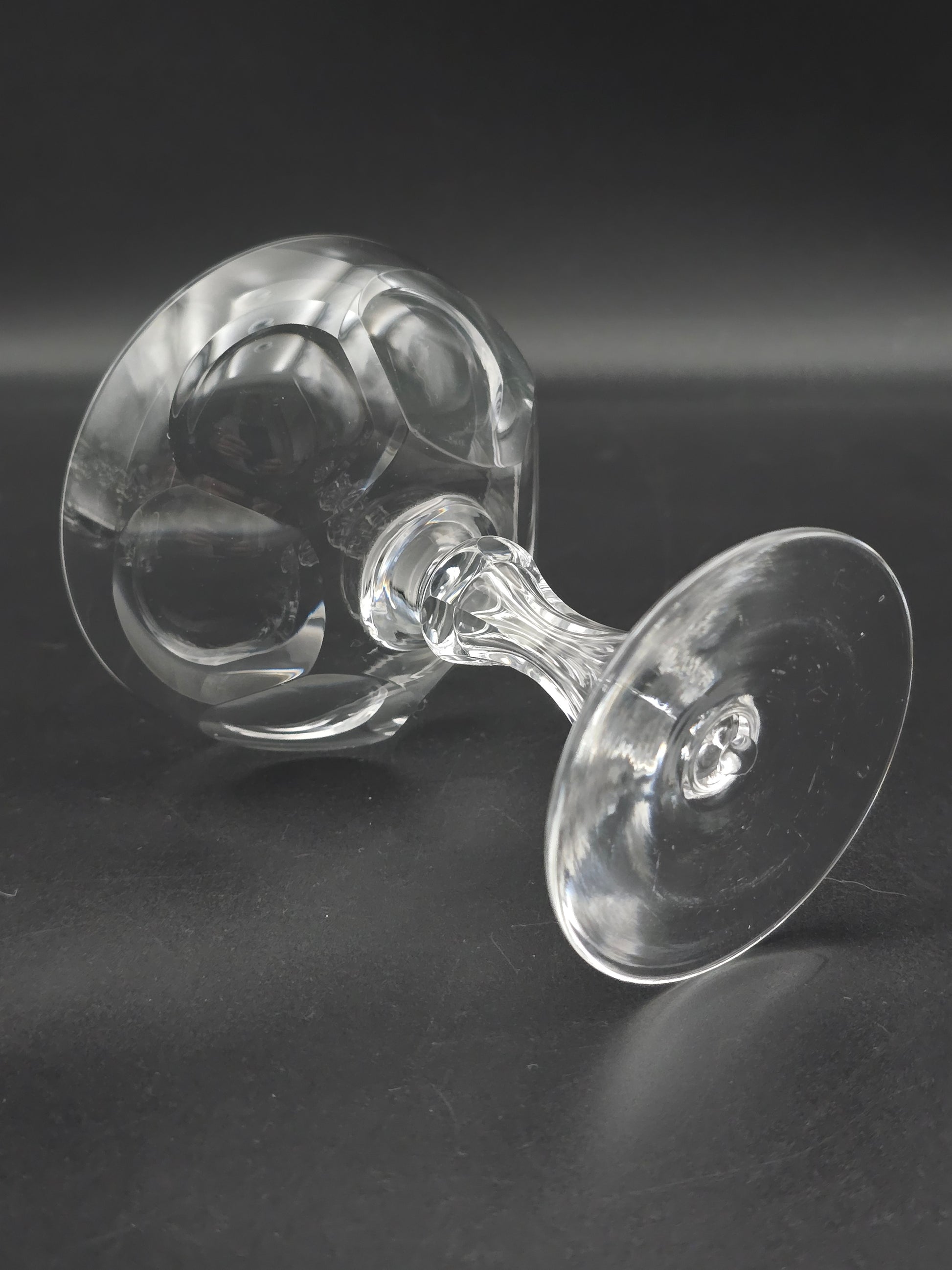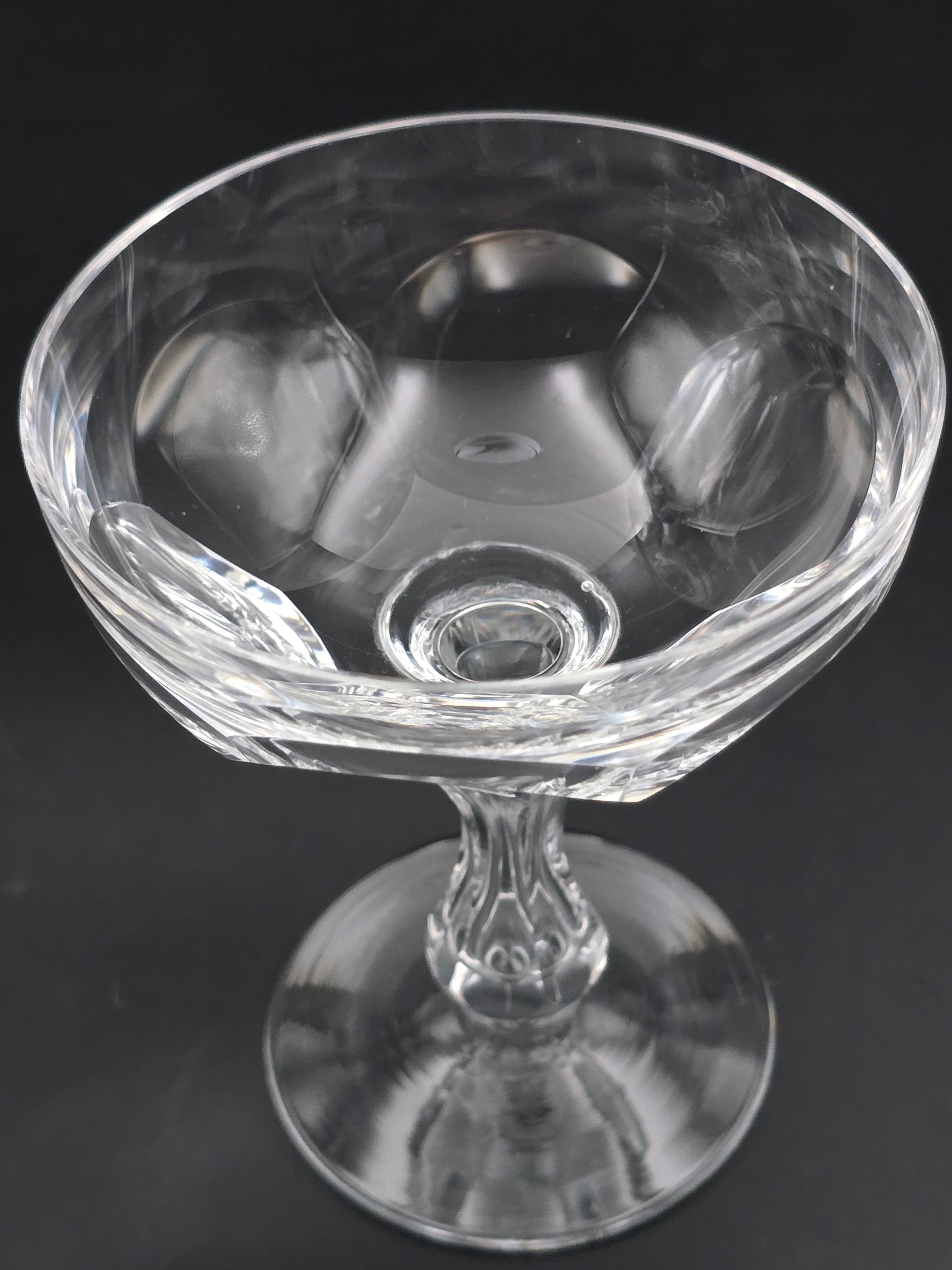 Each coupe features a stunning large thumbprint disc design on the bowl and a unique hexagonal tapered stem on a plain base.