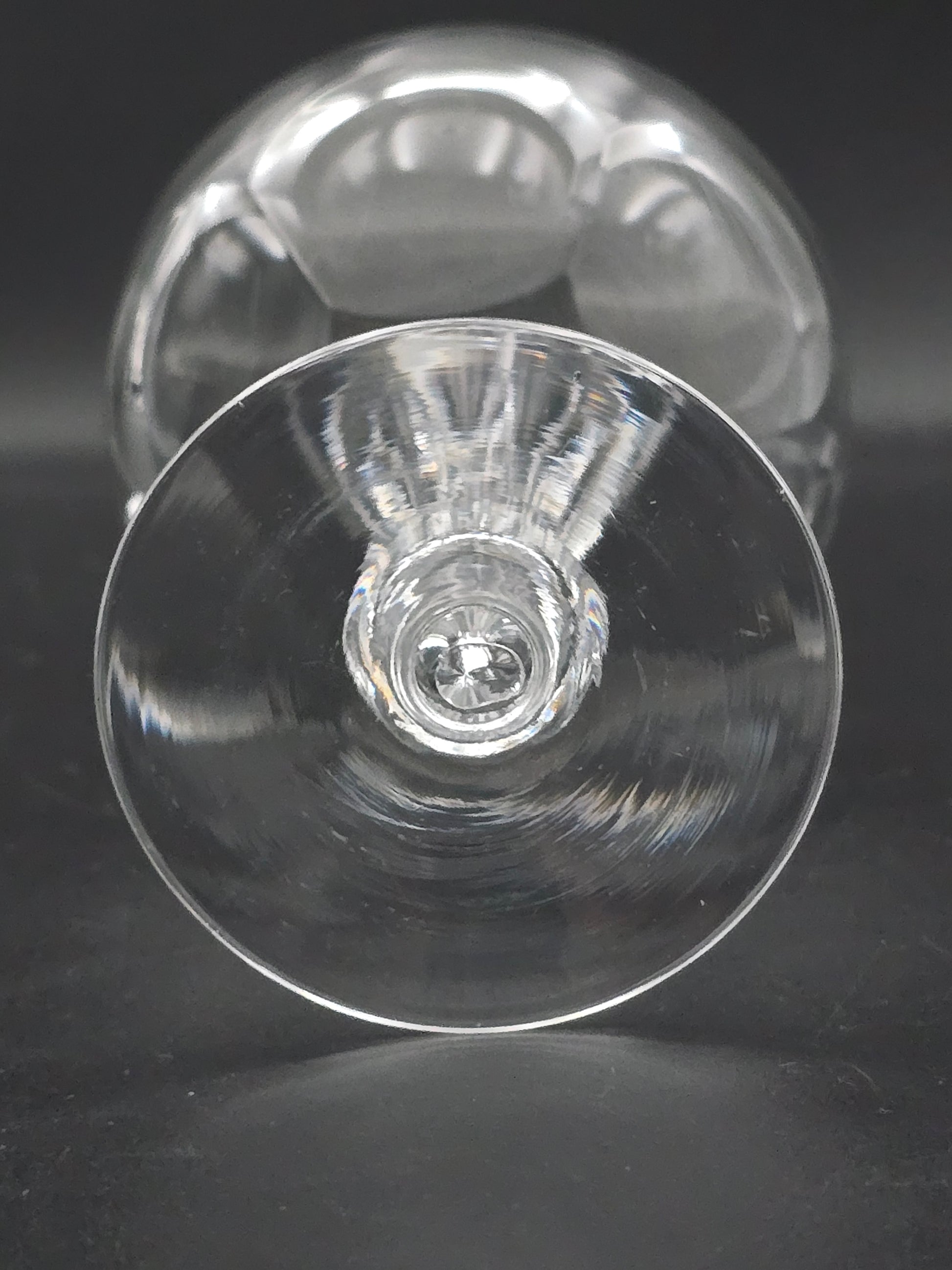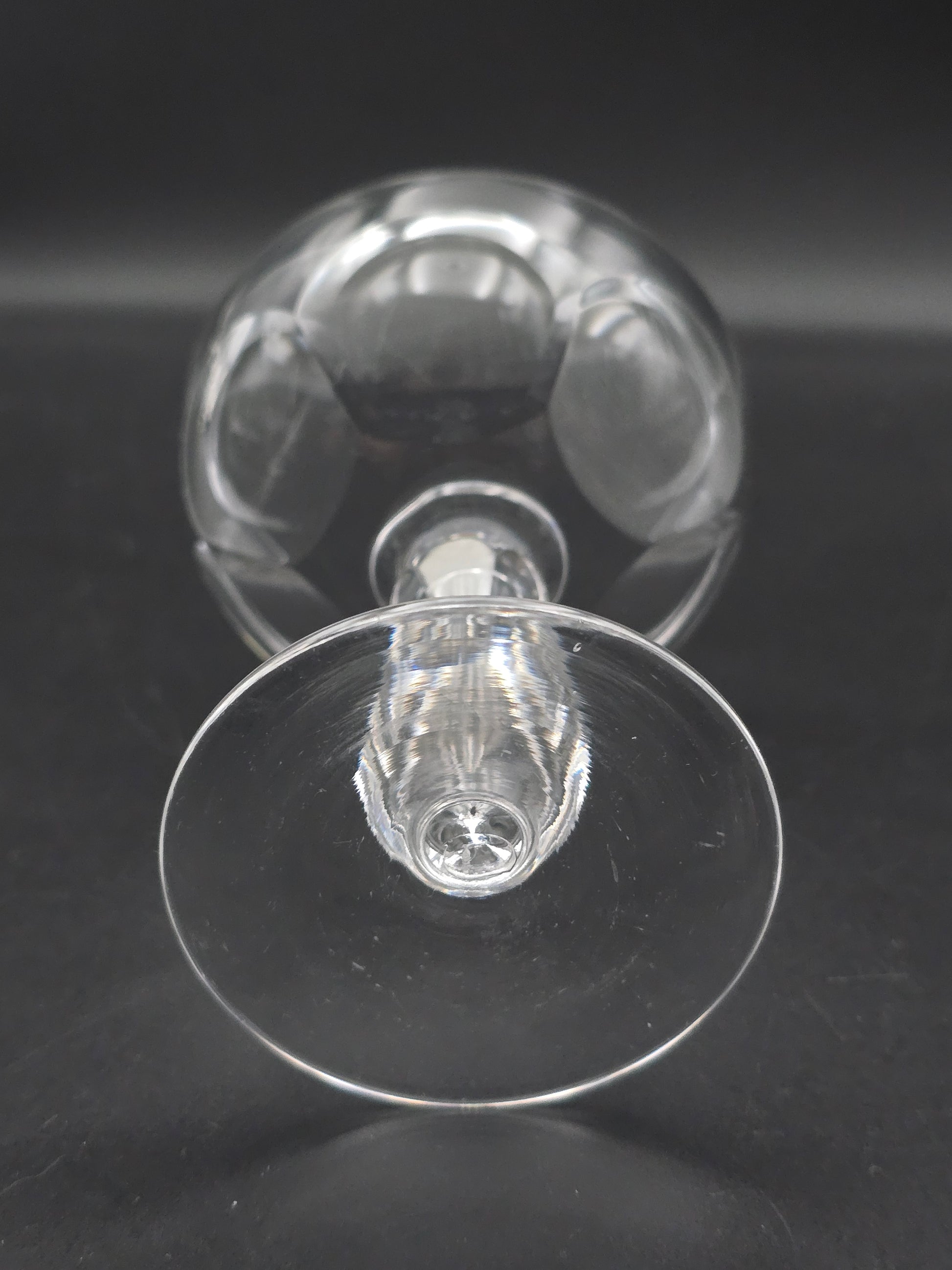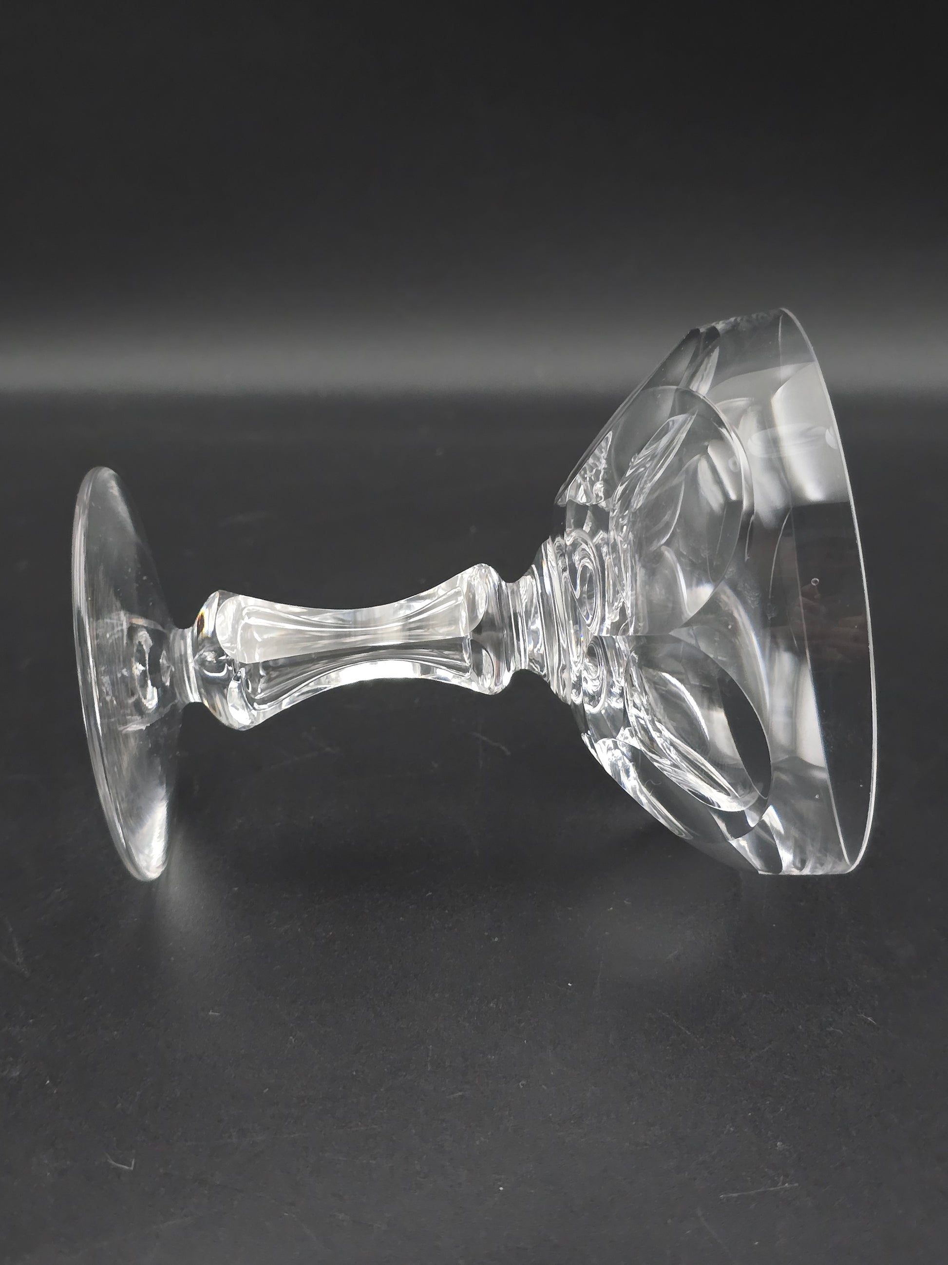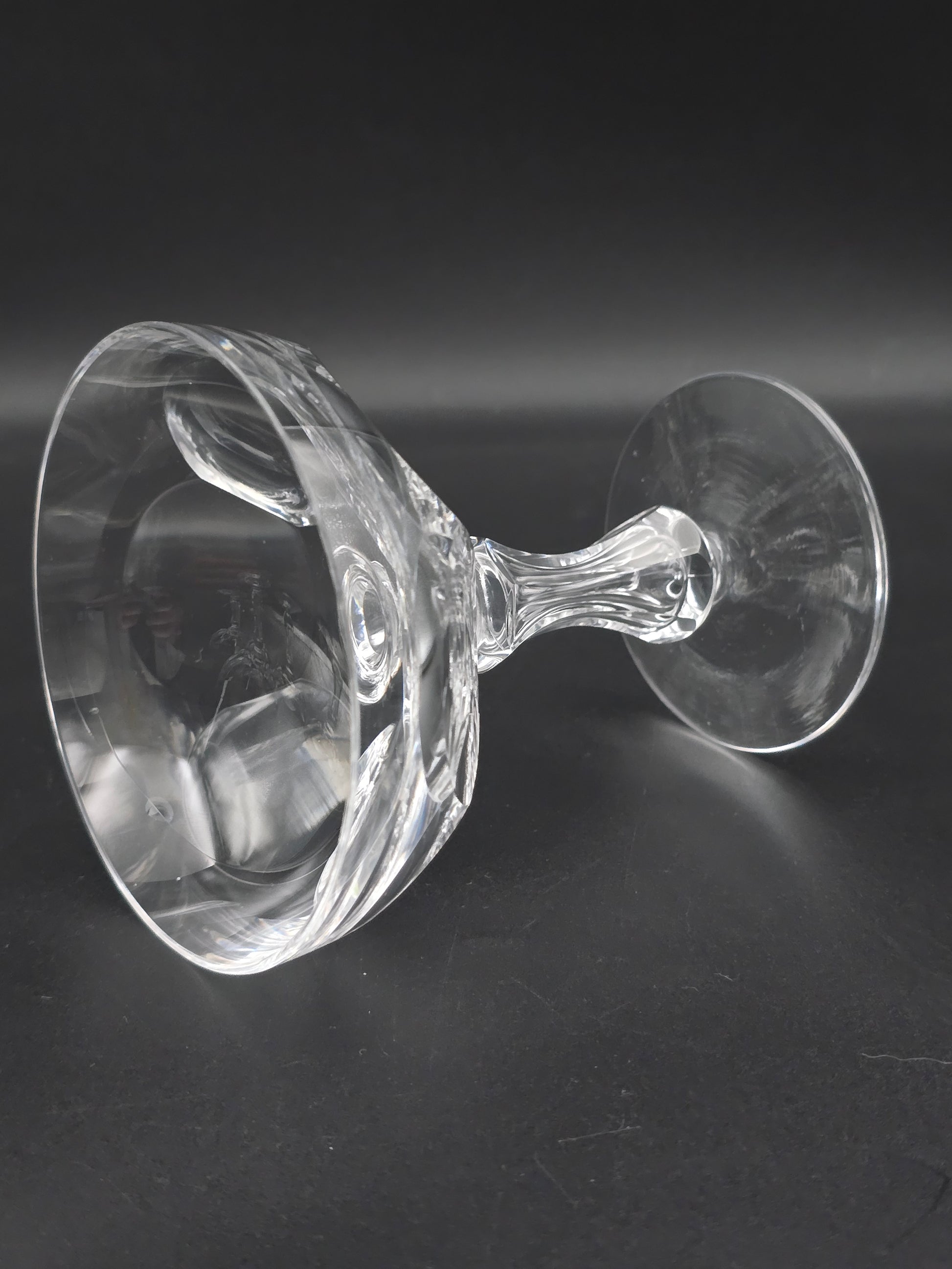 Each coupe features a stunning large thumbprint disc design on the bowl and a unique hexagonal tapered stem on a plain base.